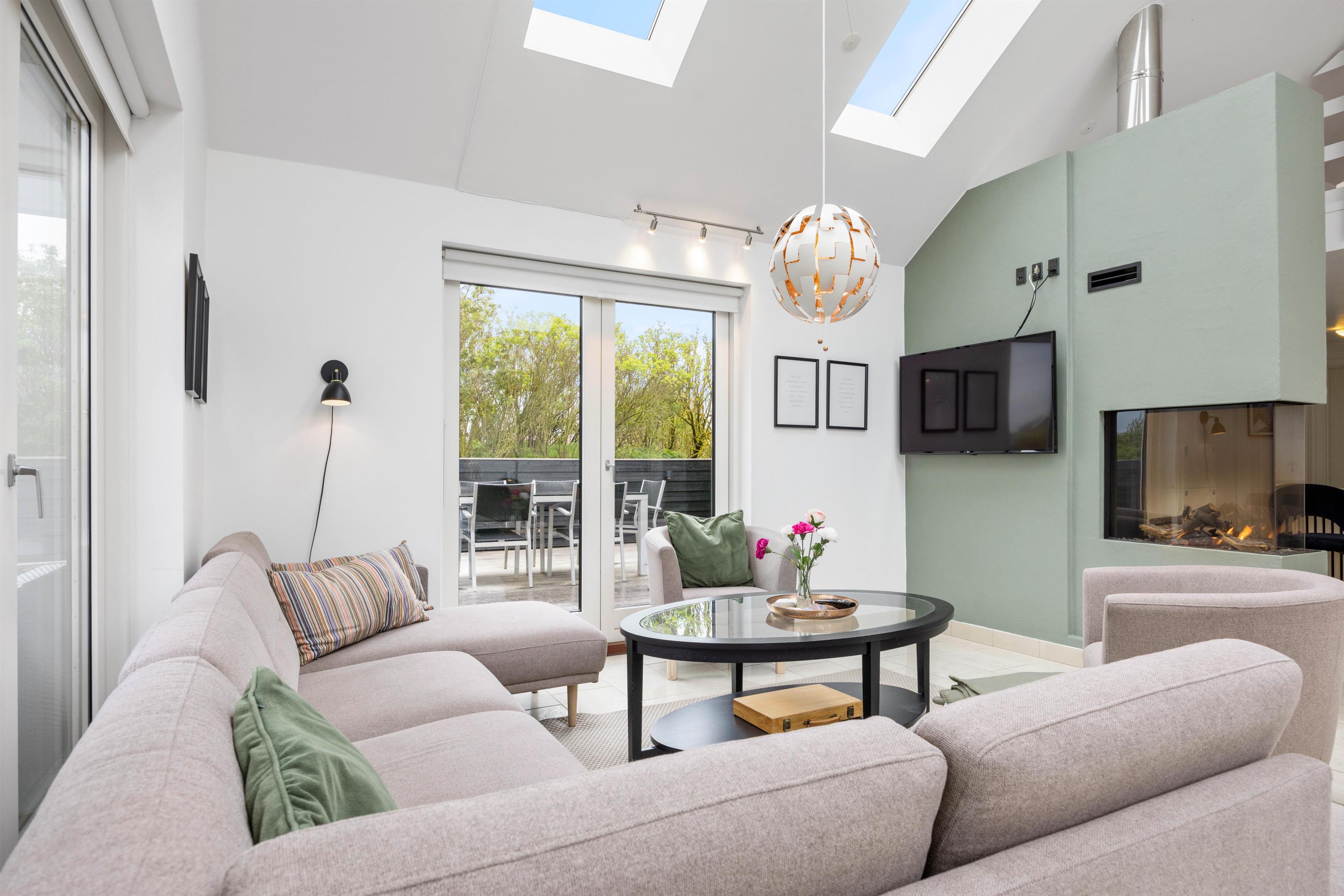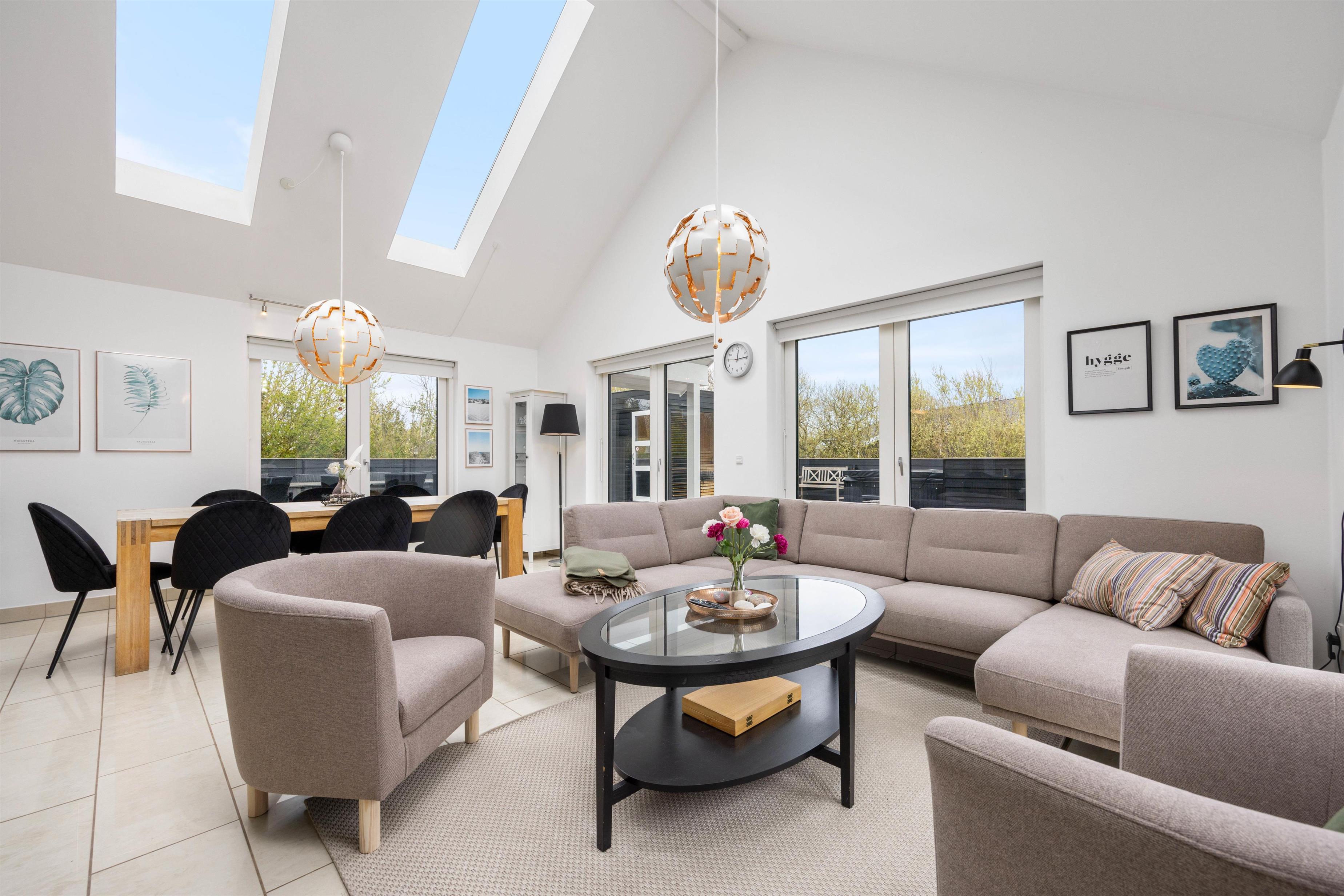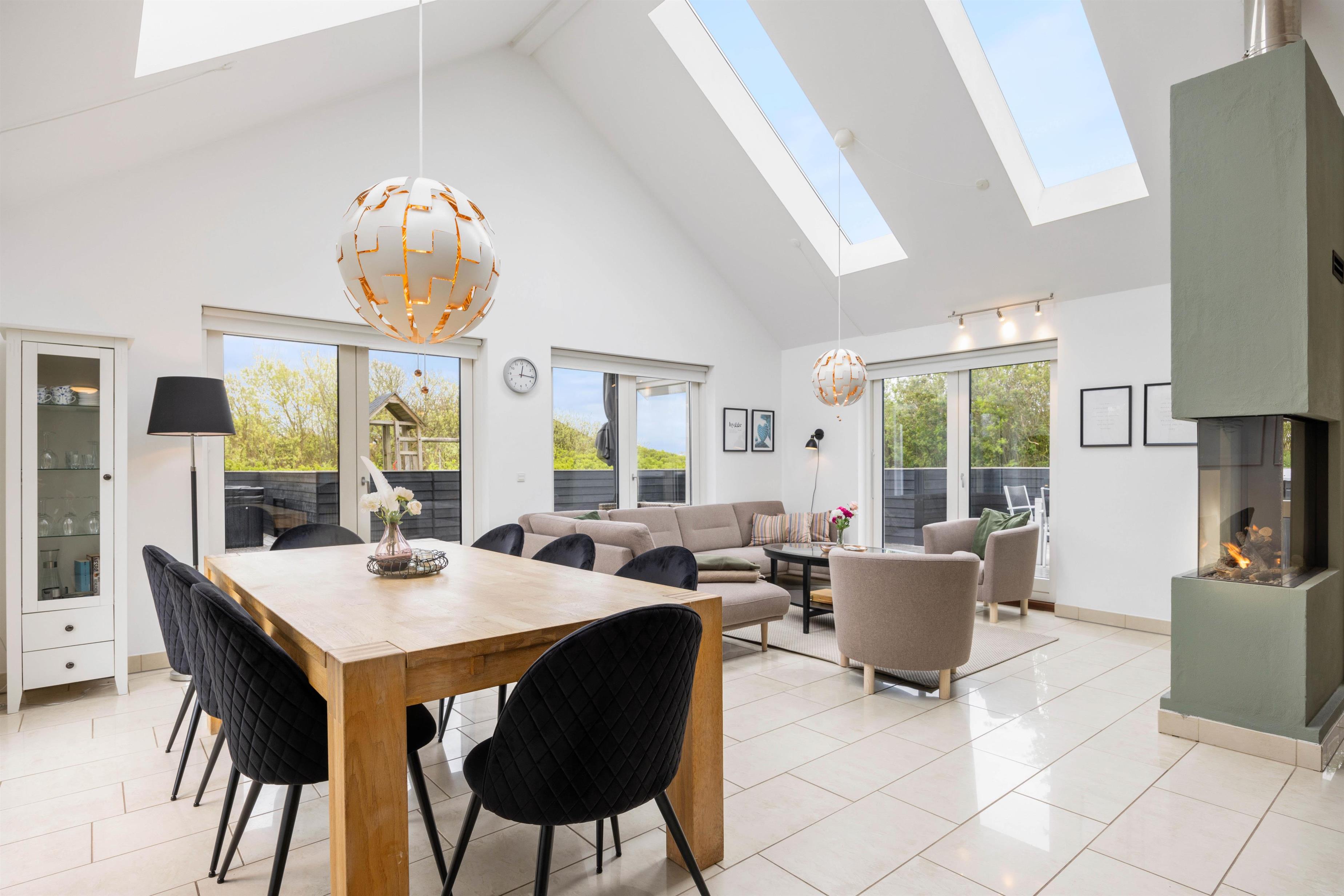 Køkken og stue er forbundet i ét stort fællesrum, hvor I kan bruge mange hyggelige timer sammen. Den flotte gasovn sørger for god varme selv på de køligste feriedage, og de store ovenlysvinduer lader solens lys trænge indenfor og åbner rummet endnu mere op.