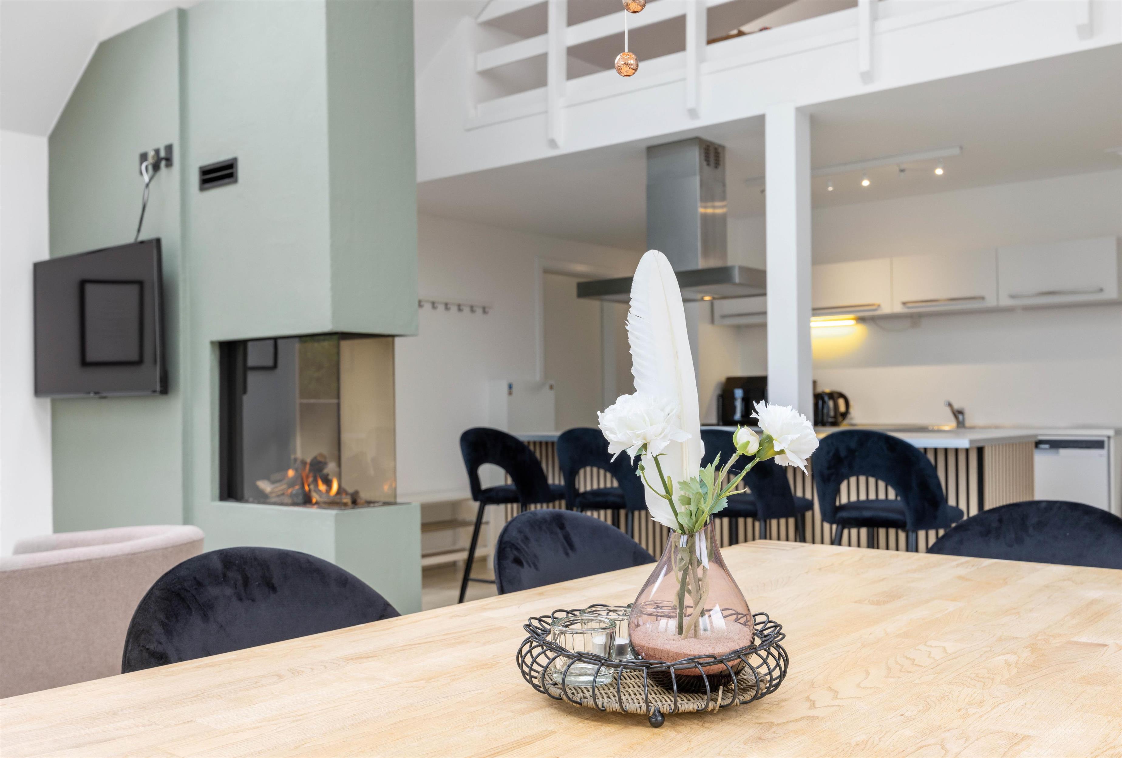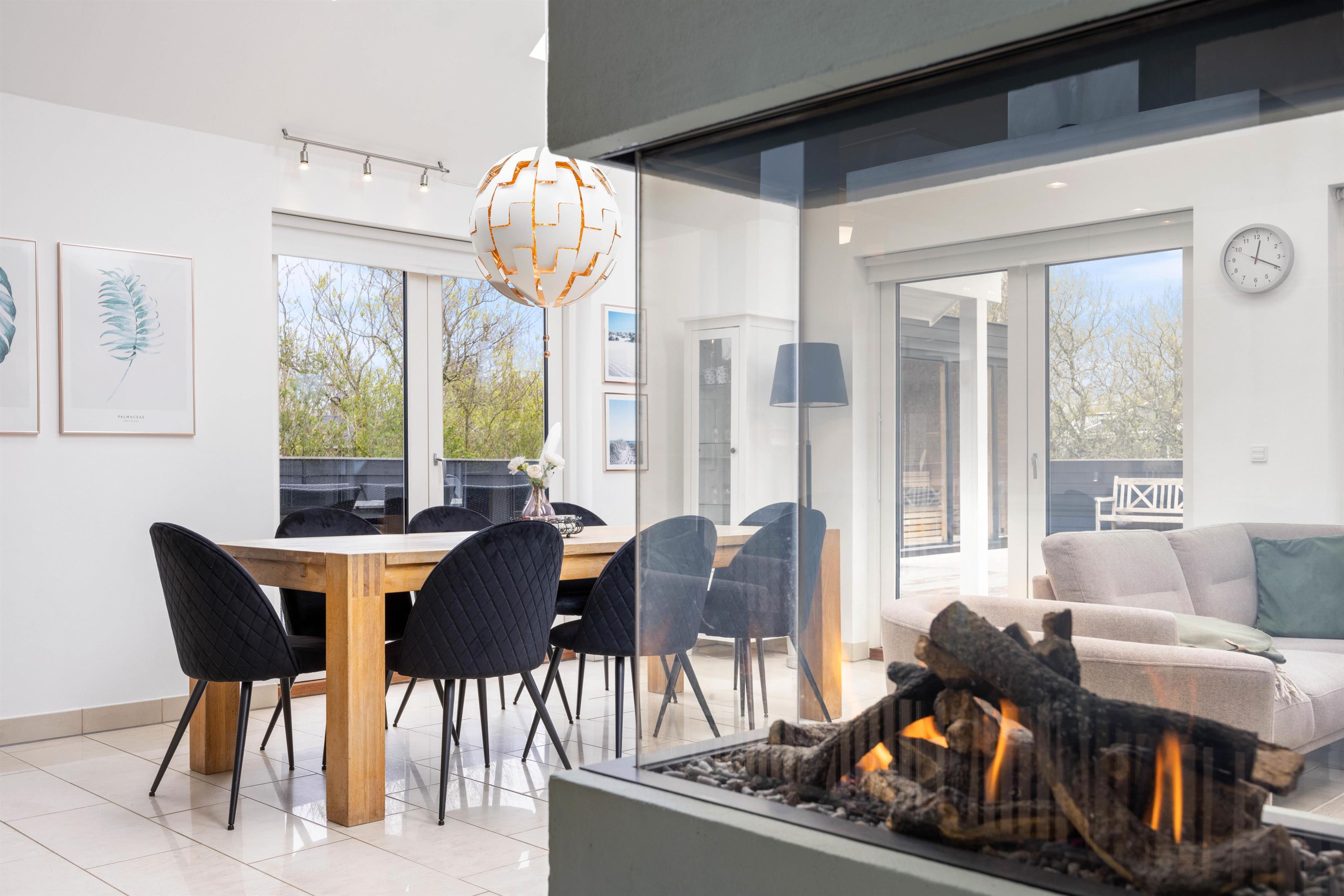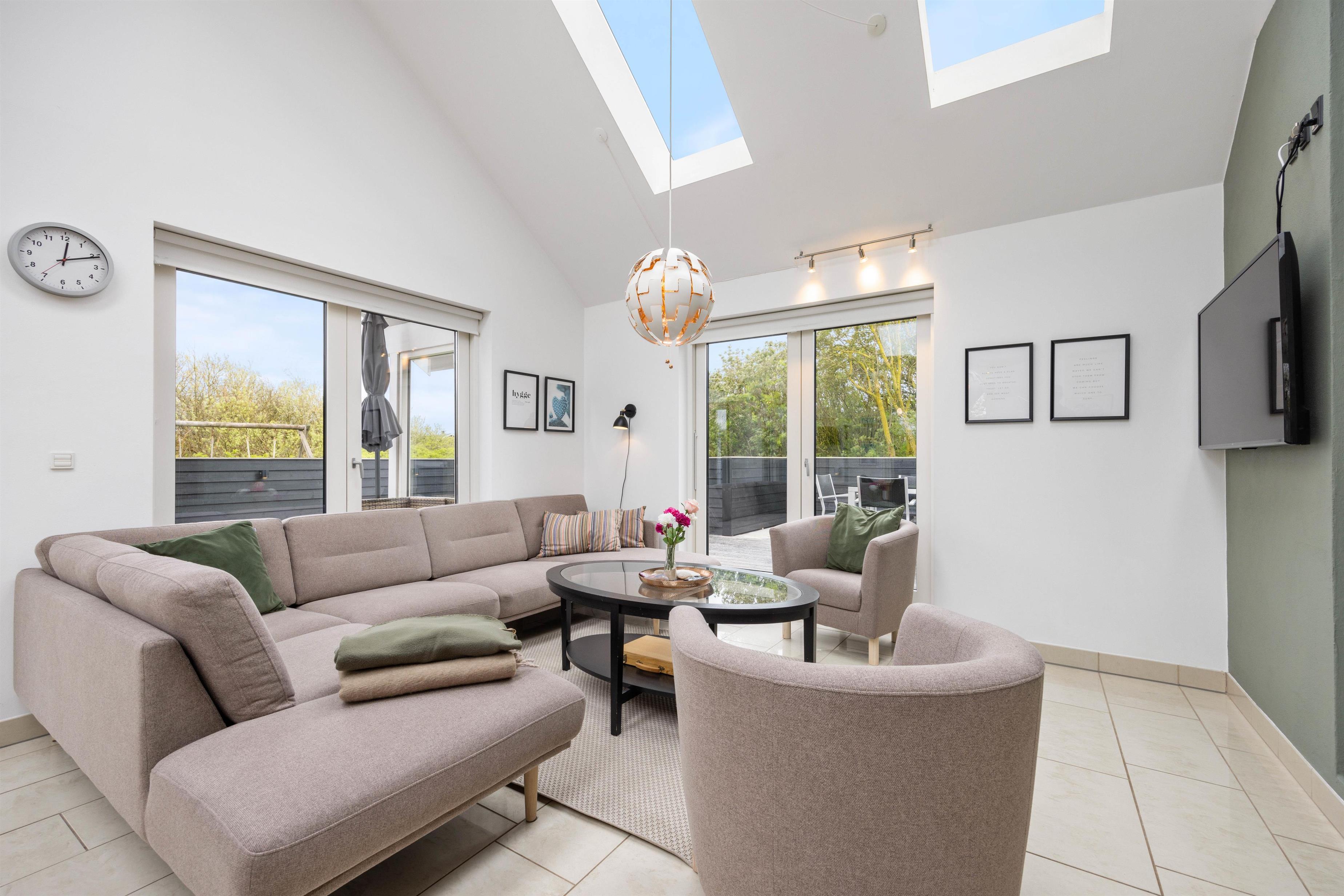 Køkken og stue er forbundet i ét stort fællesrum, hvor I kan bruge mange hyggelige timer sammen. Den flotte gasovn sørger for god varme selv på de køligste feriedage, og de store ovenlysvinduer lader solens lys trænge indenfor og åbner rummet endnu mere op.