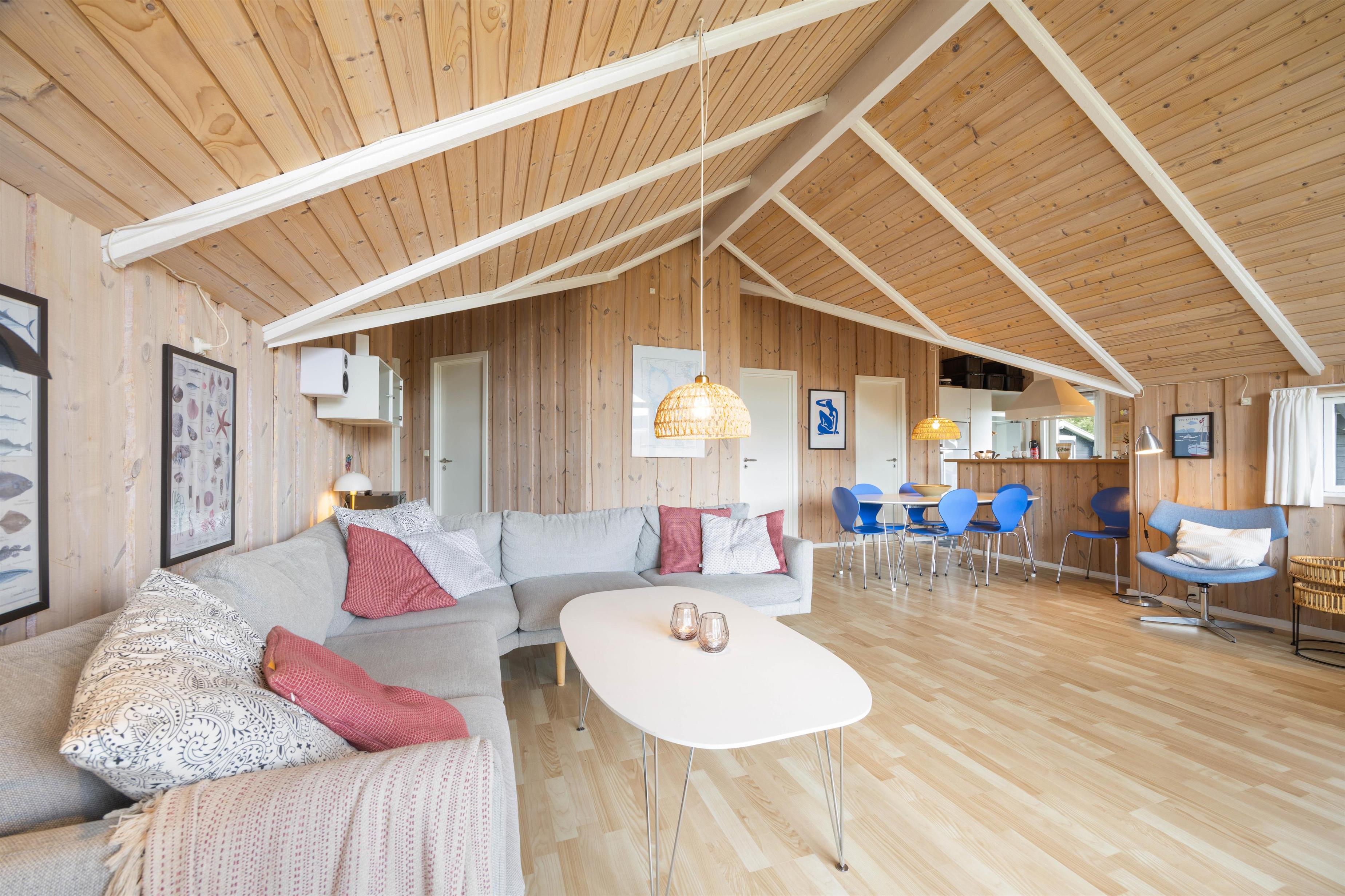 Feriehuset er indbydende og moderne indrettet, og de lyse lofter og gulve skaber en lys og venlig atmosfære og giver samtidig en følelse af rummelighed. Den store hjørnesofa indbyder til afslapning på langs med en dejlig udsigt til uderummet genmem det store vinduesparti, der er placeret på husets endegavl.