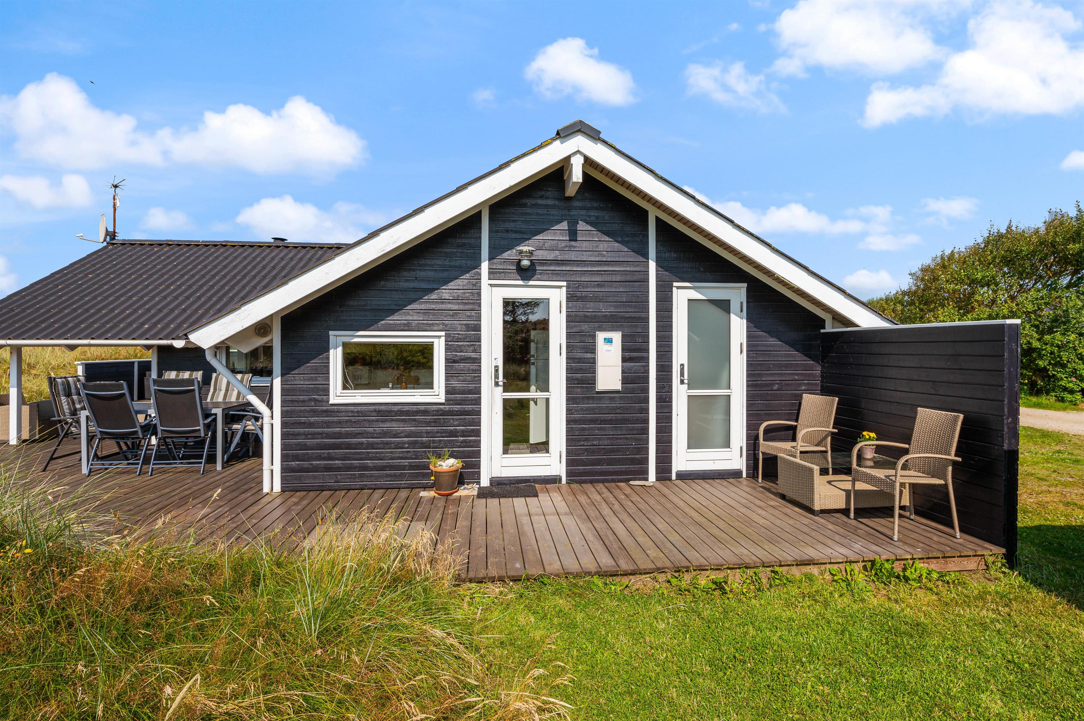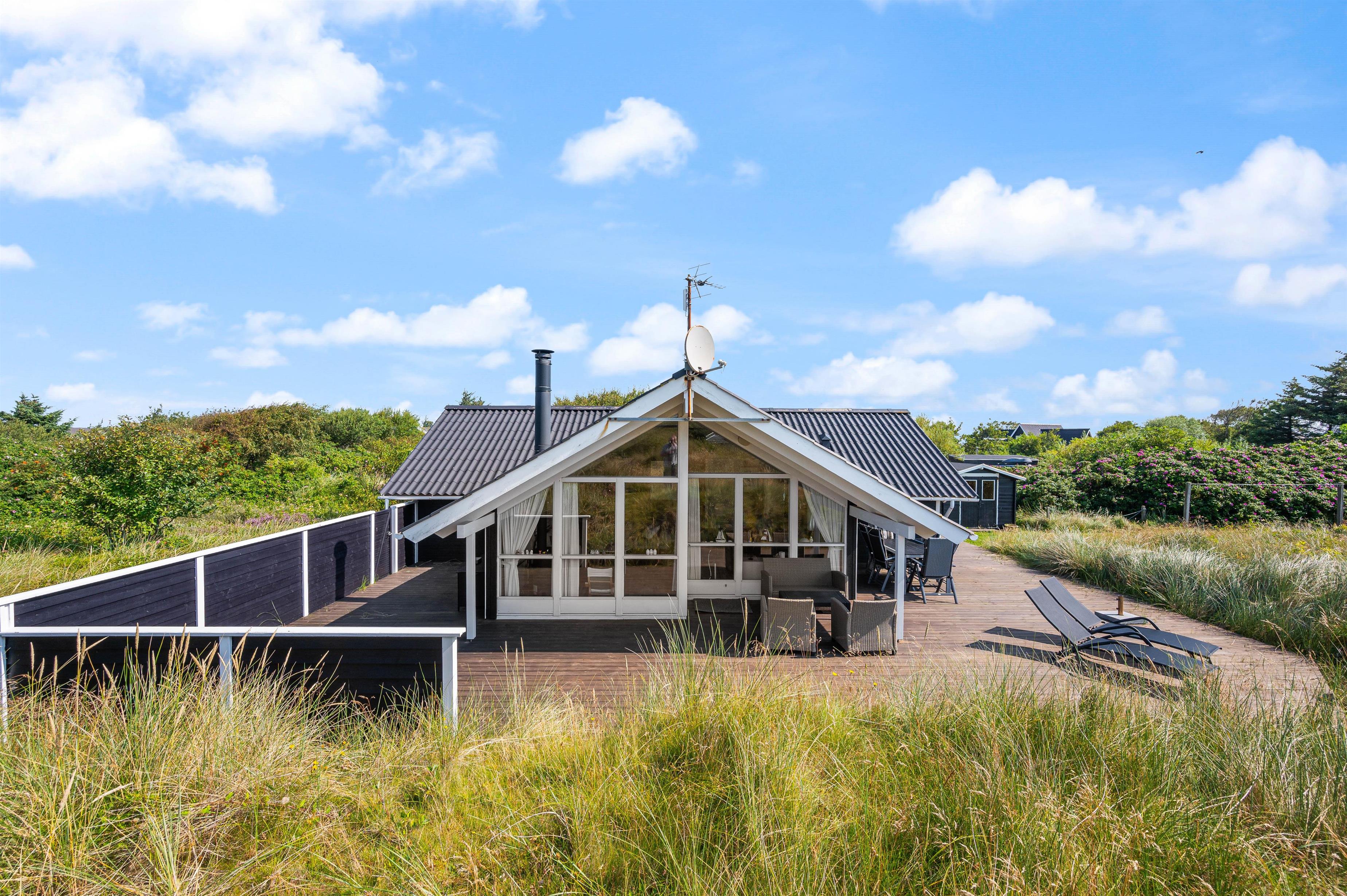 Når vi holder ferie i et sommerhus, så har inde- og udelivet en tendens til at flyde sammen. Vi tiltrækkes af den friske luft og den smukke natur, og på en ferie ved Vesterhavet og i Haurvig er det bestemt ingen undtagelse. Til dette feriehus hører derfor også et rigtigt dejligt terrasseområde, som inviterer til hygge med familien i den friske natur. En del af terrassen er let overdækket, så du kan trække lidt i læ, hvis vejret kræver det. Samtidig er der anlagt terrasse fra flere vinkler, så du har mulighed for at rykke i læ og sol. Til terrassen hører naturligvis gode havemøbler, liggestole og grill. Perfekt til hyggelige grillaftener med gode venner og familie.