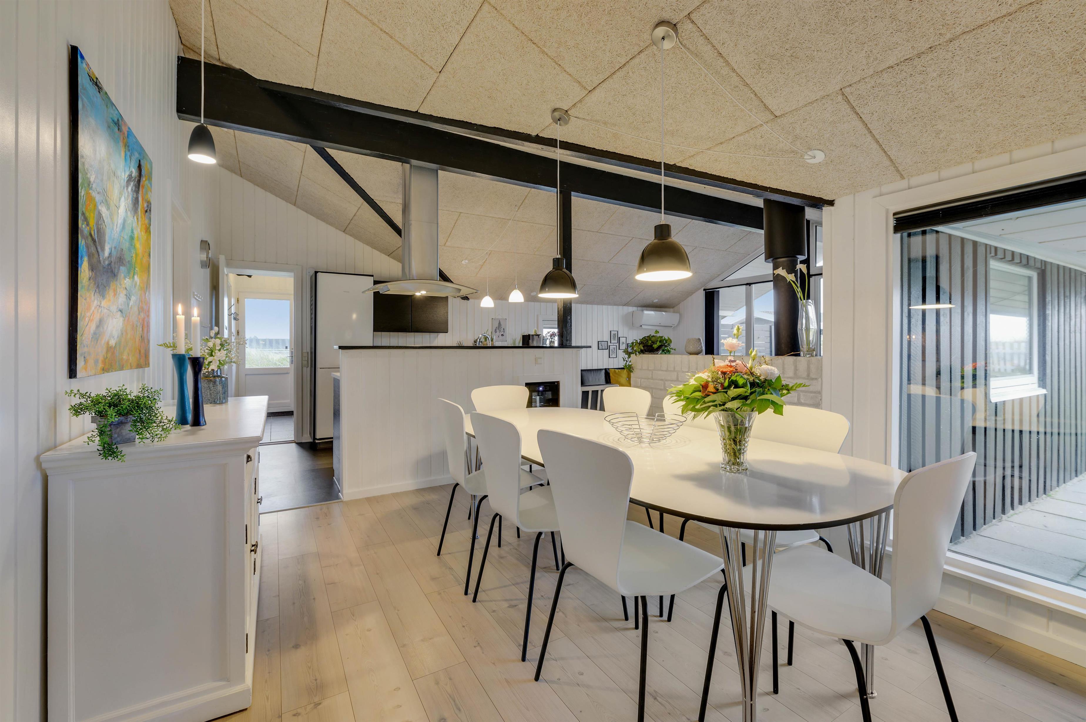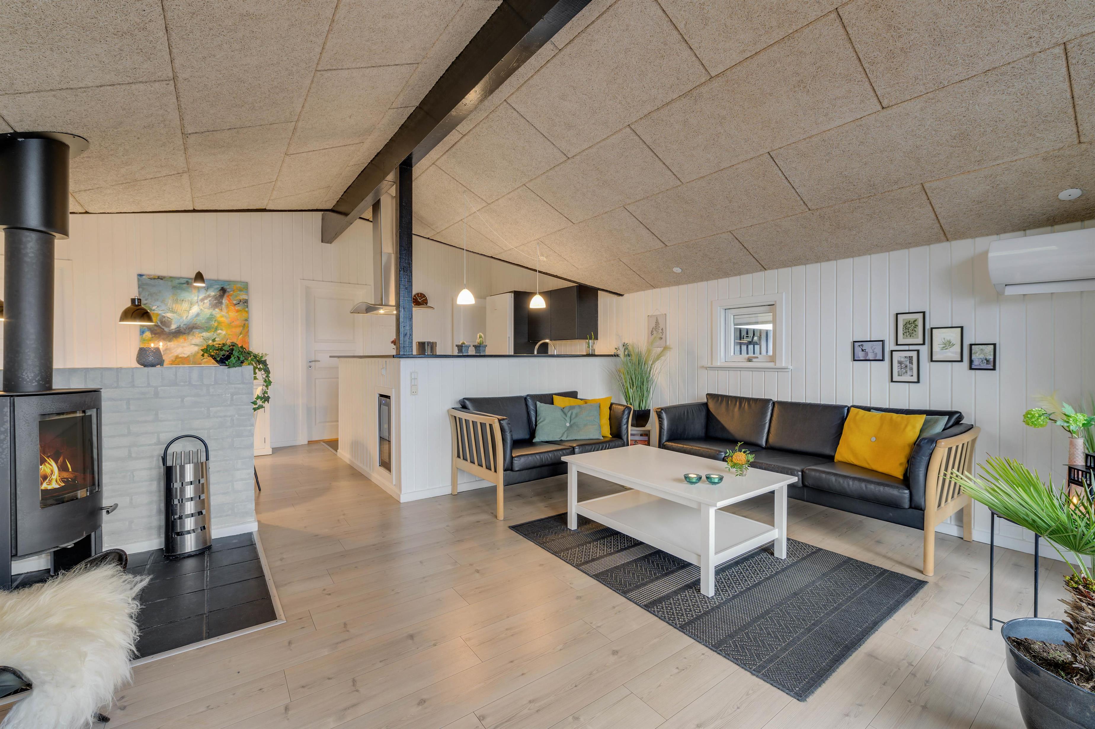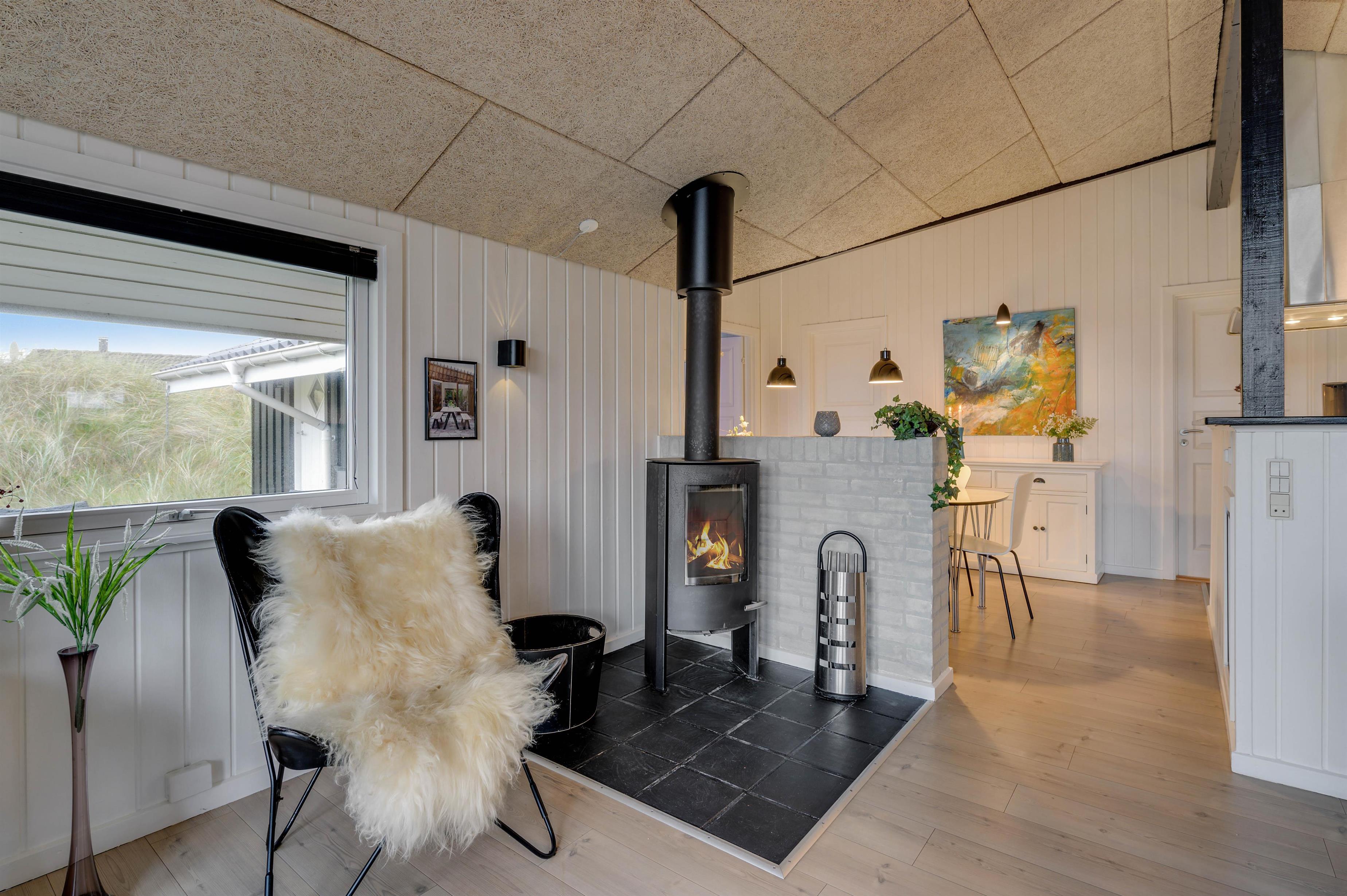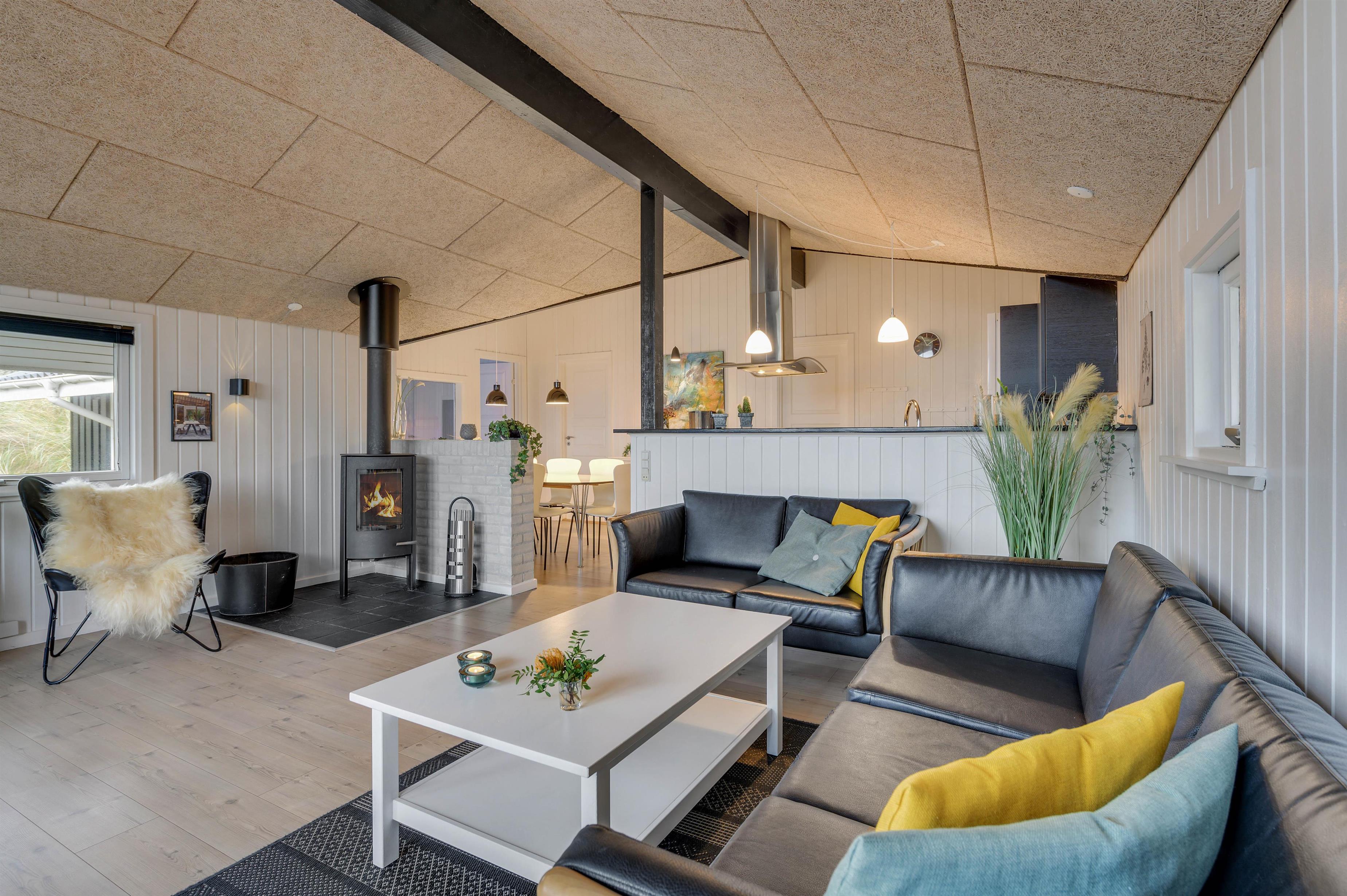 Feriehuset er indrettet i en flot, enkel stil, der giver et harmonisk og indbydende indtryk. I den hyggelige stue er der en dejlig brændeovn og en varmepumpe, der sørger for en behagelig varm temperatur. Og i det flotte køkken vil madlavningen sikkert gå som en leg, mens børnene kan sidde i spiseafdelingen lige ved siden af og spille spil.