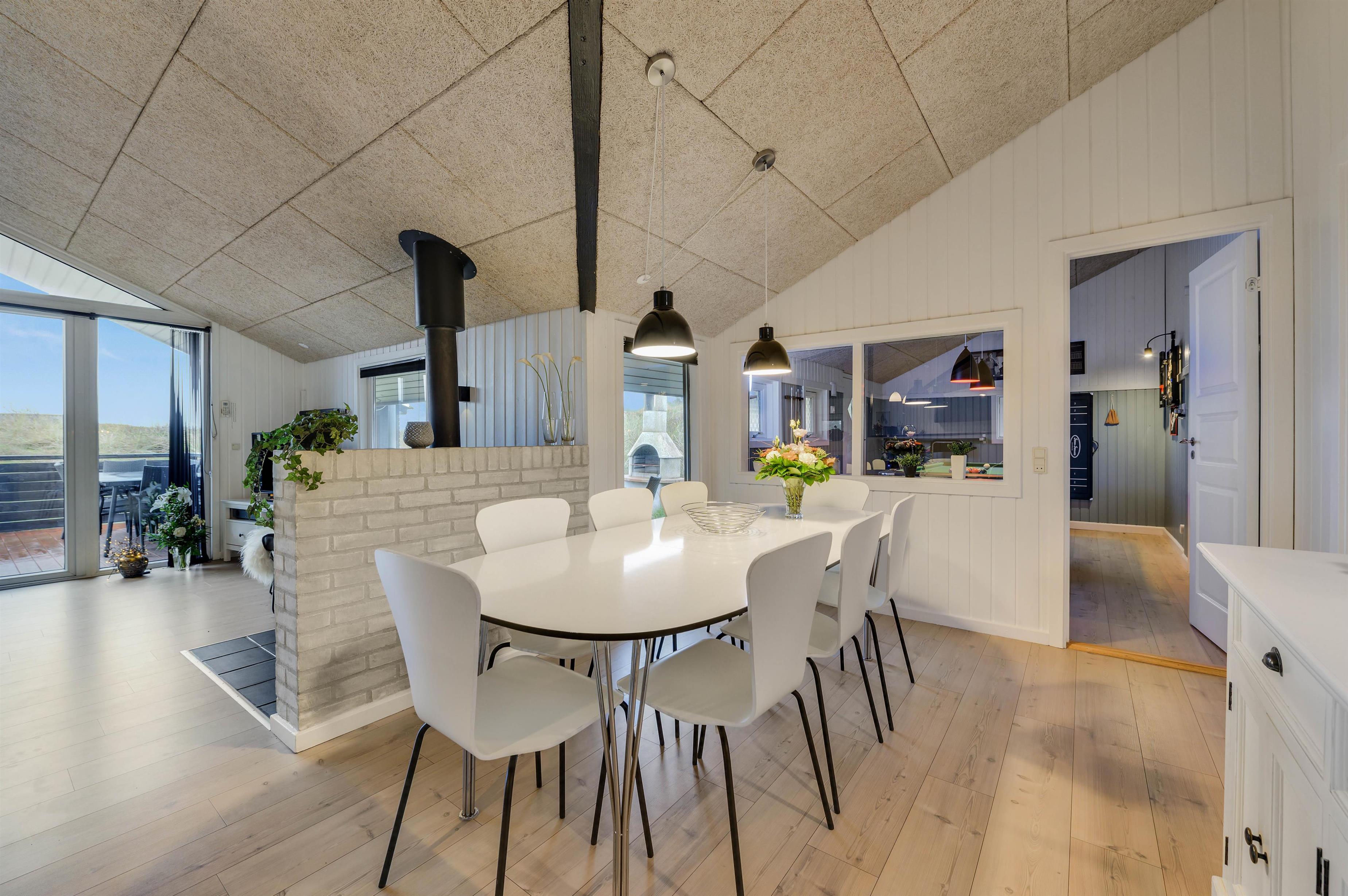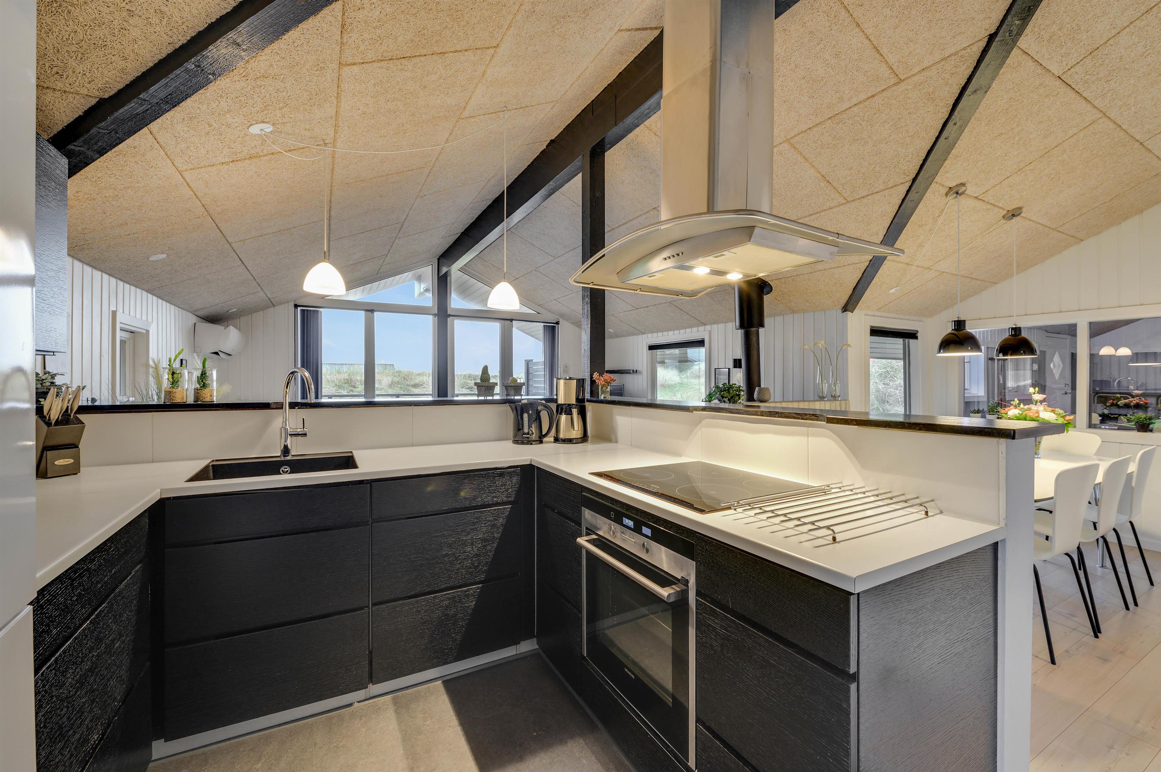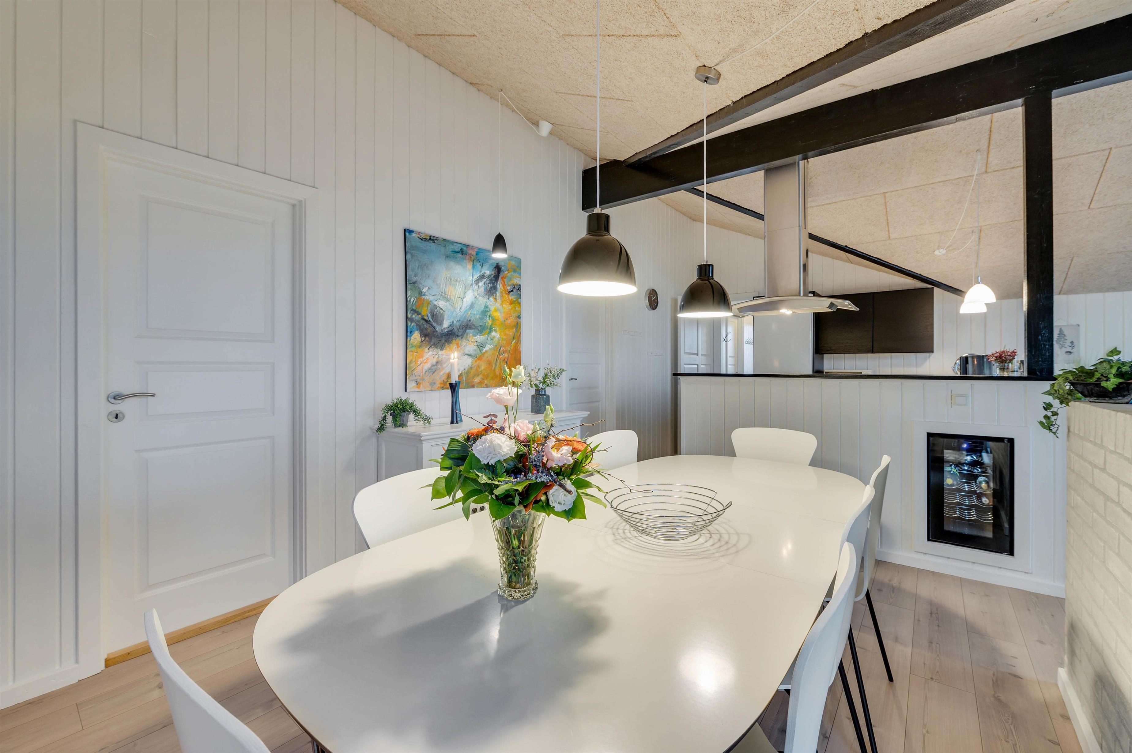 Feriehuset er indrettet i en flot, enkel stil, der giver et harmonisk og indbydende indtryk. I den hyggelige stue er der en dejlig brændeovn og en varmepumpe, der sørger for en behagelig varm temperatur. Og i det flotte køkken vil madlavningen sikkert gå som en leg, mens børnene kan sidde i spiseafdelingen lige ved siden af og spille spil.