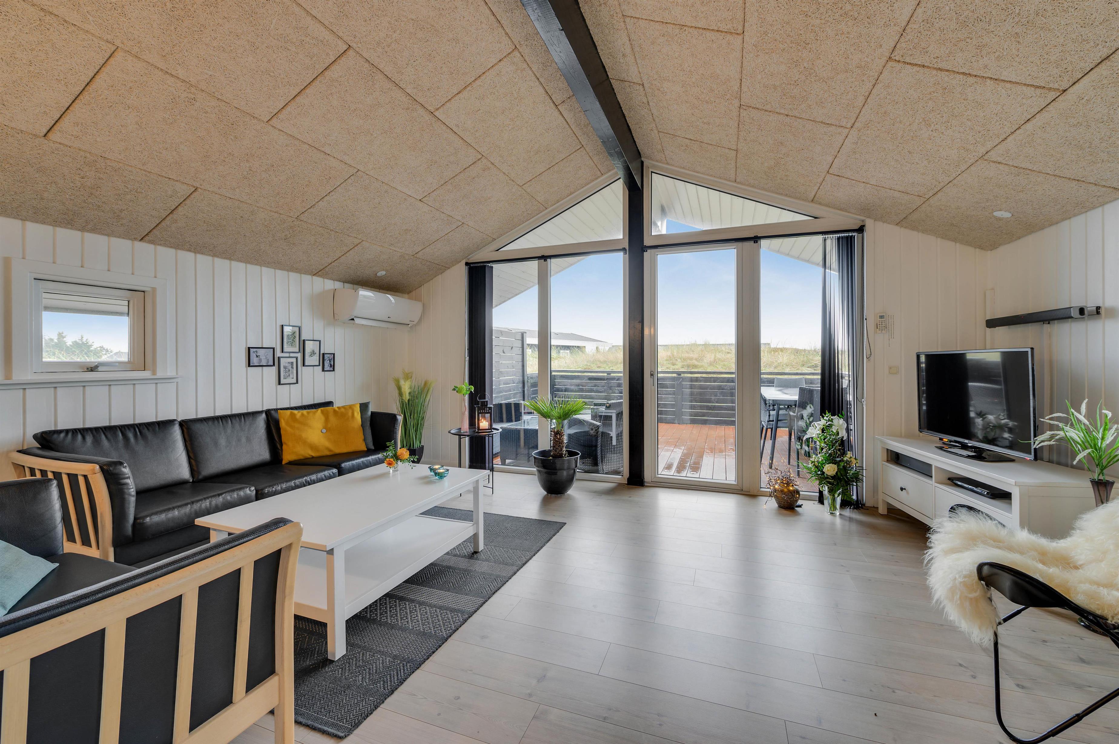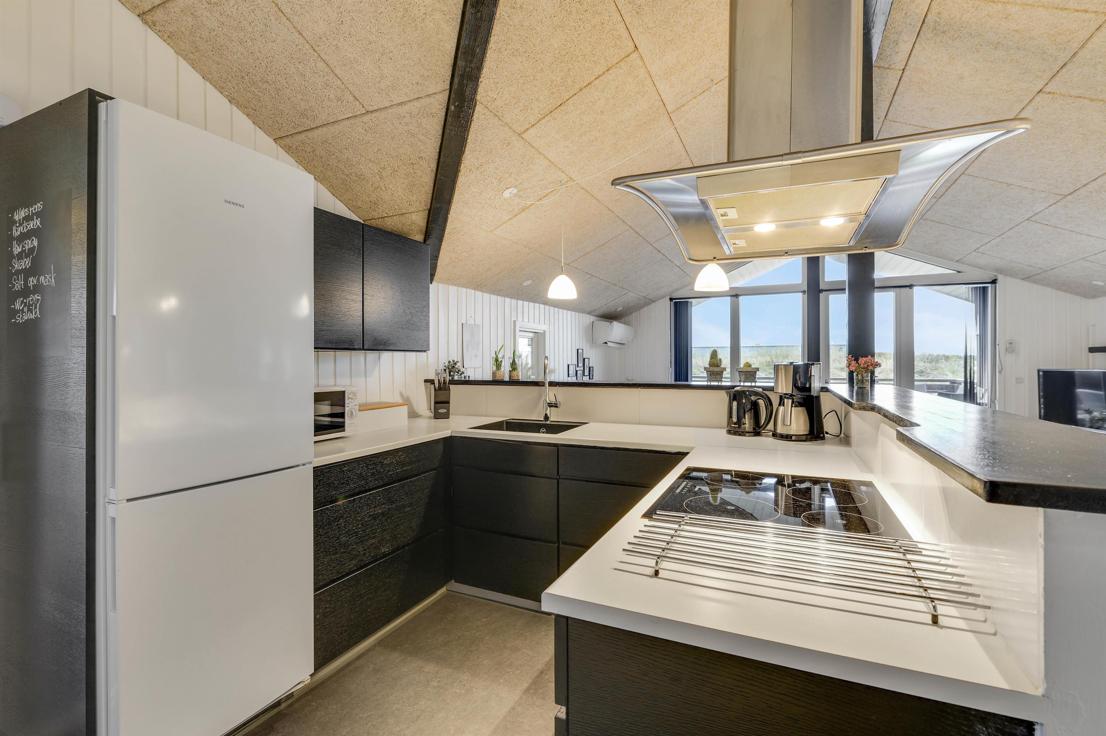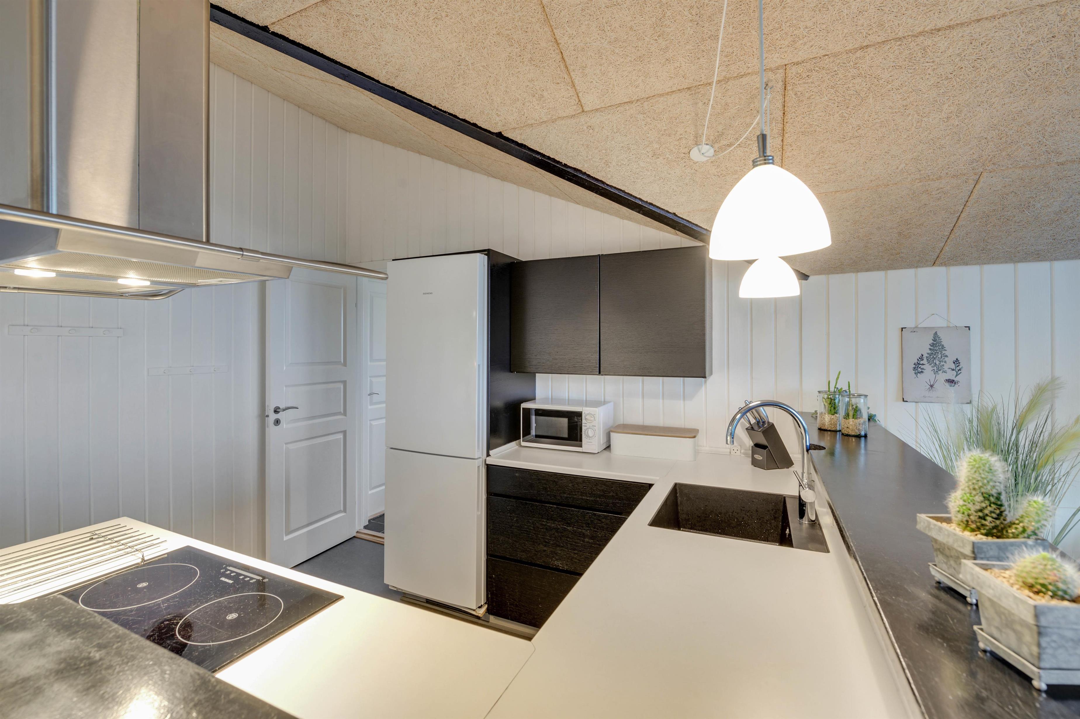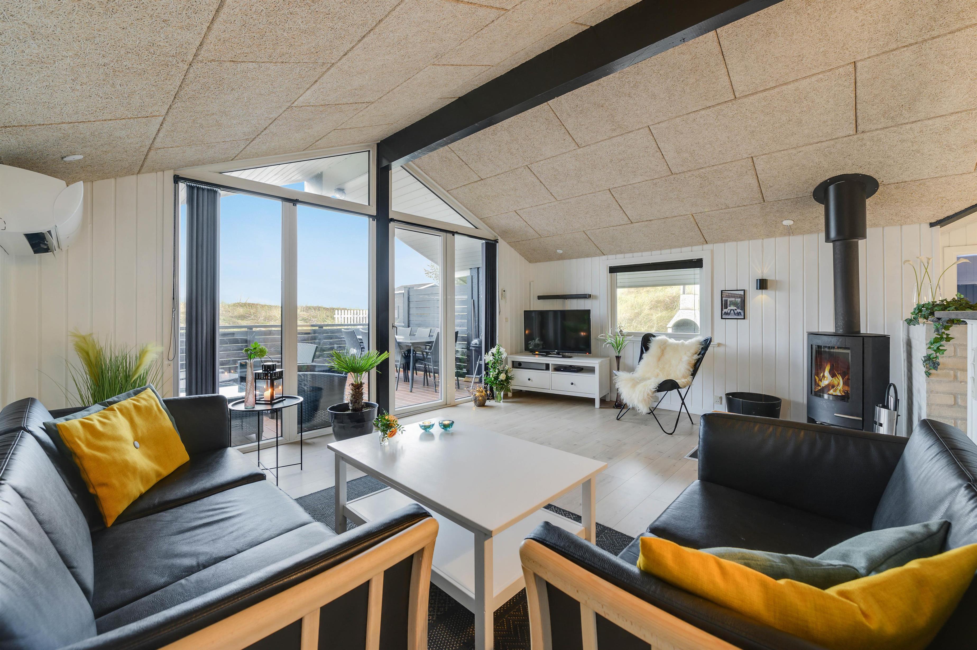 Feriehuset er indrettet i en flot, enkel stil, der giver et harmonisk og indbydende indtryk. I den hyggelige stue er der en dejlig brændeovn og en varmepumpe, der sørger for en behagelig varm temperatur. Og i det flotte køkken vil madlavningen sikkert gå som en leg, mens børnene kan sidde i spiseafdelingen lige ved siden af og spille spil.