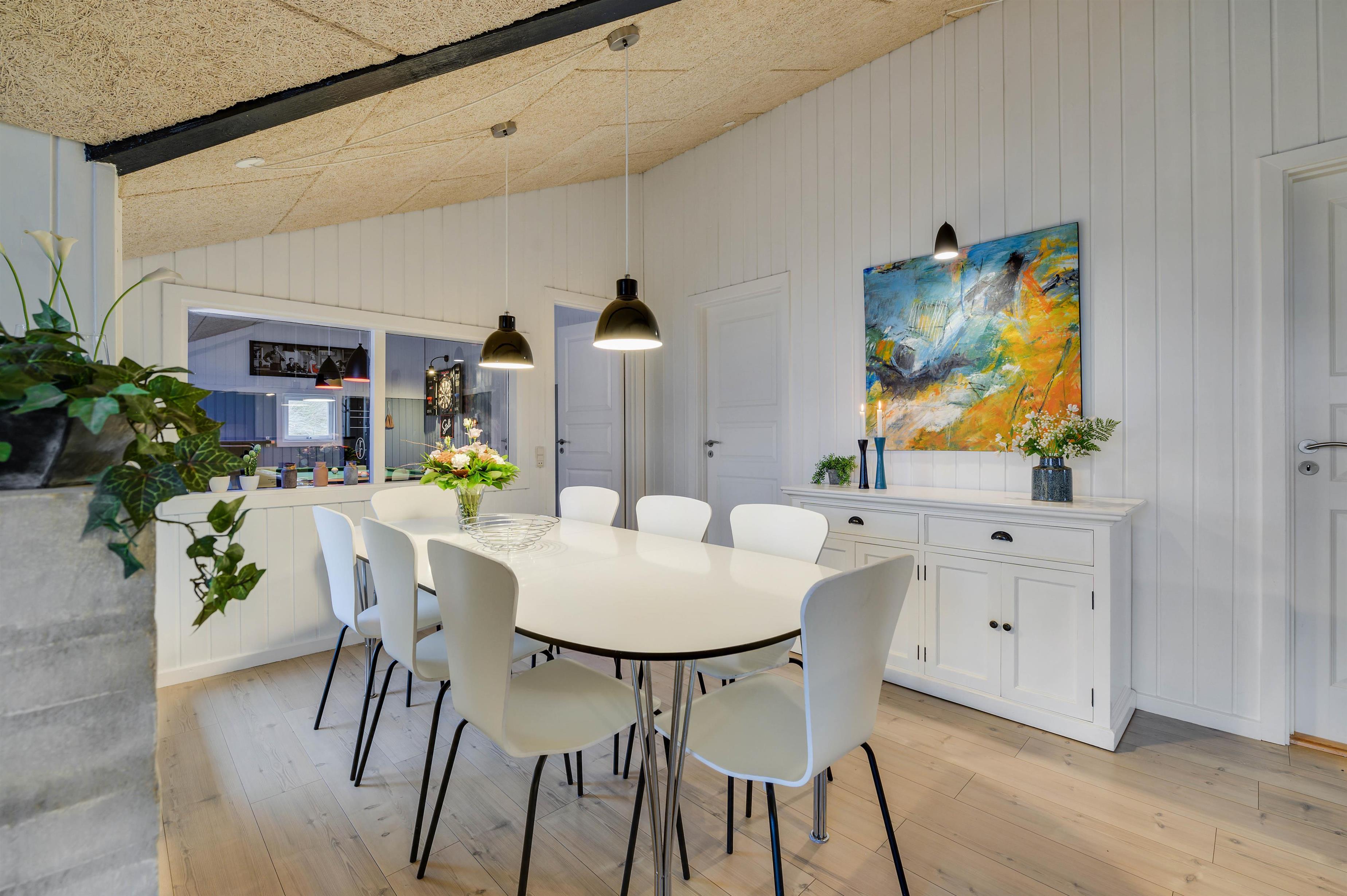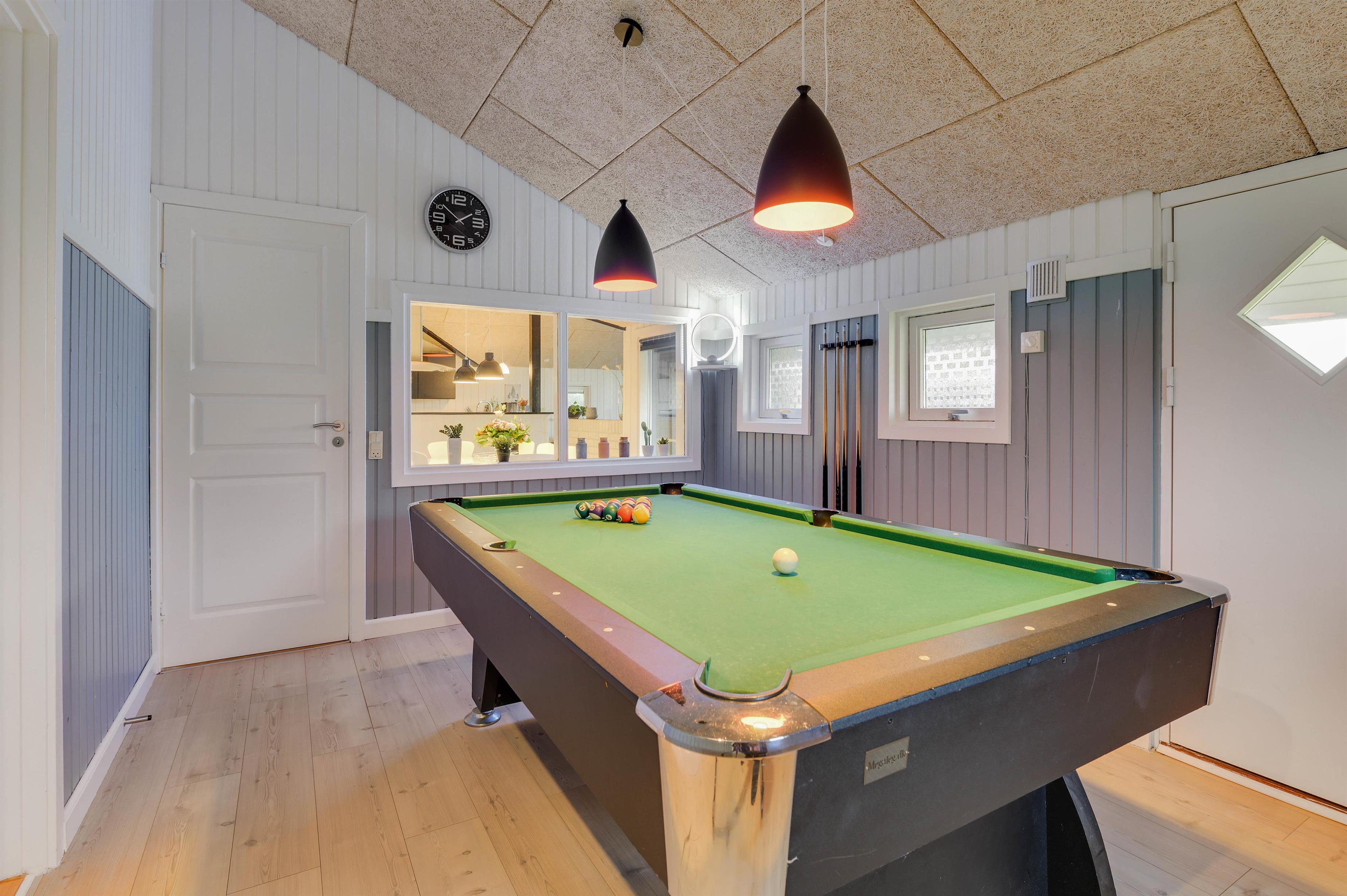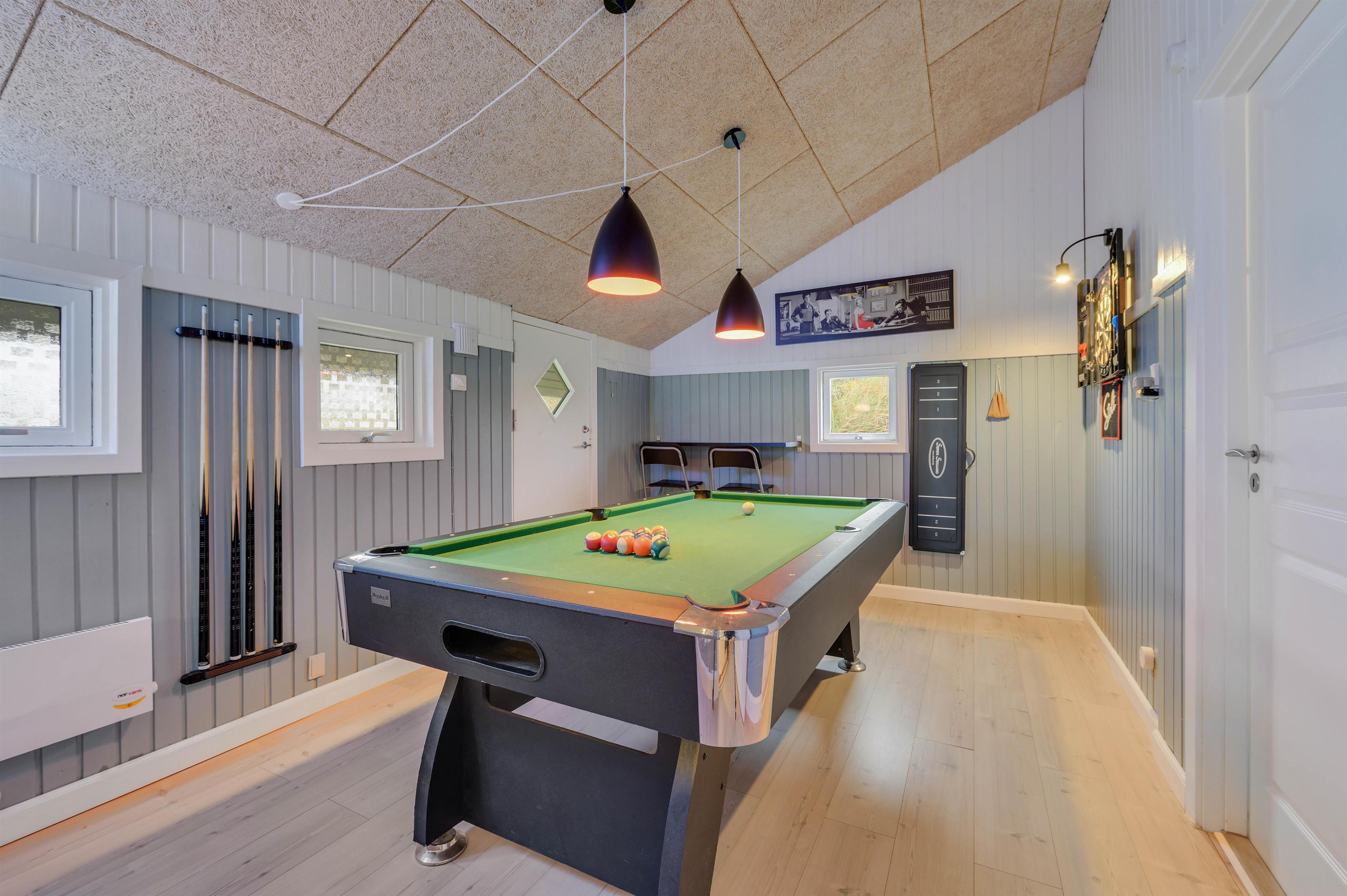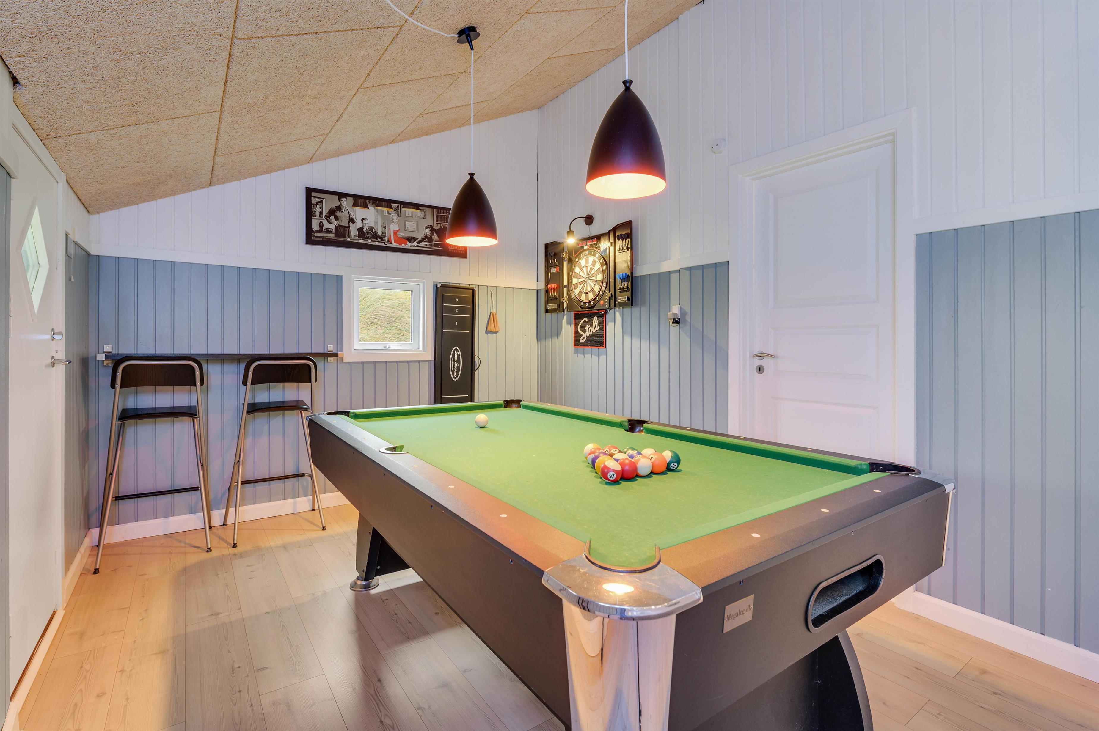 Feriehuset har også et dejligt aktivitetsrum med billardbord og dartskive, hvor du kan spille og hygge dig med familien. For større børn er sådan et aktivitetsrum et sikkert hit. Og da der er et vidnuesparti mellem aktivitetsrummet og spiseafdelingen, kan du også følge lidt med i, hvad der sker.