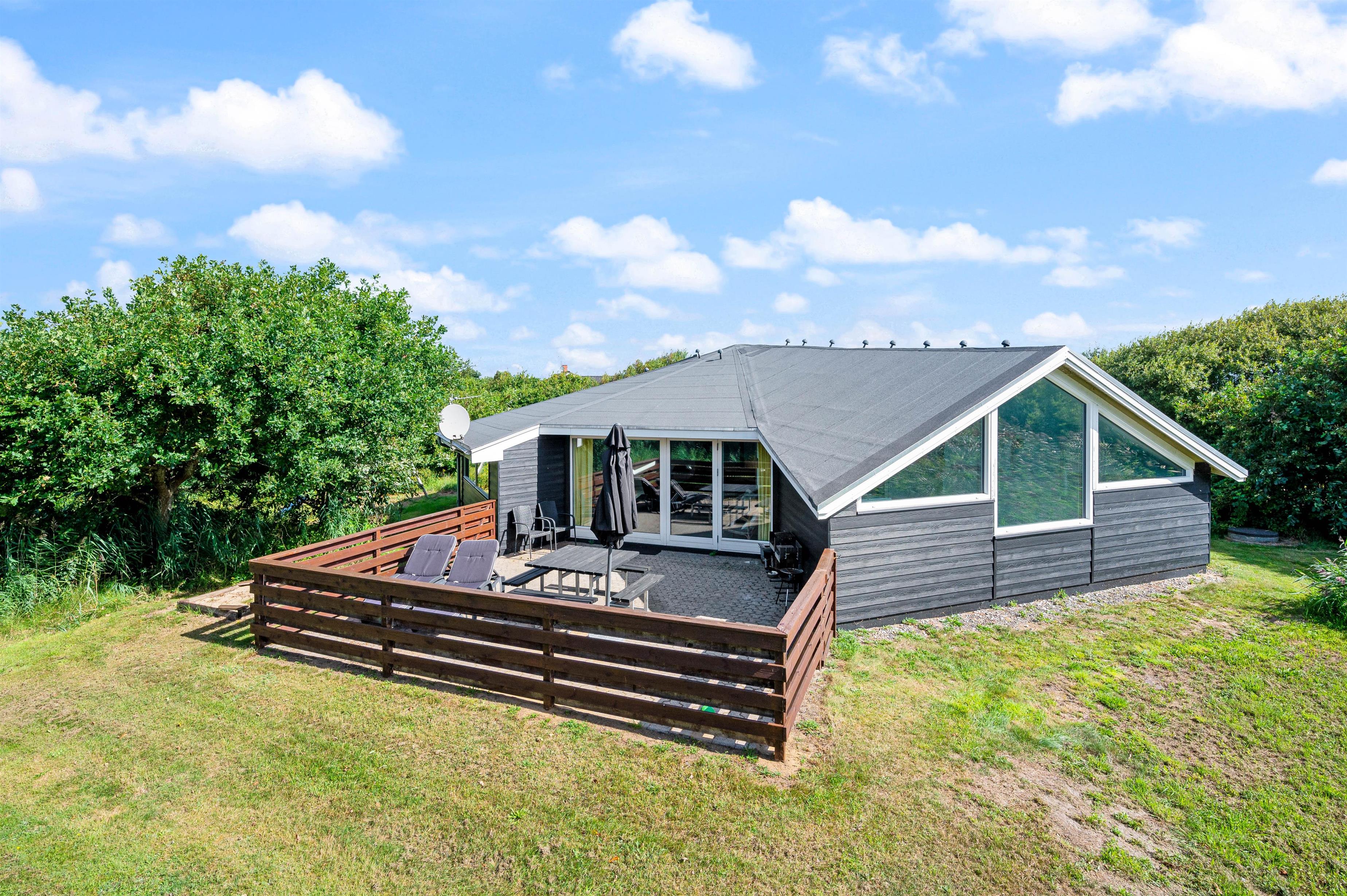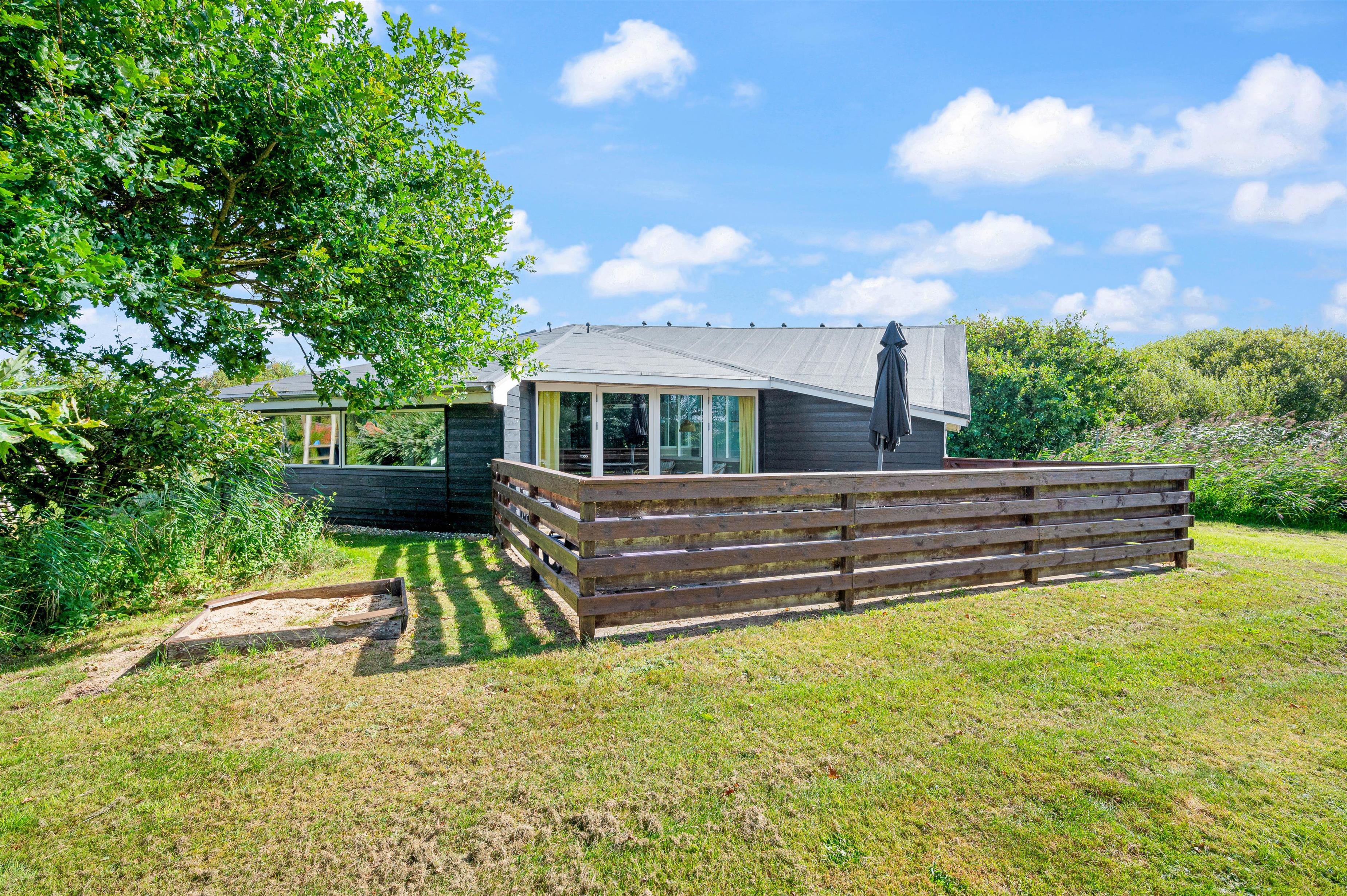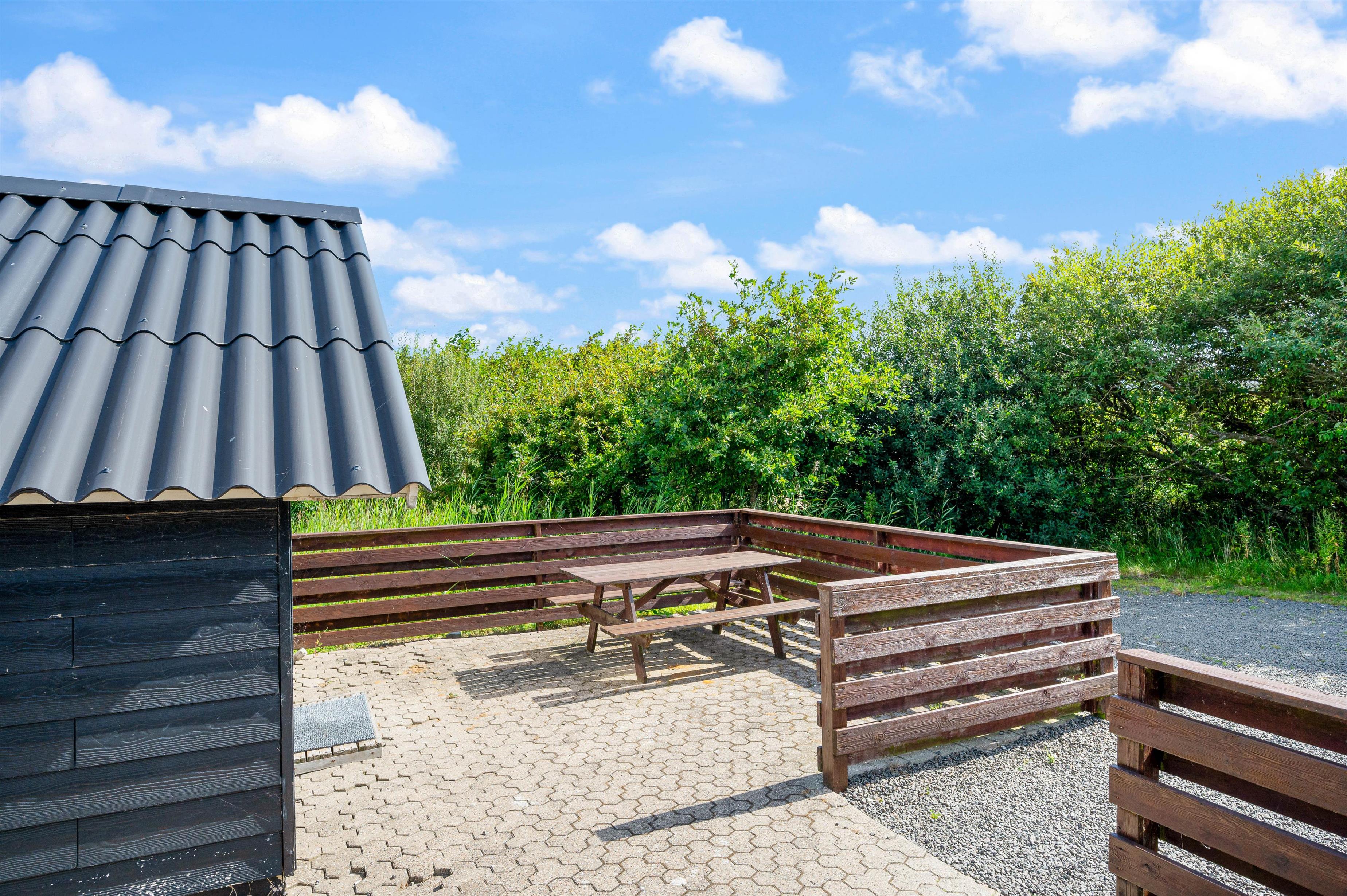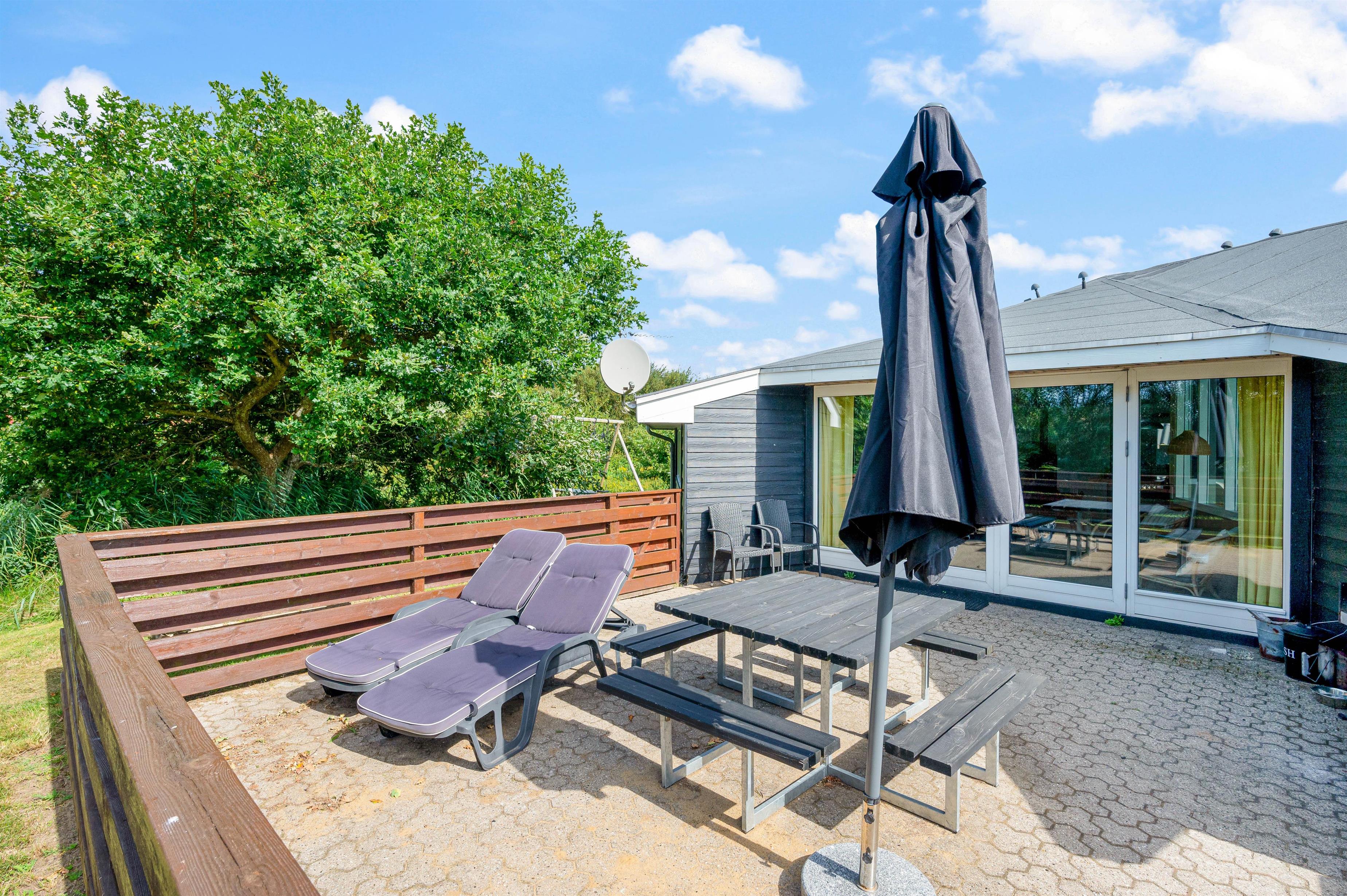 Sommerhuset har 2 dejlige terrasser, hvorfra I kan nyde solen og den friske luft. Den ene terrasse er nordøstvendt, og her kan du drikke en god kop kaffe til solopgangen, imens resten af familien sover videre. Den sydvestvendte terrasse er lukket, og herfra har I en fantastisk udsigt til Ringkøbing Fjord. Denne terrasse er perfekt til et lækkert grillmåltid på en lun sommeraften.