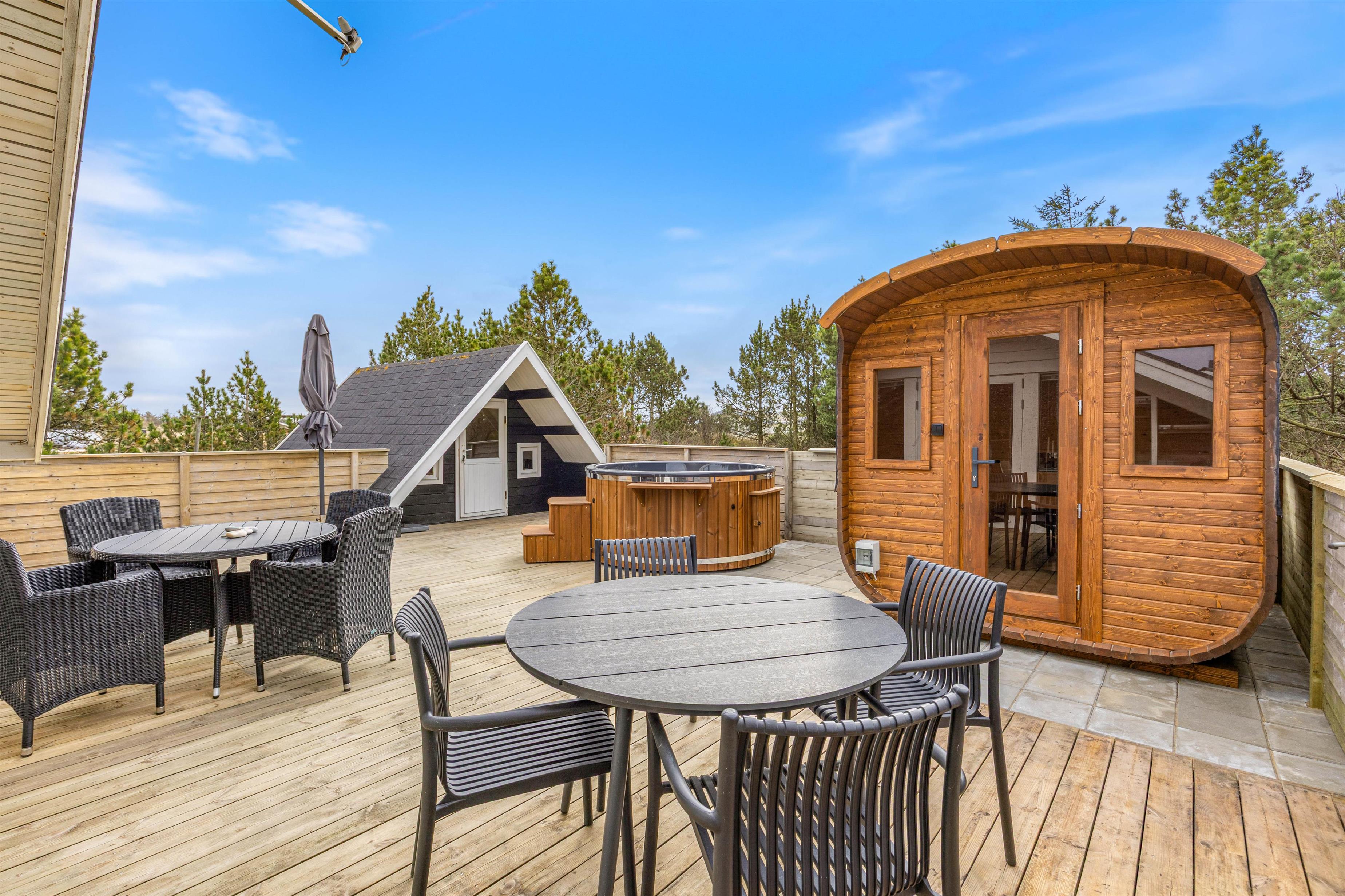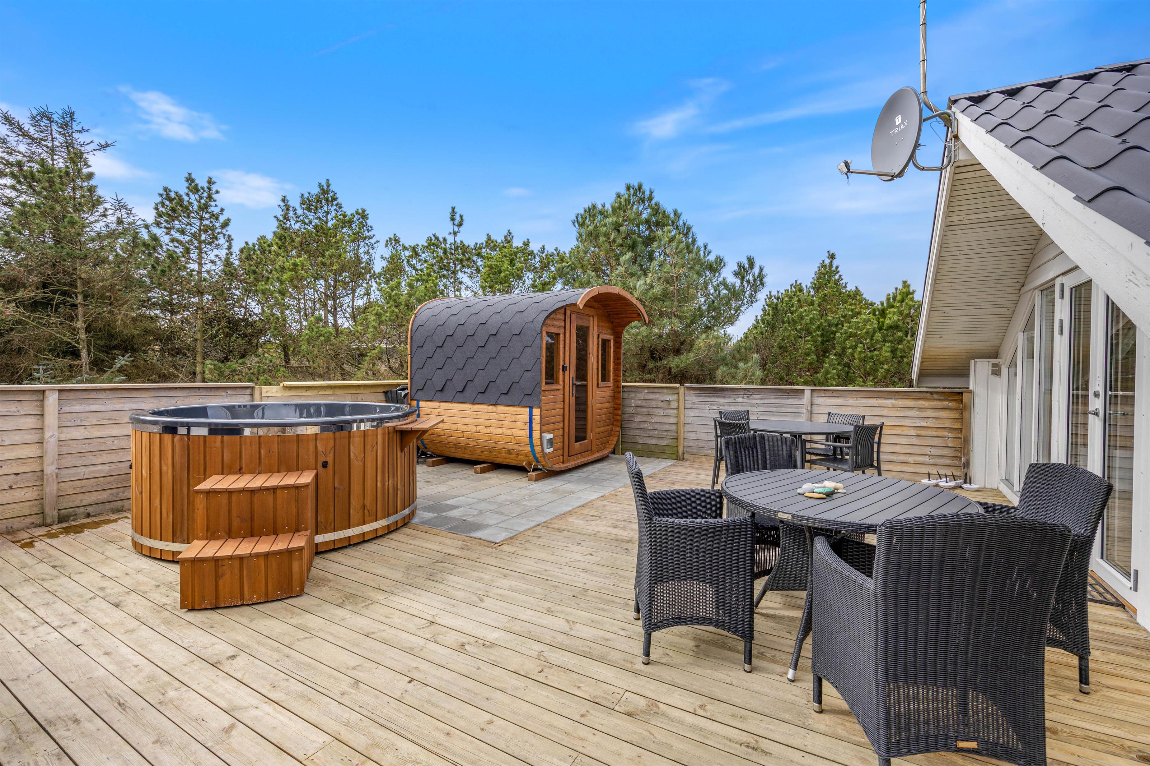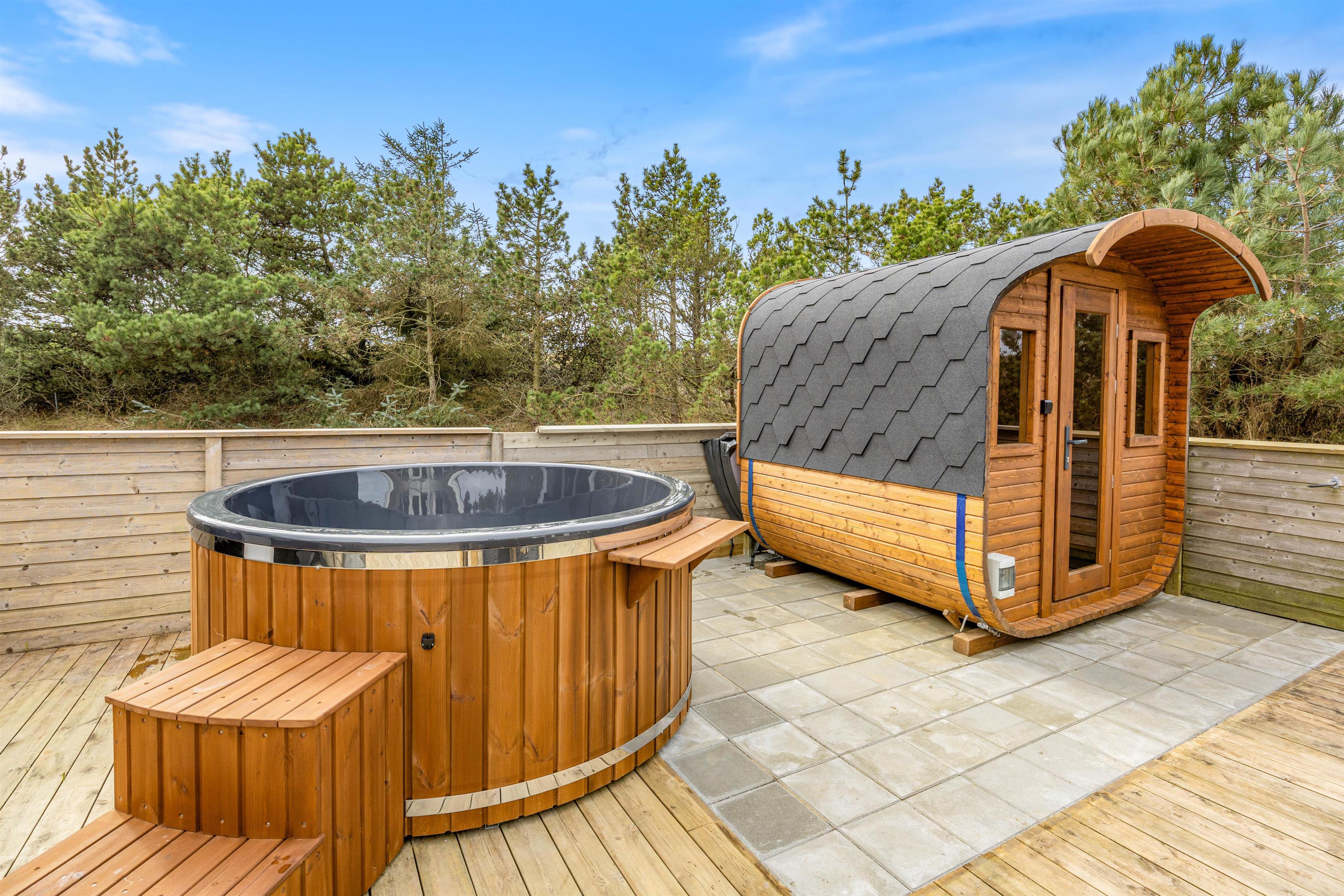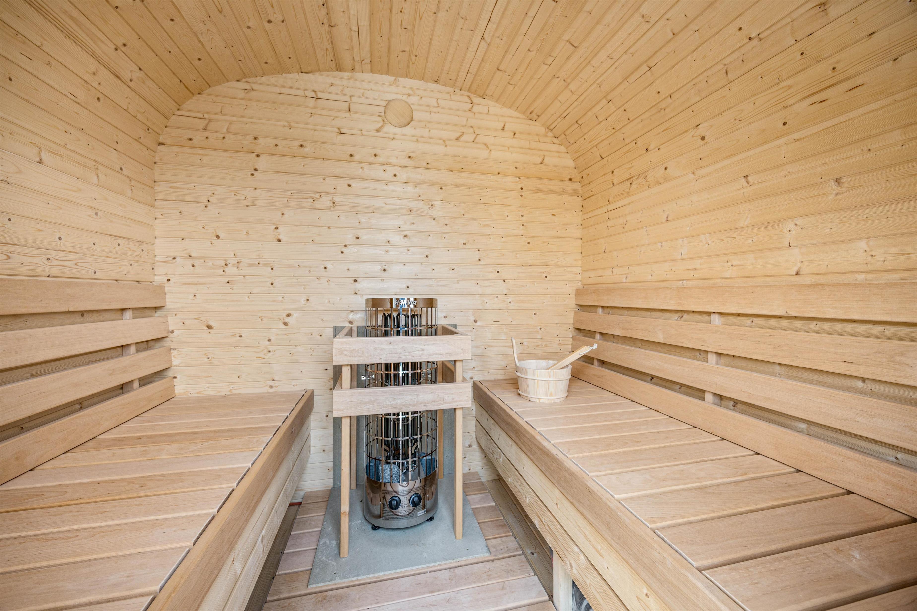 Efter en lang dag på stranden eller med udendørs aktiviteter kan I forkæle jer selv i sommerhusets elektriske sauna og elektriske vildmarksbad – den perfekte måde at slappe helt af og lade batterierne op.