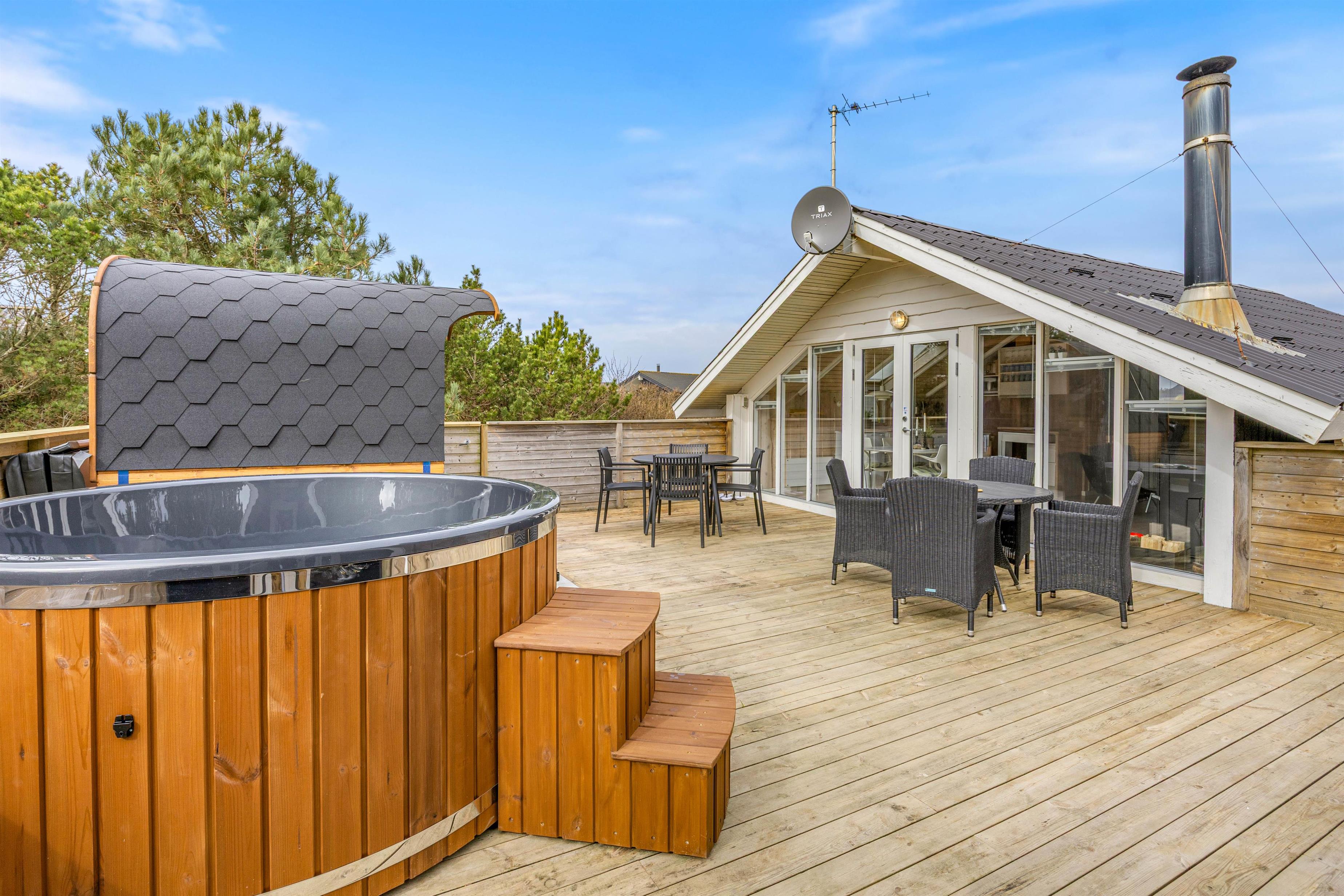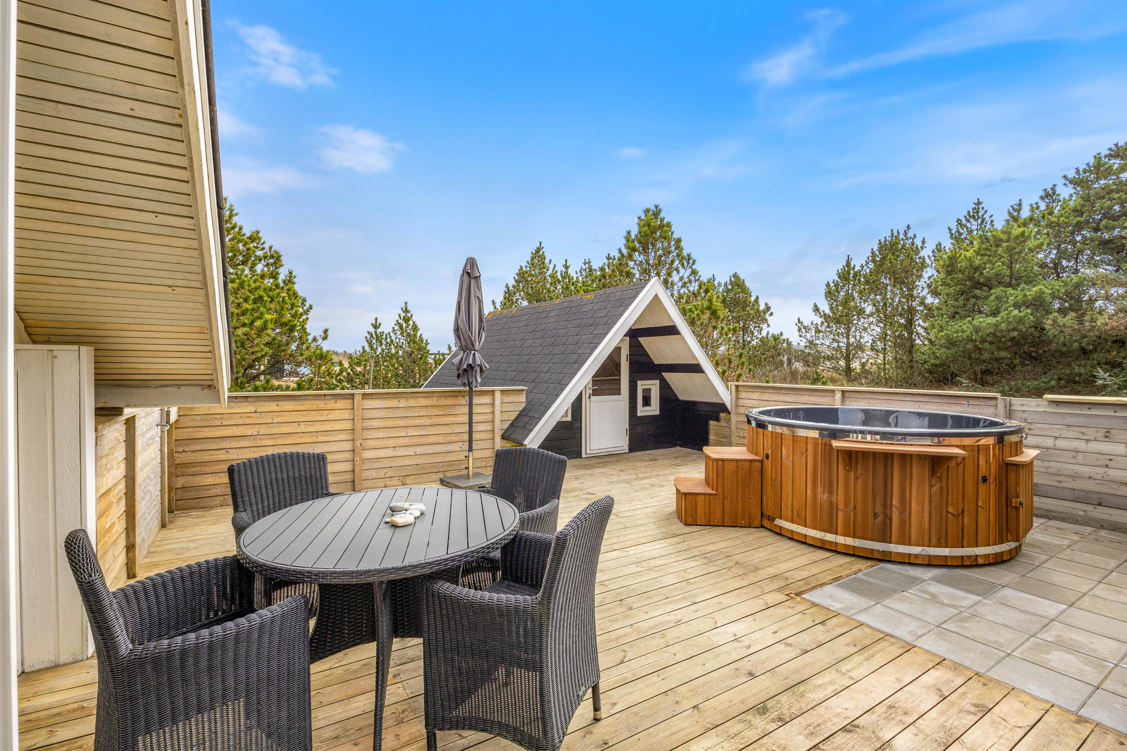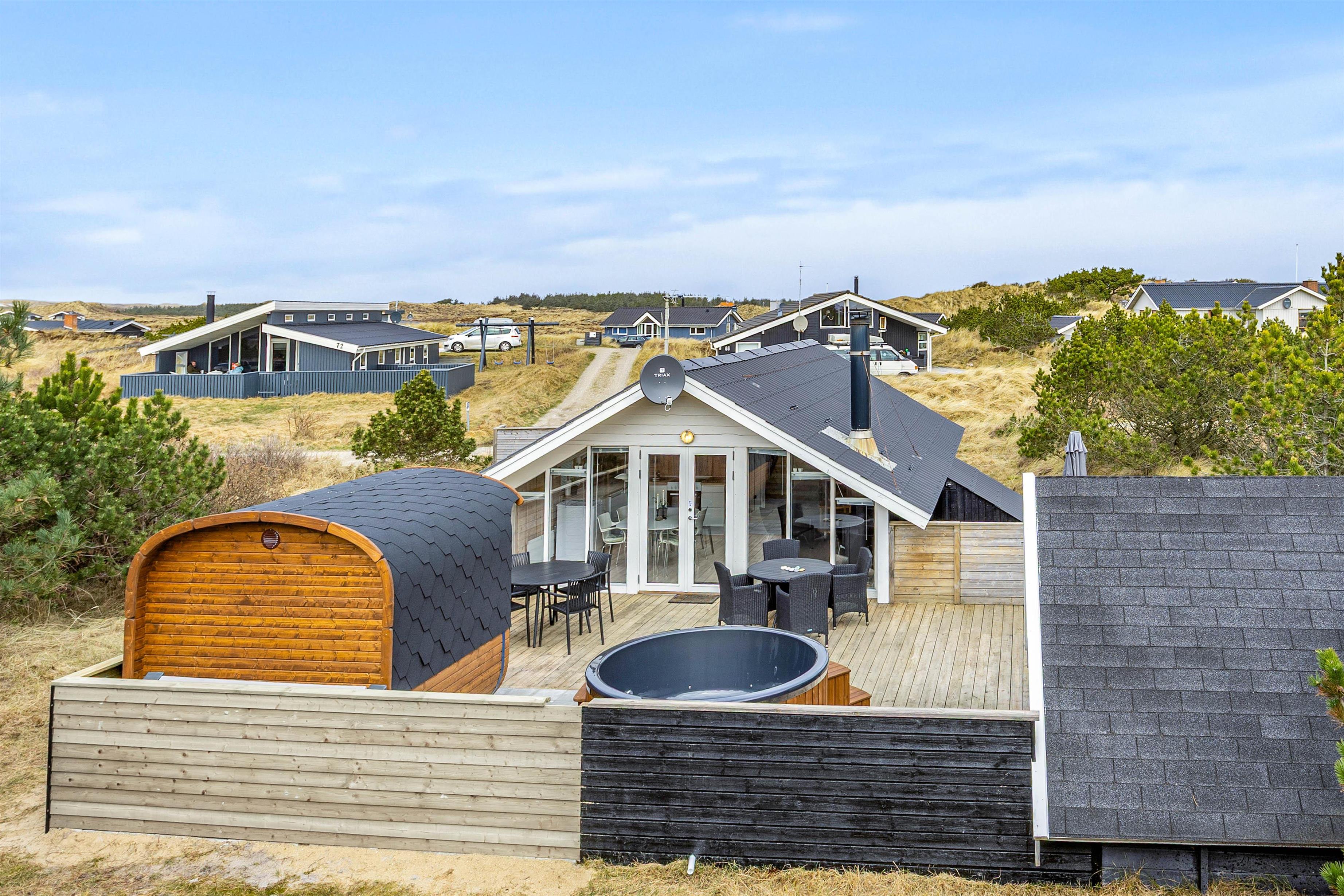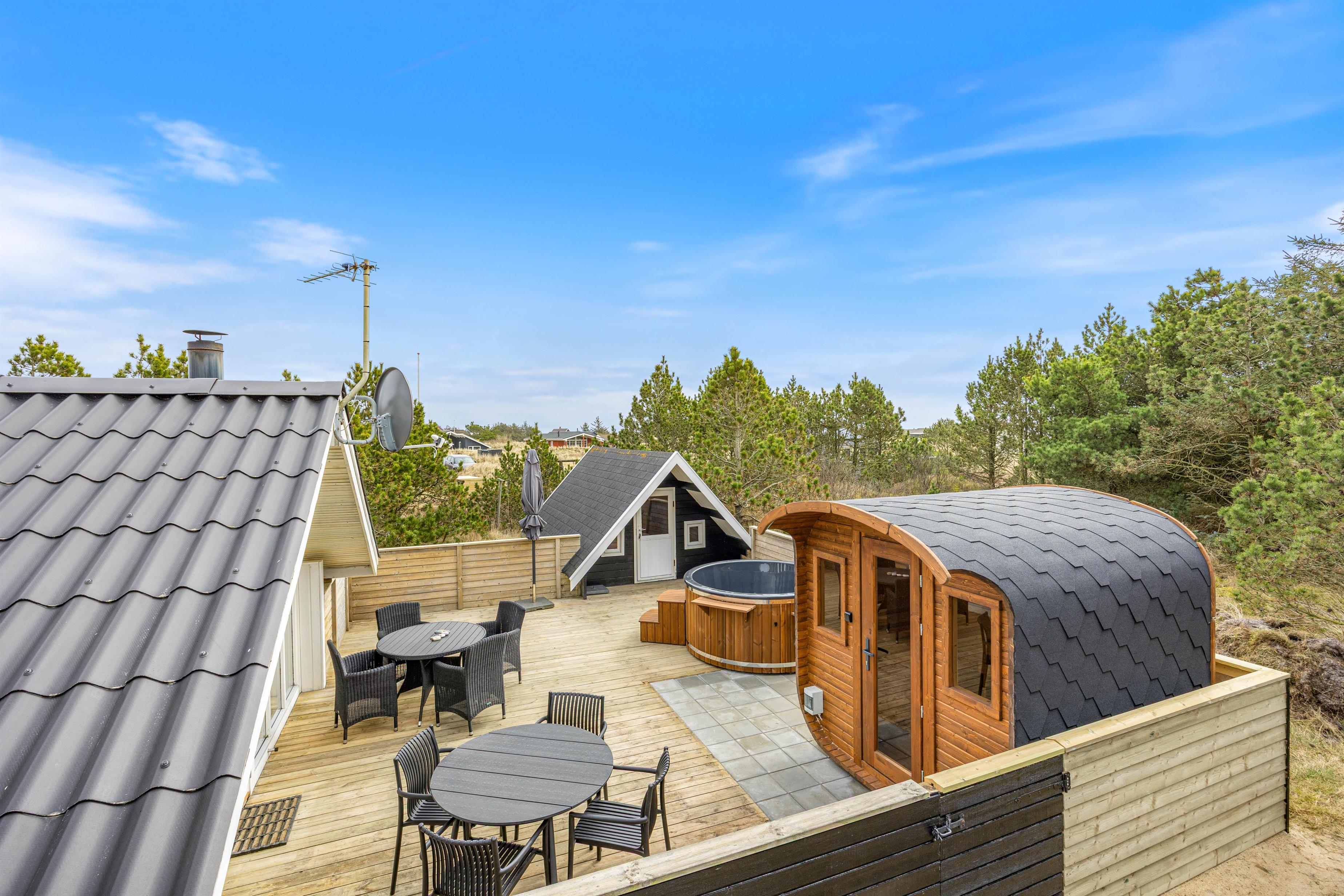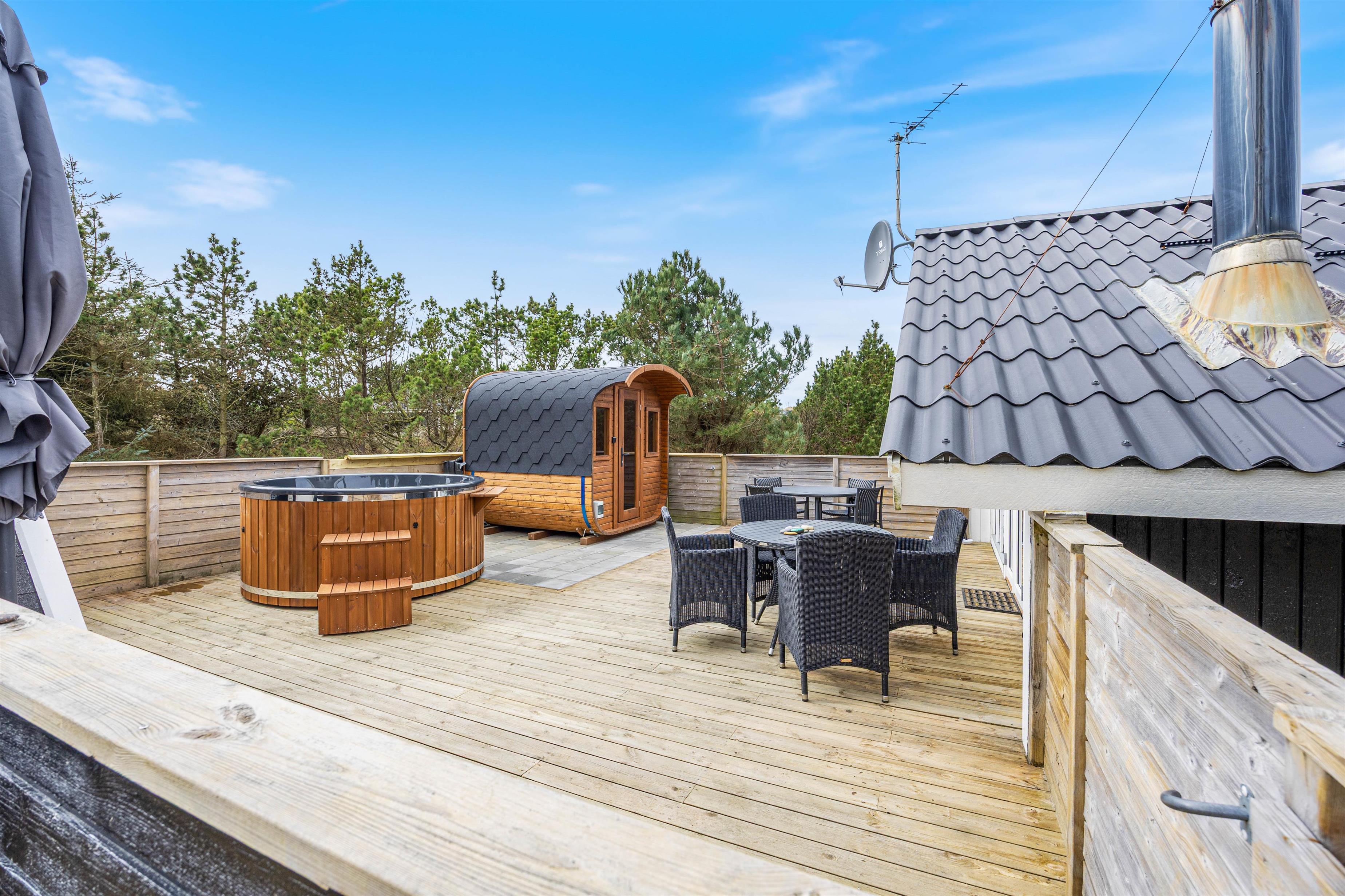 Efter en lang dag på stranden eller med udendørs aktiviteter kan I forkæle jer selv i sommerhusets elektriske sauna og elektriske vildmarksbad – den perfekte måde at slappe helt af og lade batterierne op.