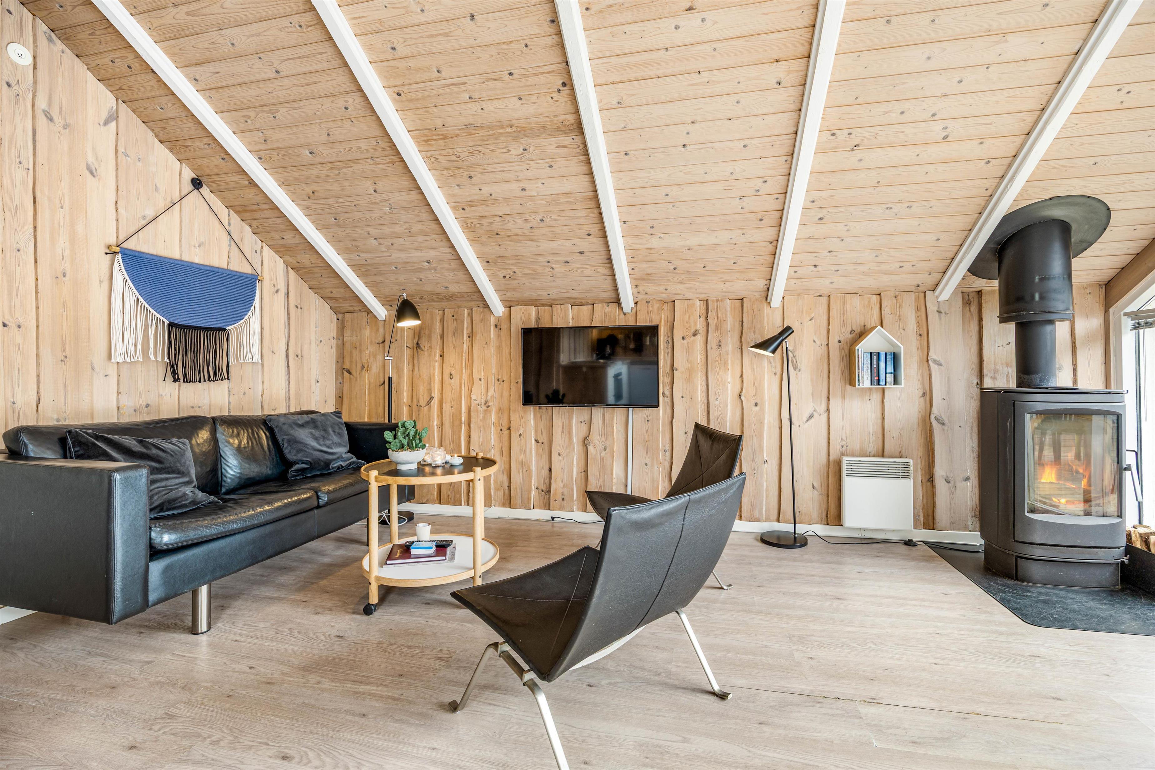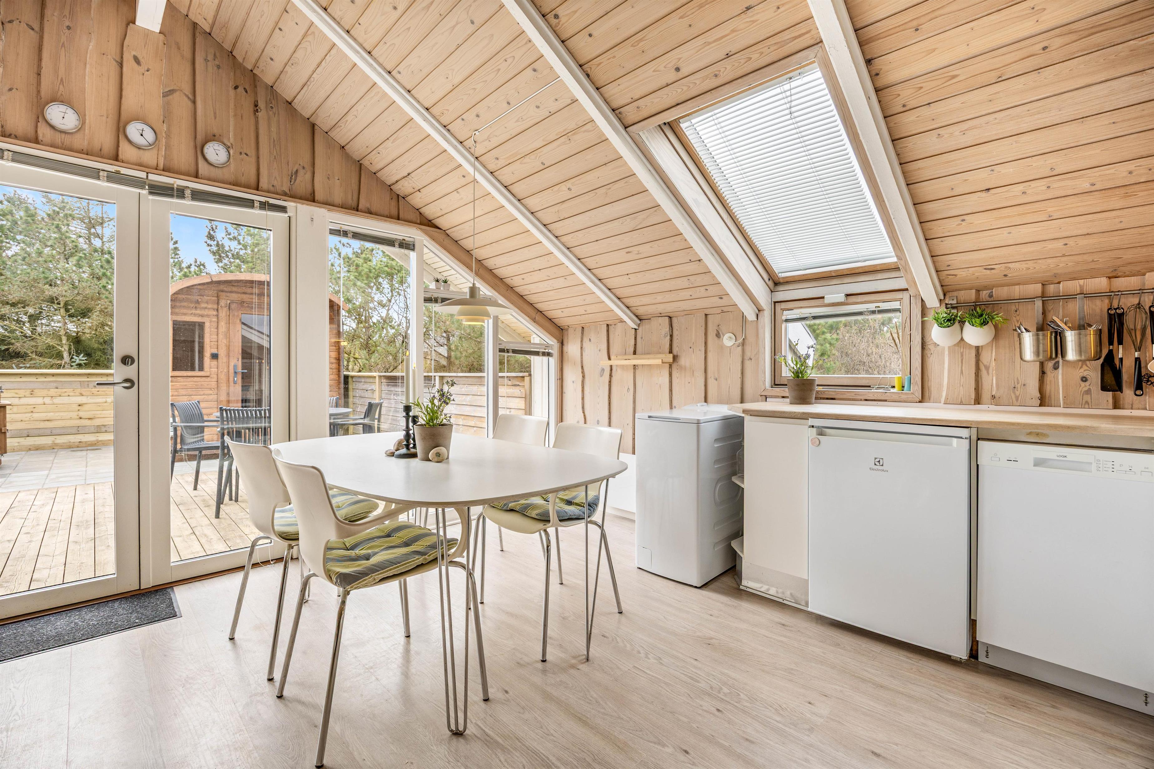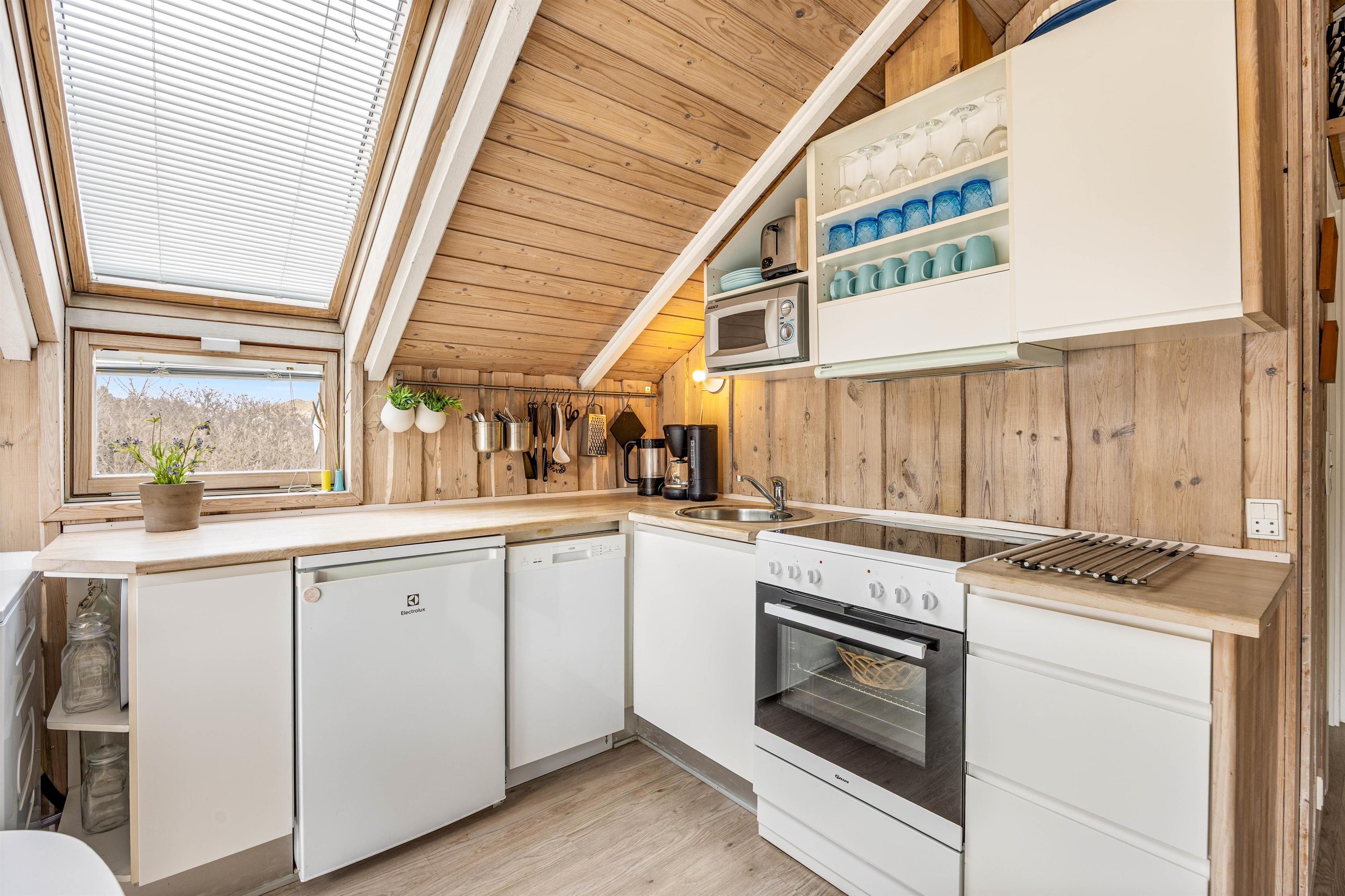 Sommerhusets hjerte er et lyst køkkenalrum, hvor stuen og køkkenet smelter sammen. Her kan I lave dejlig mad i det praktiske køkken med opvaskemaskine, spille brætspil eller slappe af med en god bog eller film i sofaen. På de køligere aftener kan I tænde op i brændeovnen og nyde den hyggelige varme. Sommerhuset har desuden en vaskemaskine.