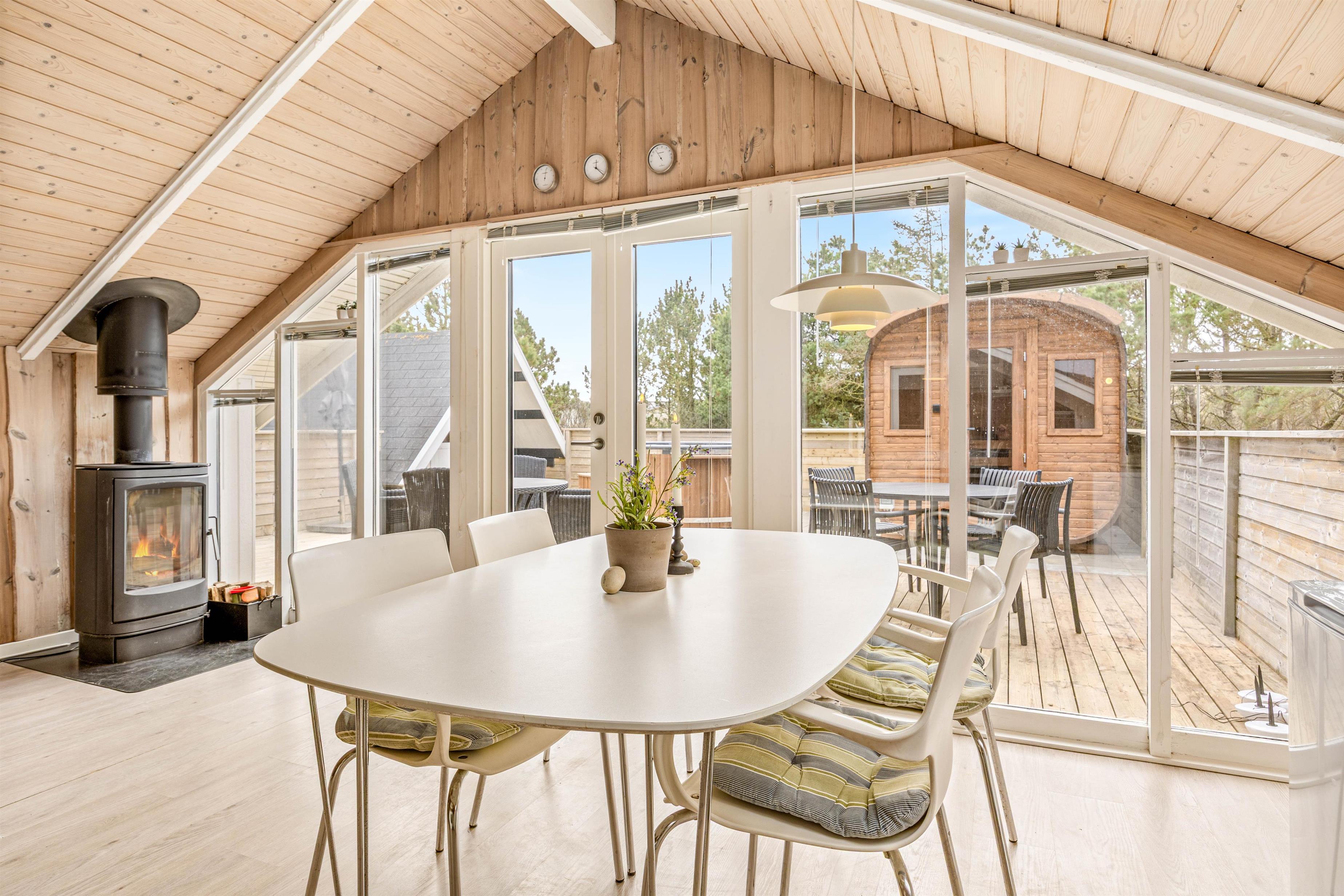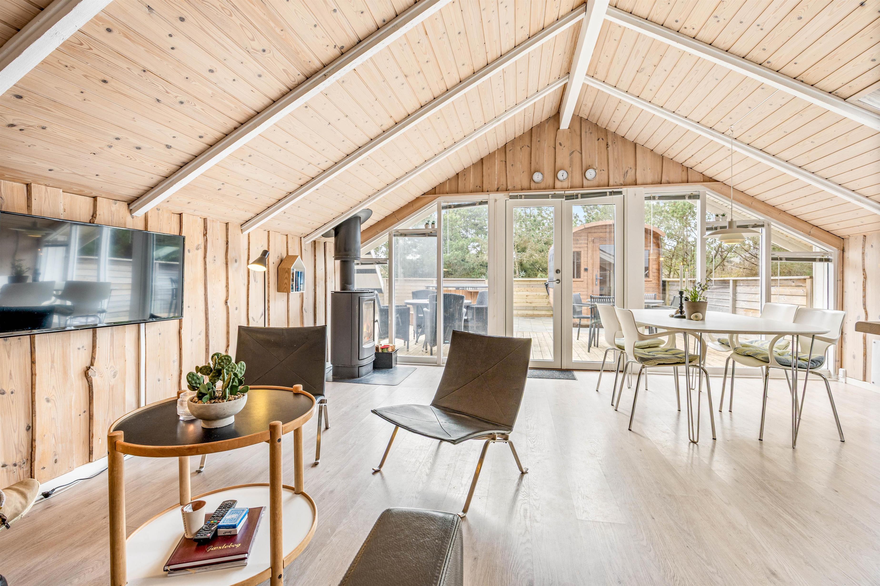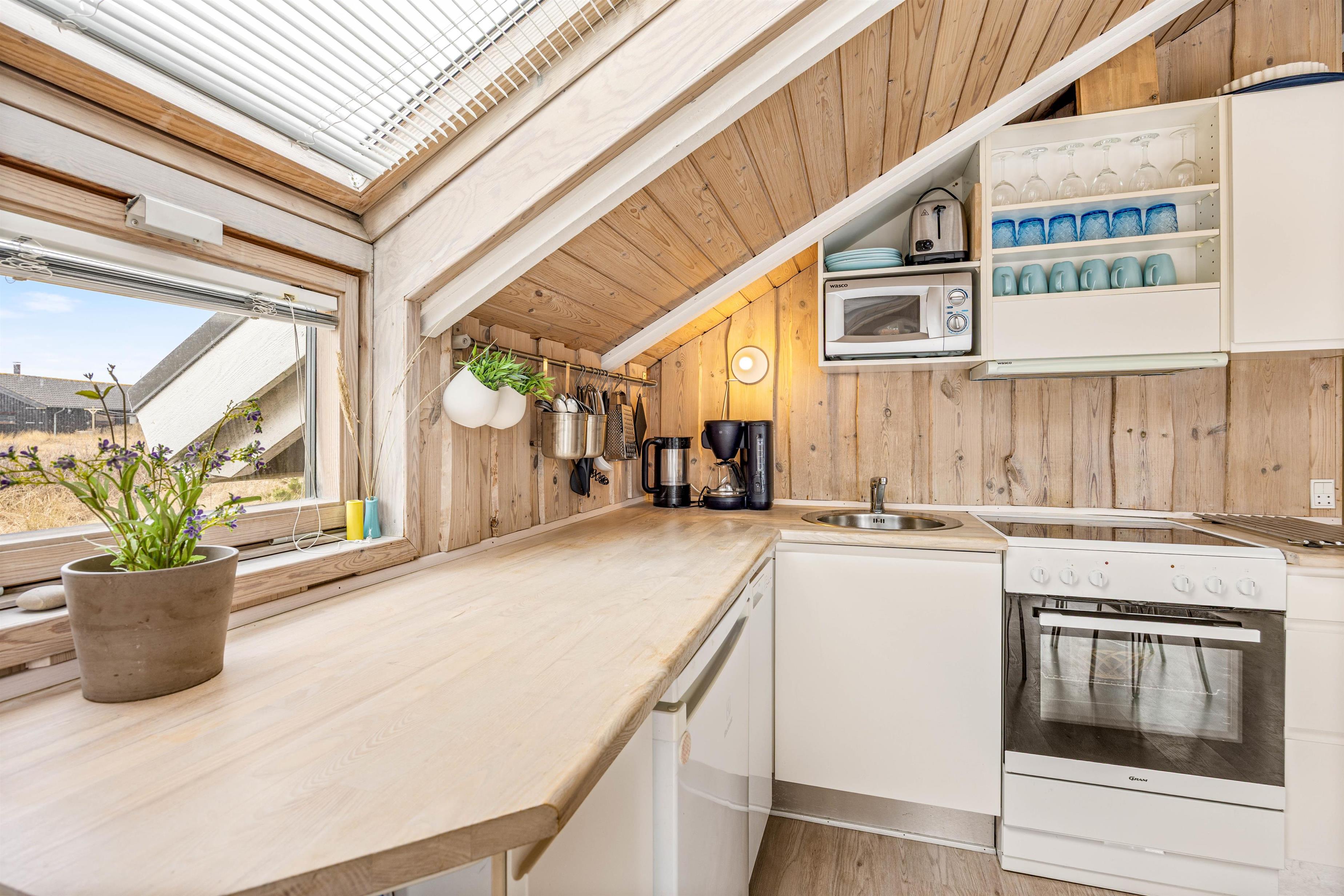 Sommerhusets hjerte er et lyst køkkenalrum, hvor stuen og køkkenet smelter sammen. Her kan I lave dejlig mad i det praktiske køkken med opvaskemaskine, spille brætspil eller slappe af med en god bog eller film i sofaen. På de køligere aftener kan I tænde op i brændeovnen og nyde den hyggelige varme. Sommerhuset har desuden en vaskemaskine.