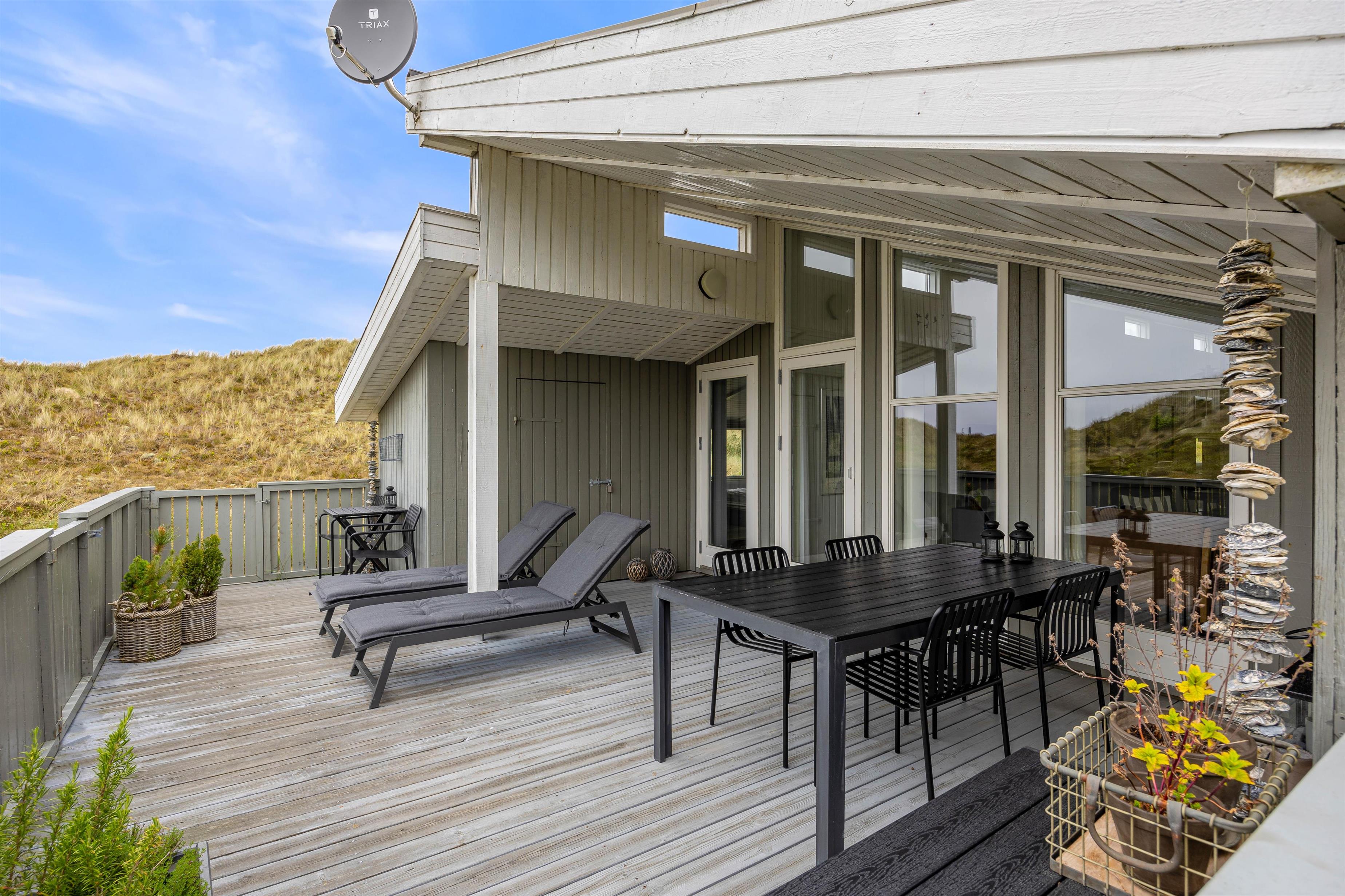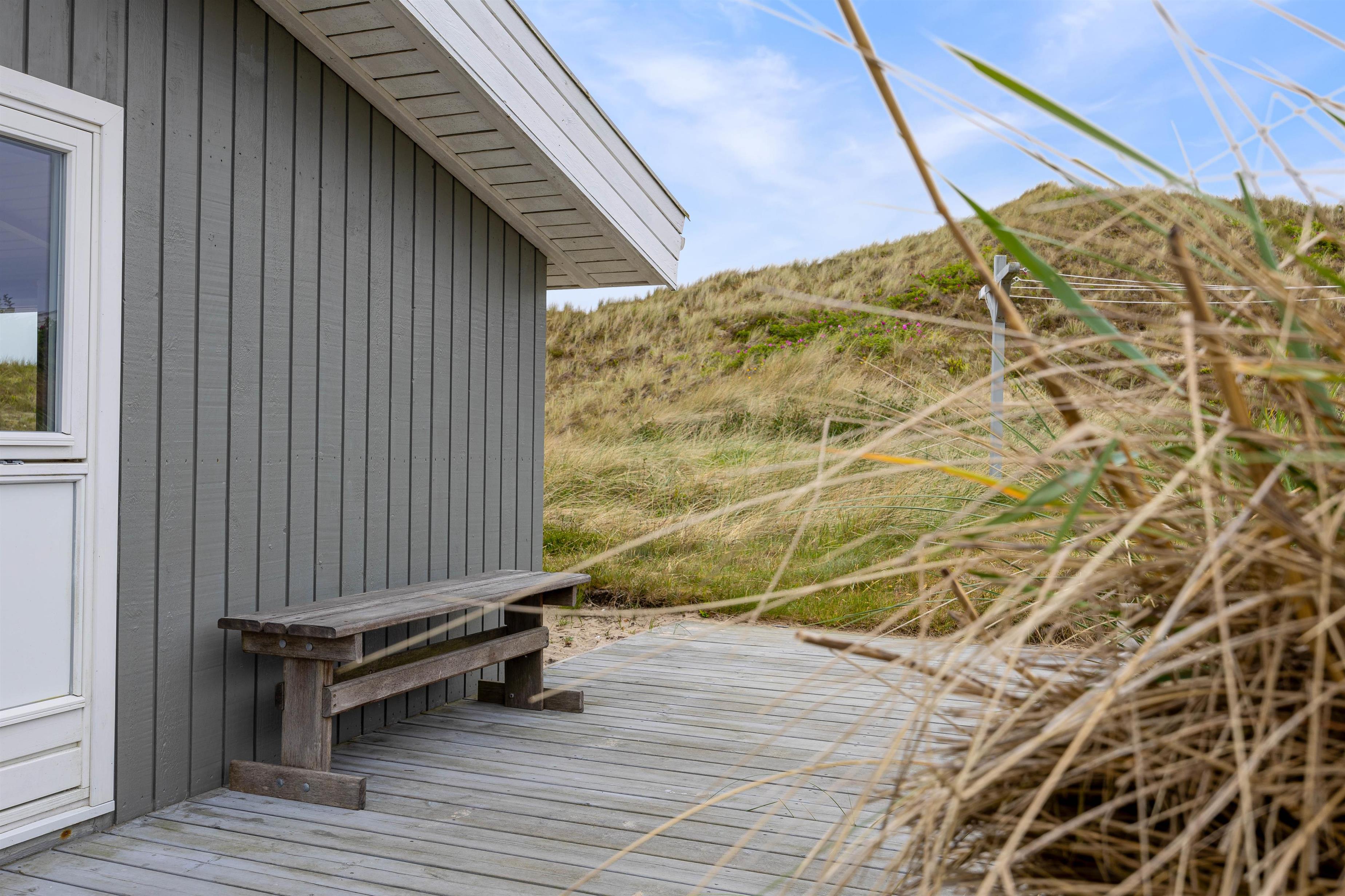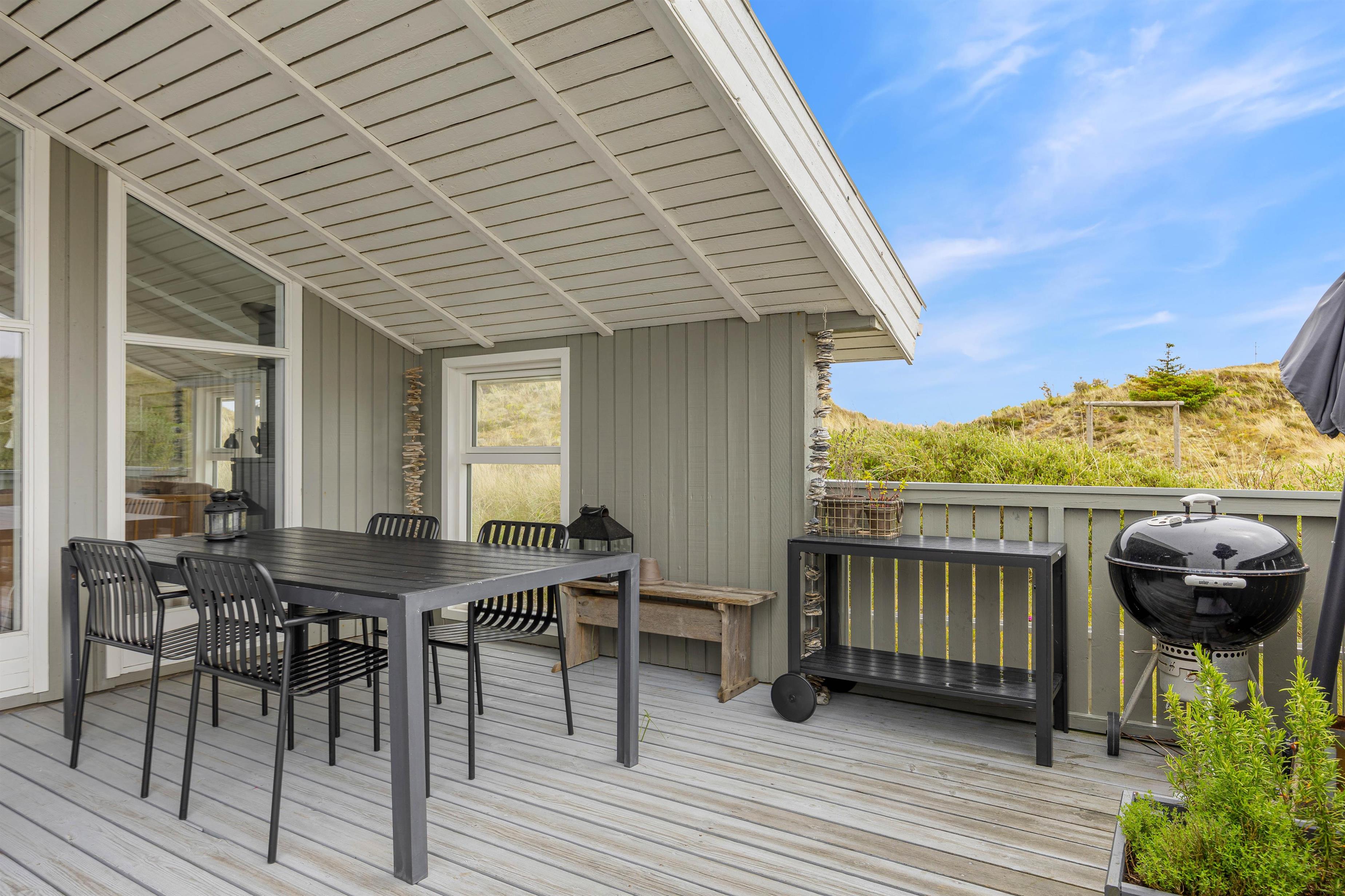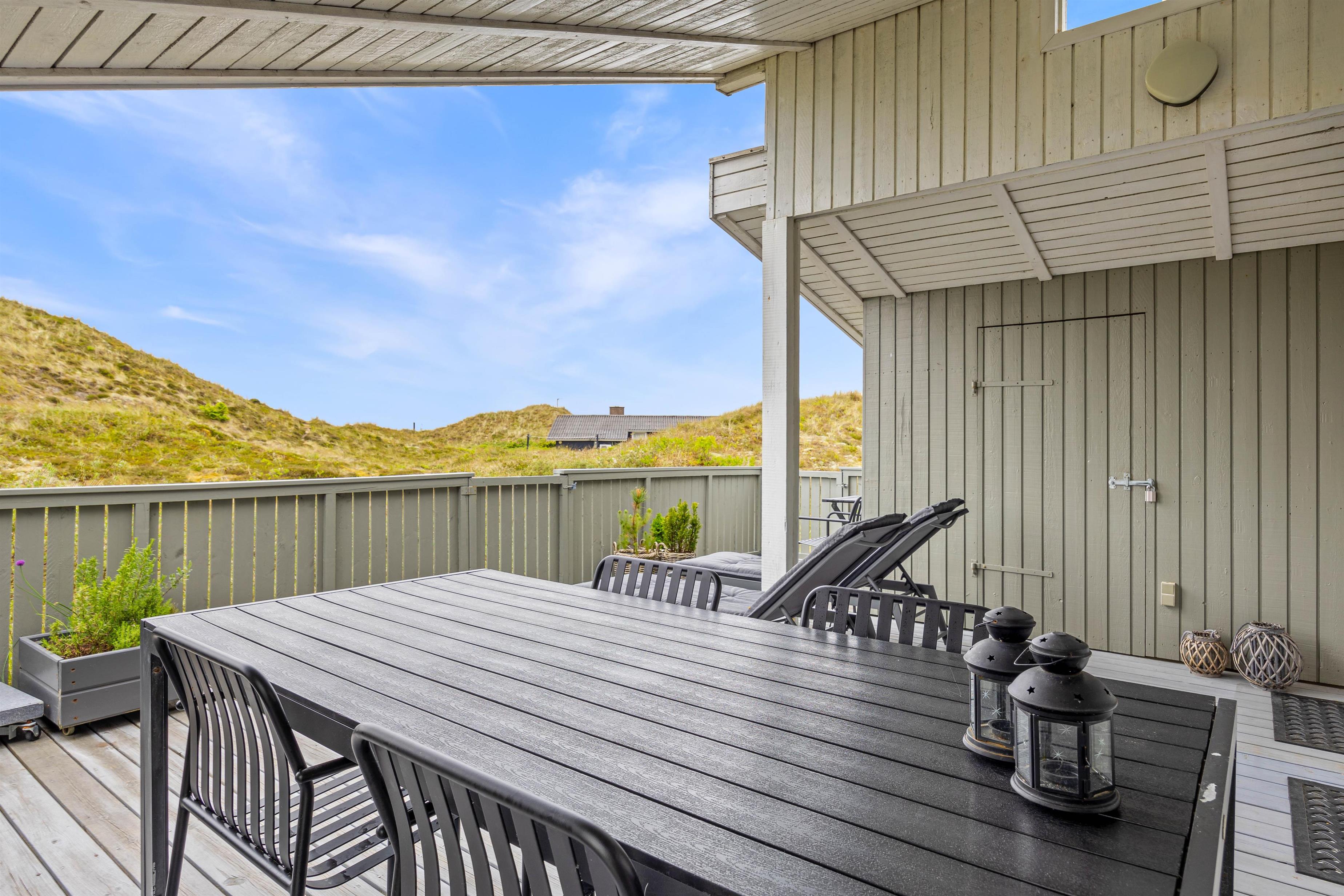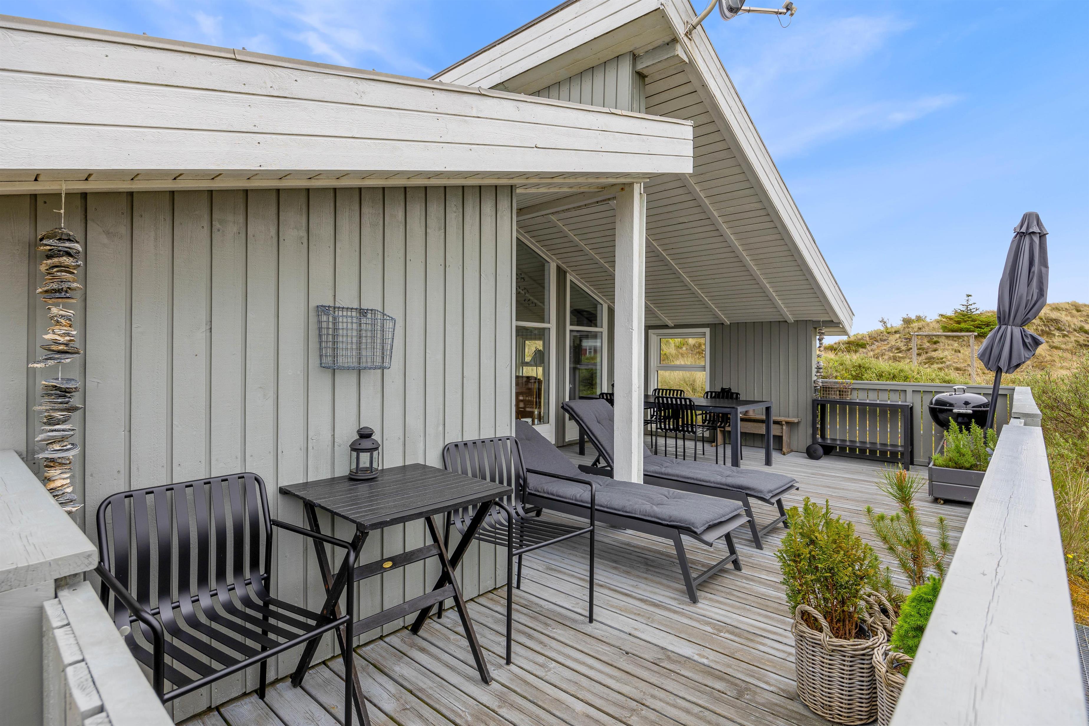 På den lukkede terrasse kan I tilbringe hyggelige timer, og efter en gåtur i den storslåede natur på Holmsland Klit kan I blive godt gennemvarme i feriehusets sauna.