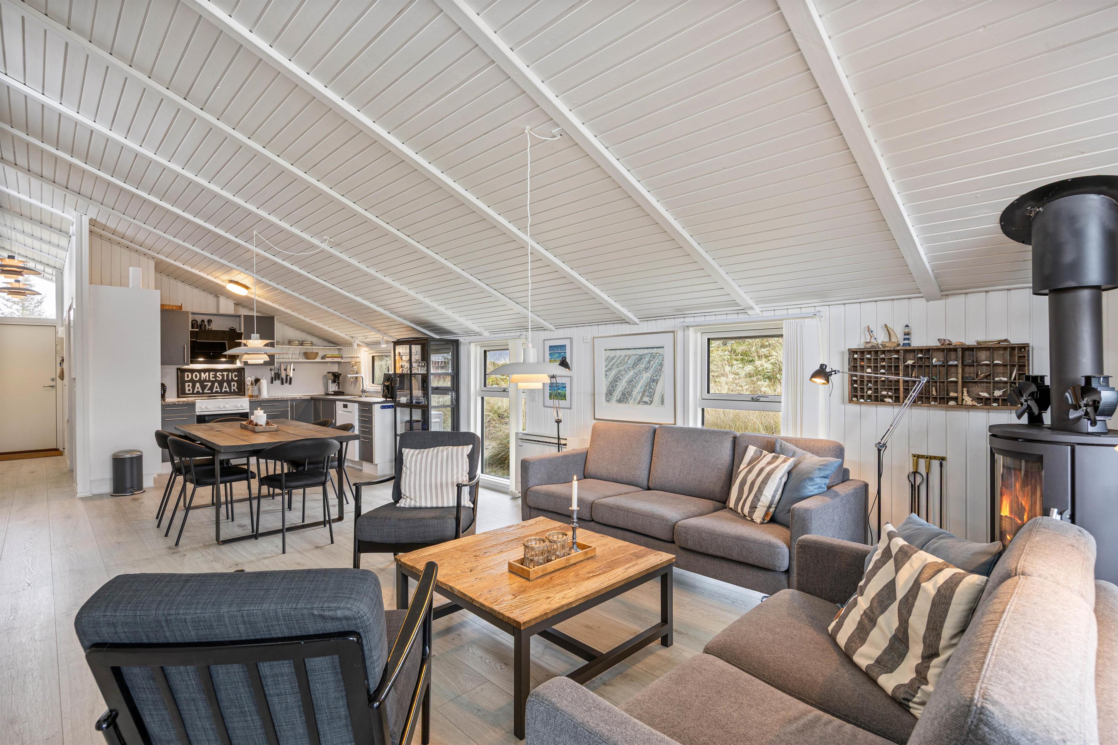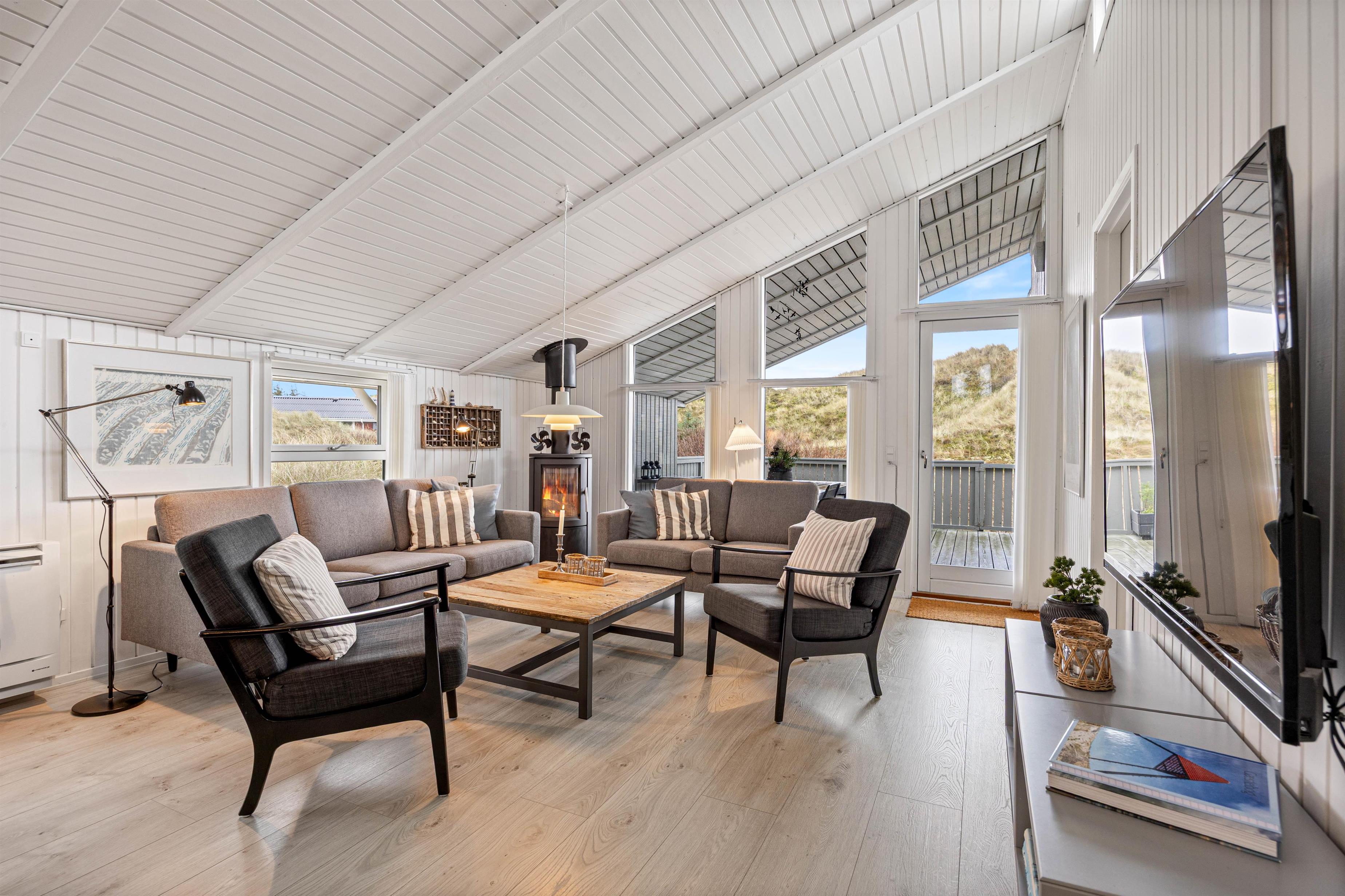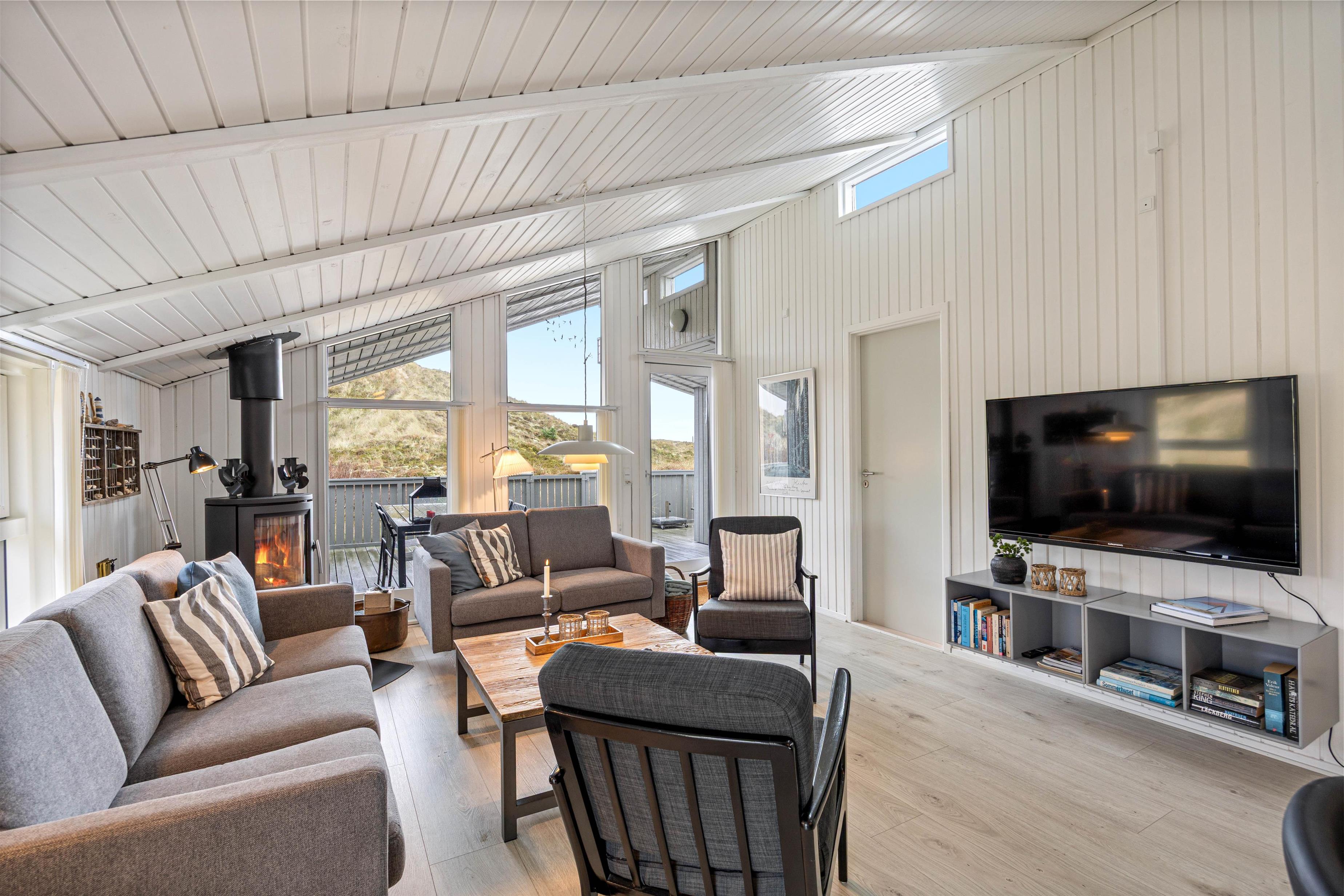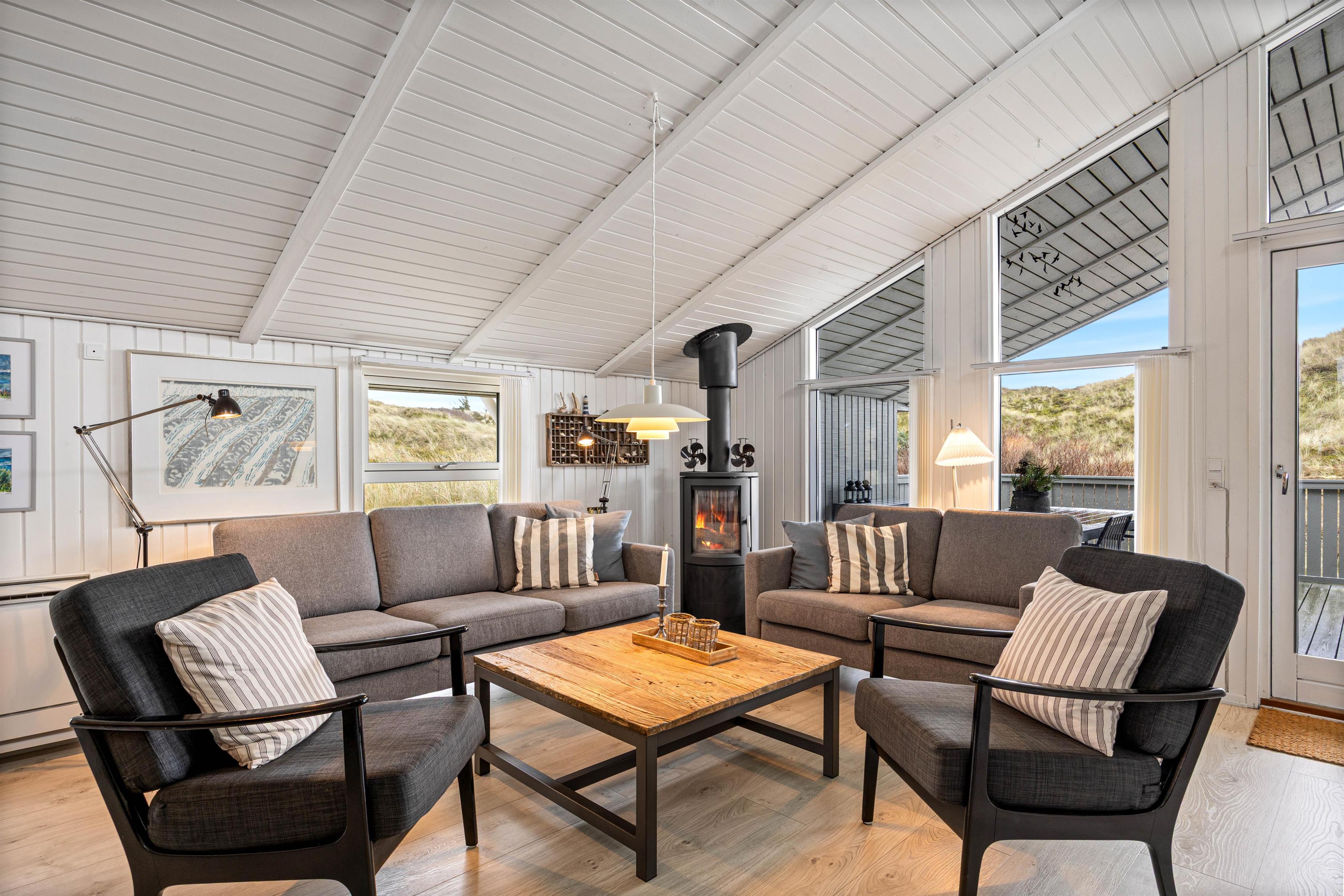 Feriestemningen melder sig straks, I træder ind over dørtrinnet. Midtpunktet er den smukke stue, som er udstyret med en komfortabel sofagruppe, hvor I kan hygge jer foran ilden i brændeovnen. Den energibesparende varmepumpe sørger for en hyggelig varme, selv i de koldere måneder af året.