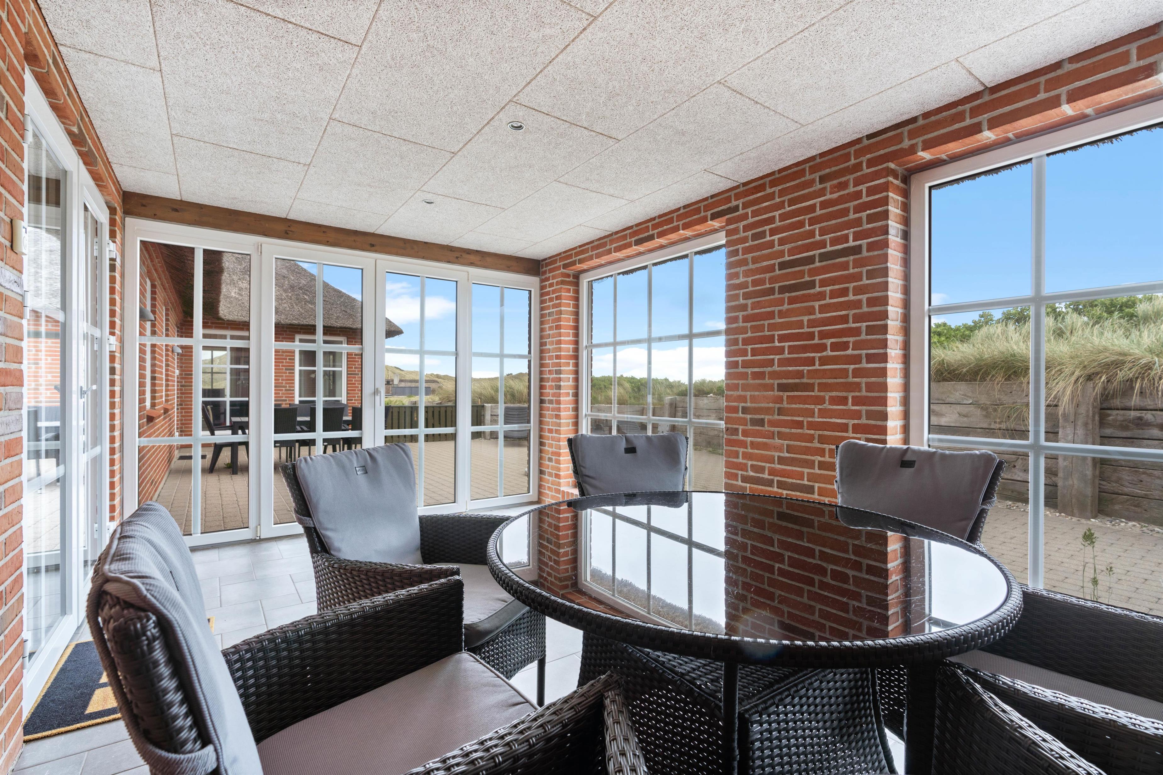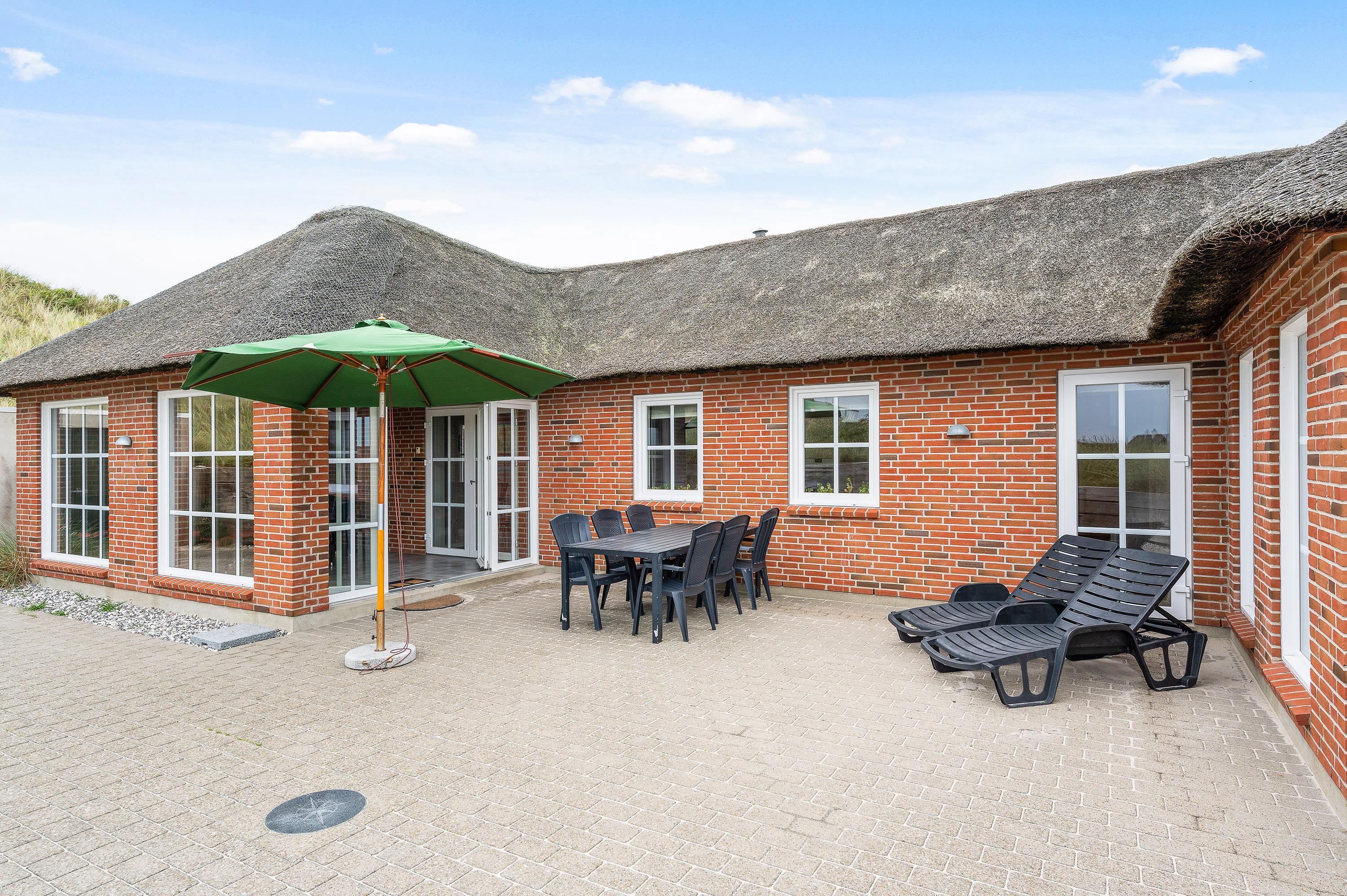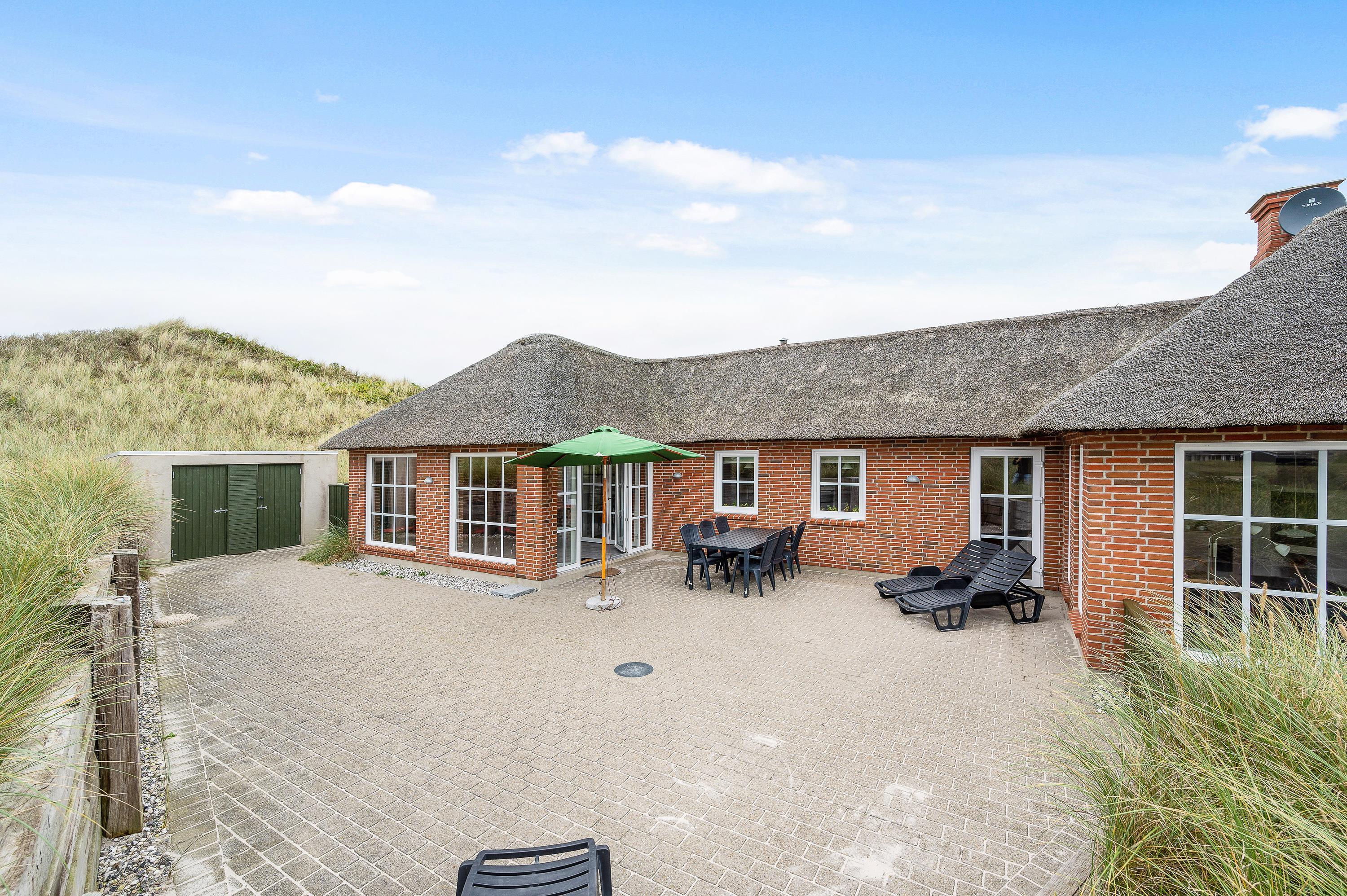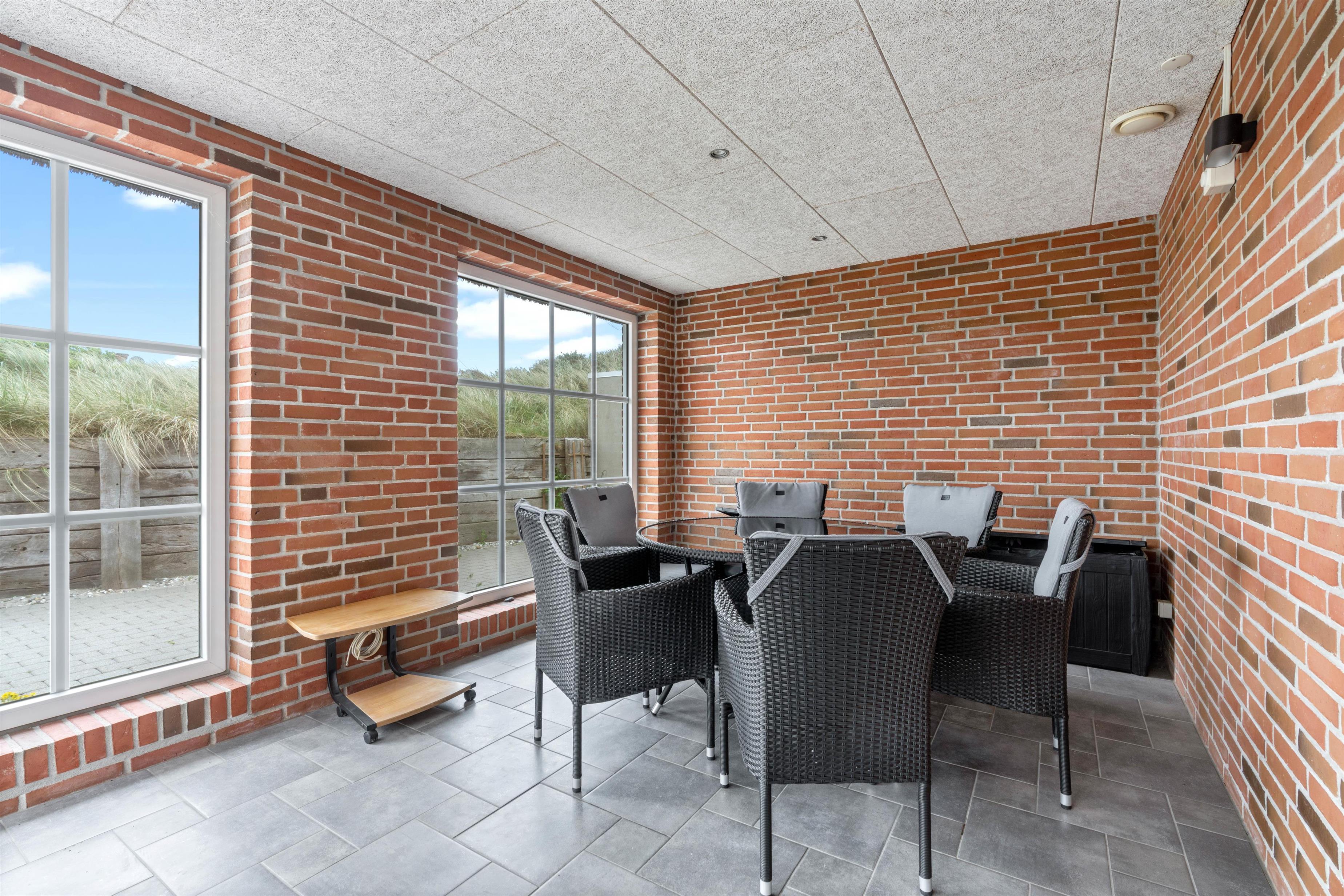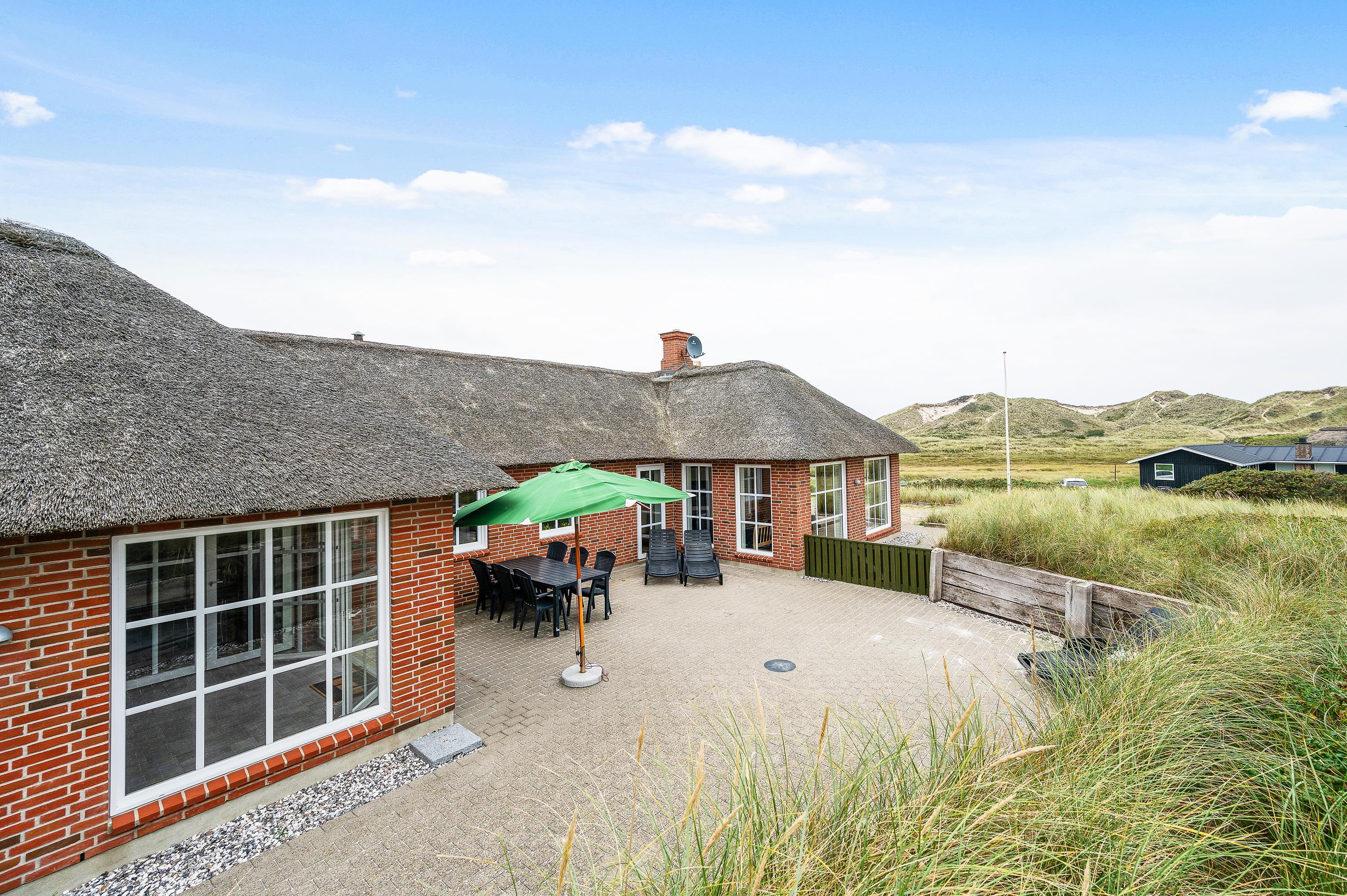Omkring feriehuset har du en dejlig flisebelagt terrasse, så du kan sidde ude og nyde den friske luft. Her vil du næsten altid kunne finde en plads i læ, hvor du kan beundre den smukke natur eller læse en god bog.