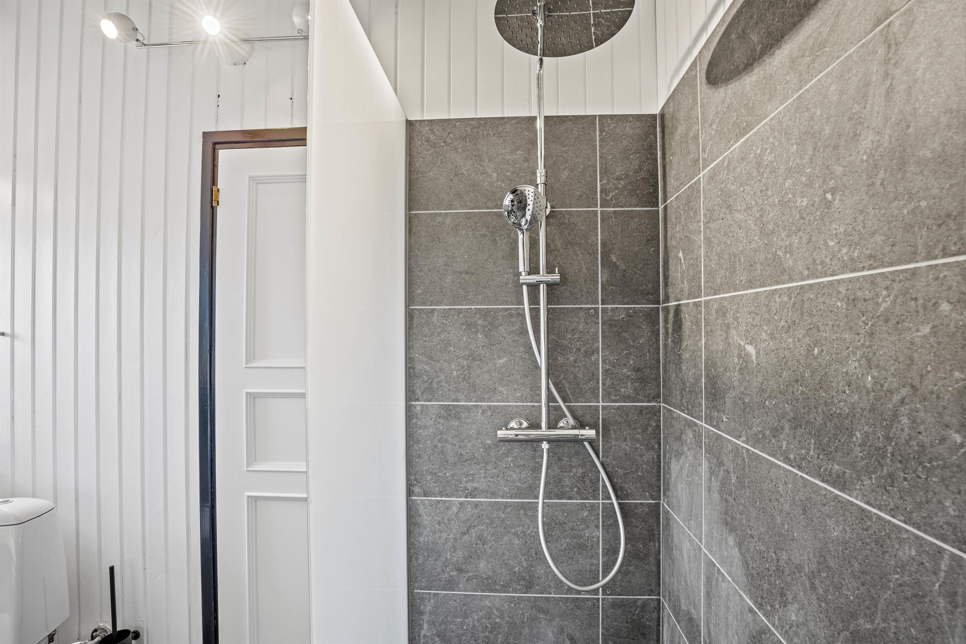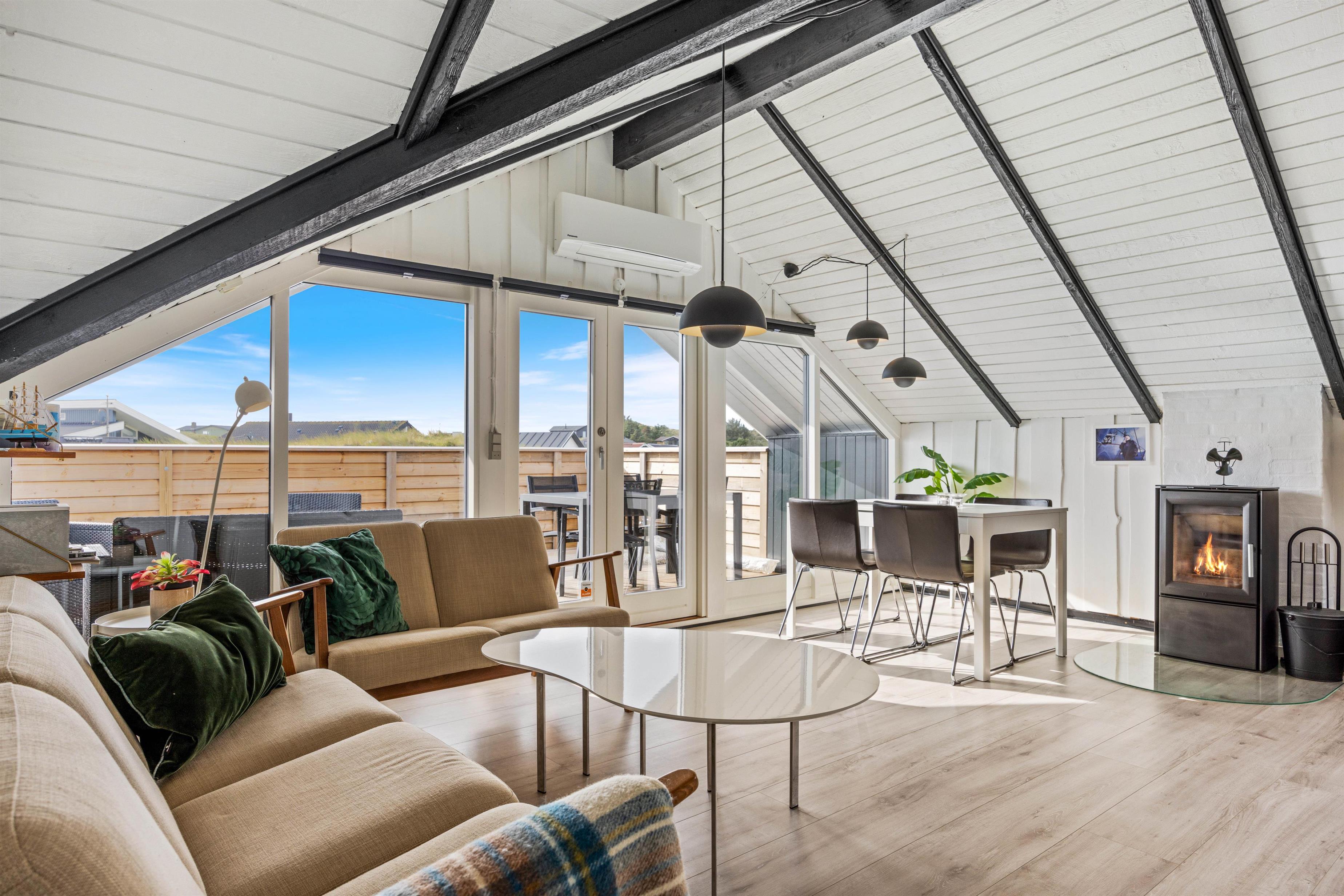 Opholdsrummet er med synlige bjælker og med loft, der går op i kip. På de køligere dage kan I tænde op i brændeovnen og hygge jer i sofaen. I kan med fordel også bruge den energibesparende varmepumpe til at holde temperaturen i rummet behagelig.
