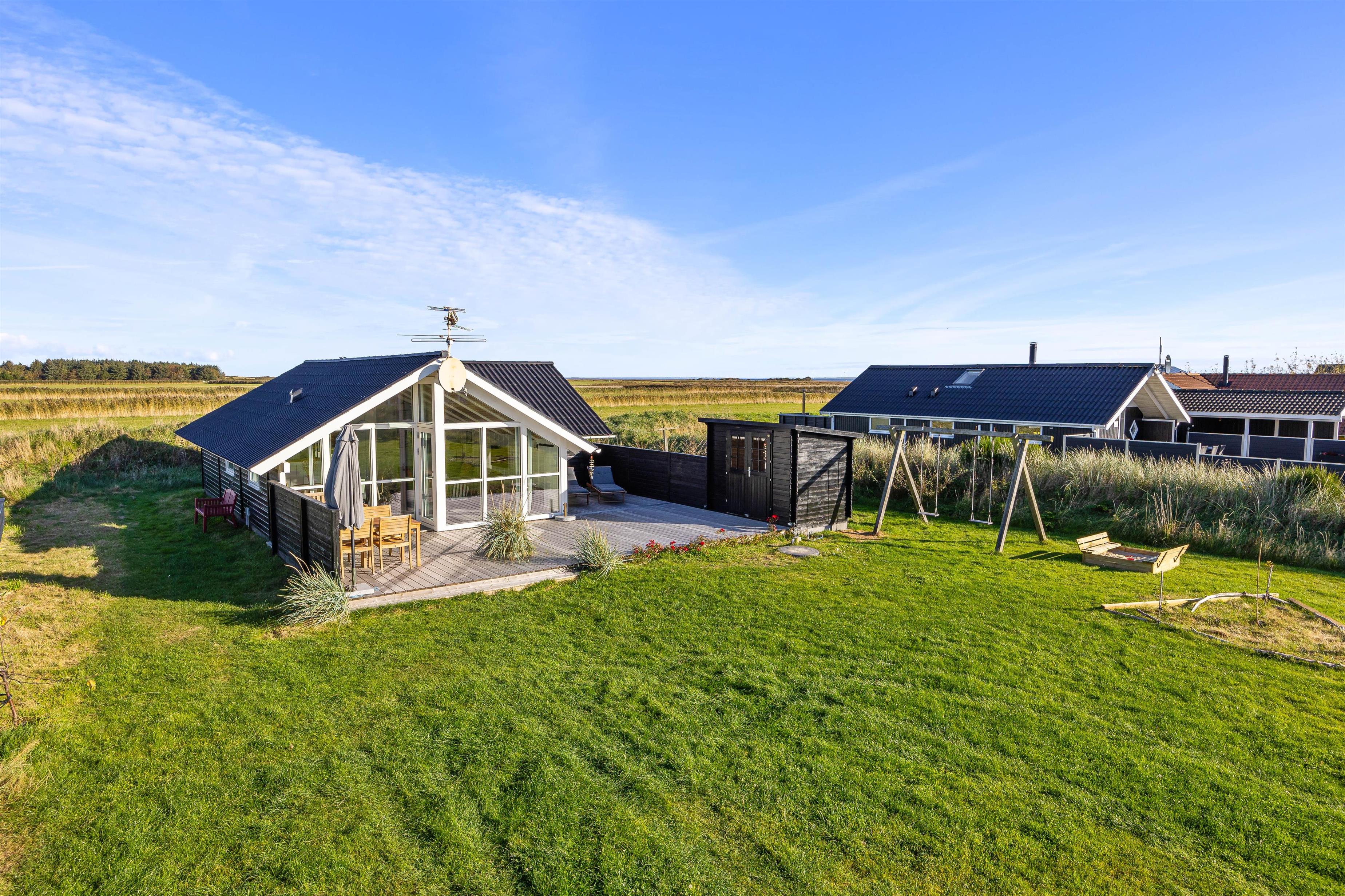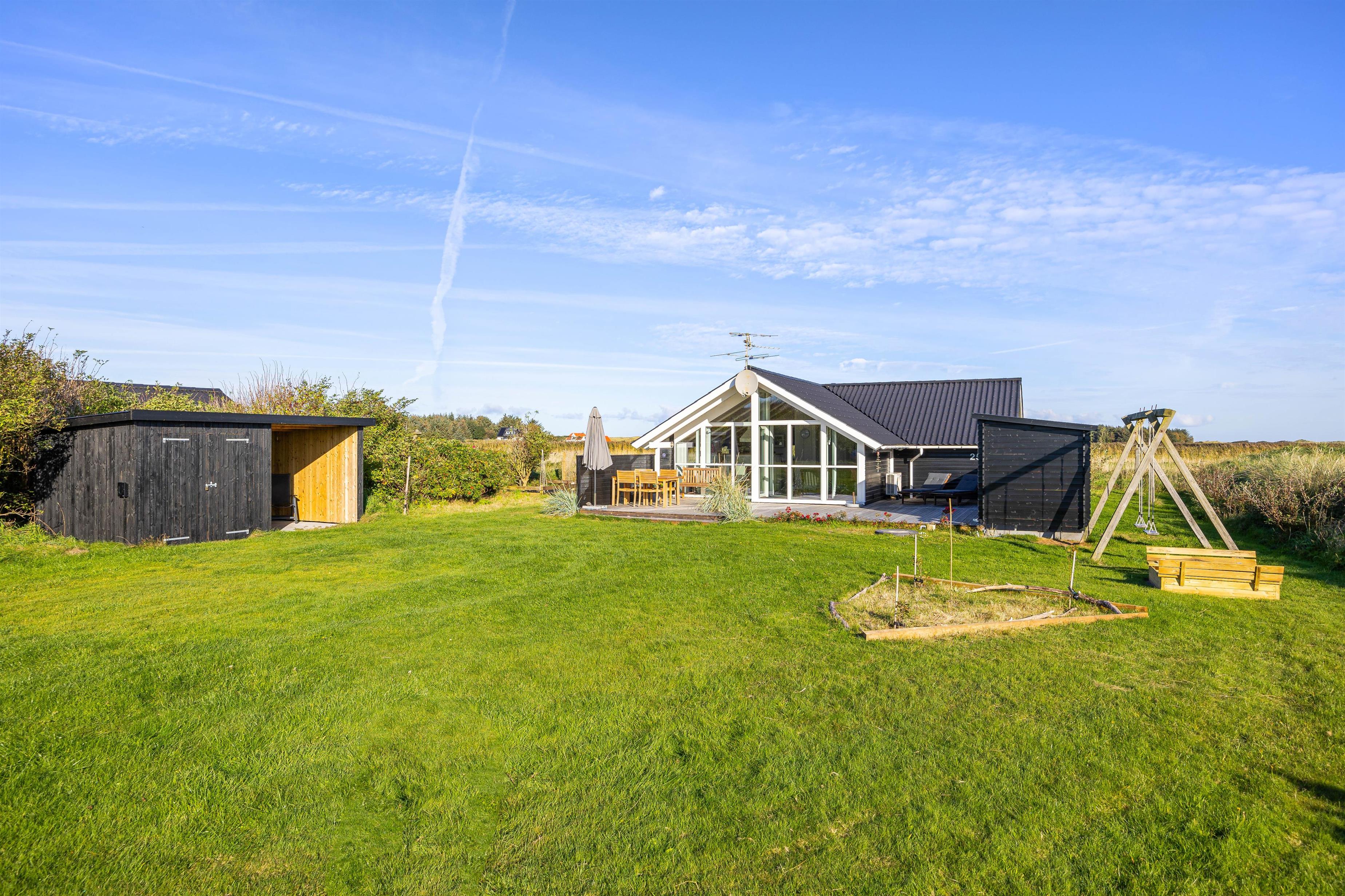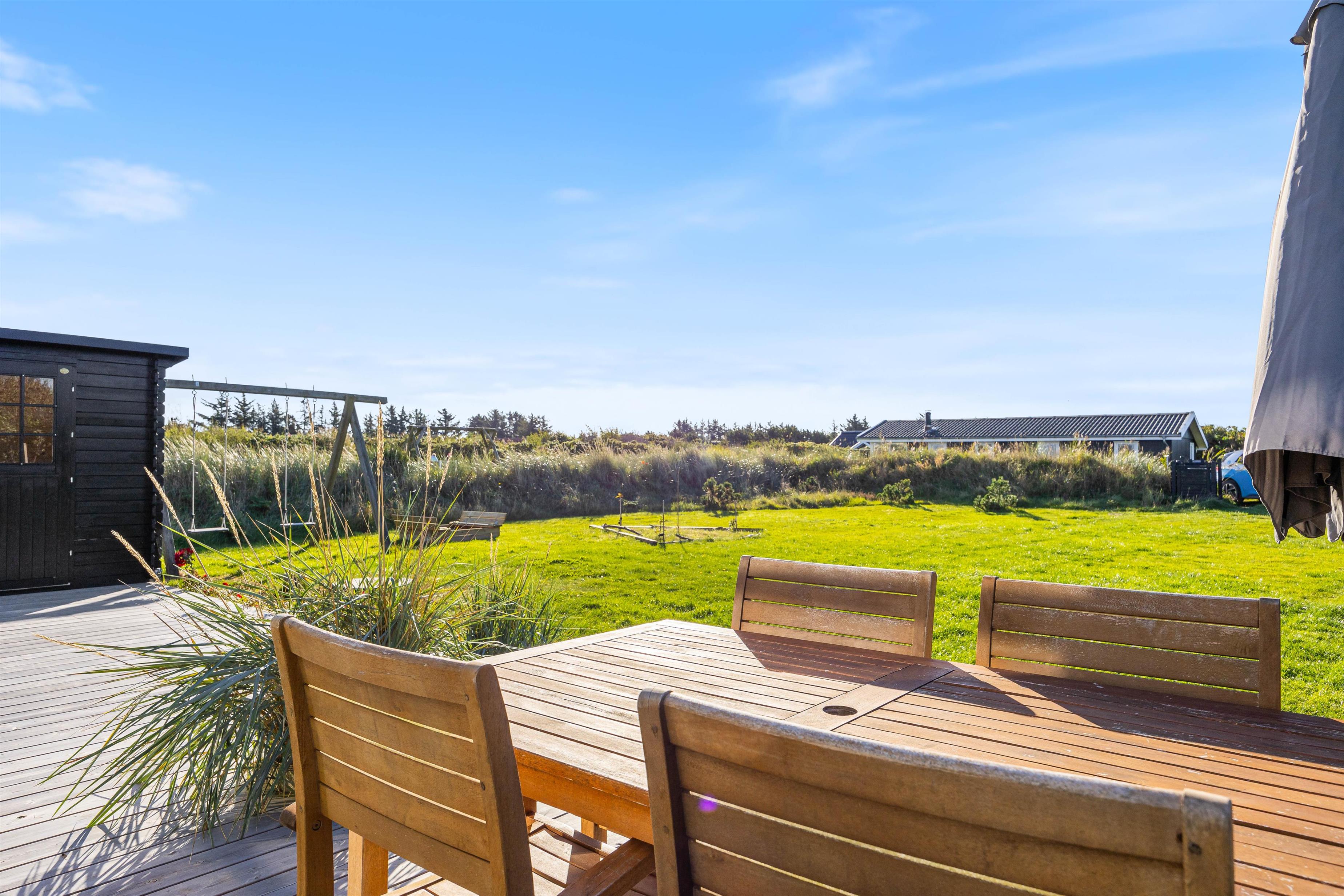 På den store, sydvendte og delvist overdækkede terrasse, kan du læse en god bog på liggestolene eller nyde en god kop kaffe ved havebordet sammen med familien. Du kan nyde sommerens lune aftener udenfor og tilberede lækkert mad på grillen. Med gynge og sandkasse samt en stor plænegrund kan børnene lege og spille hele dagen. Måske et kongespil kan friste familien på en lun sommerdag?