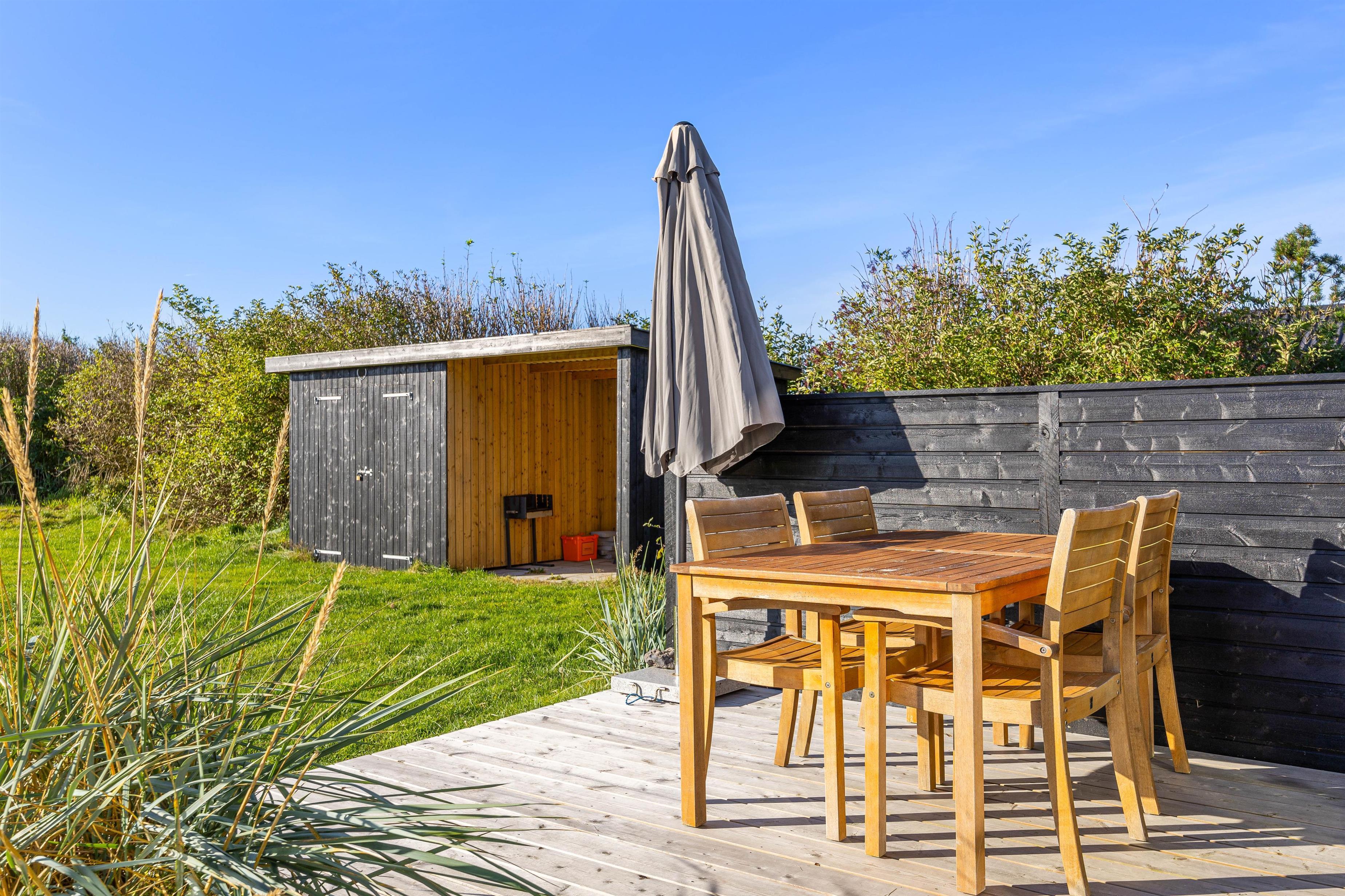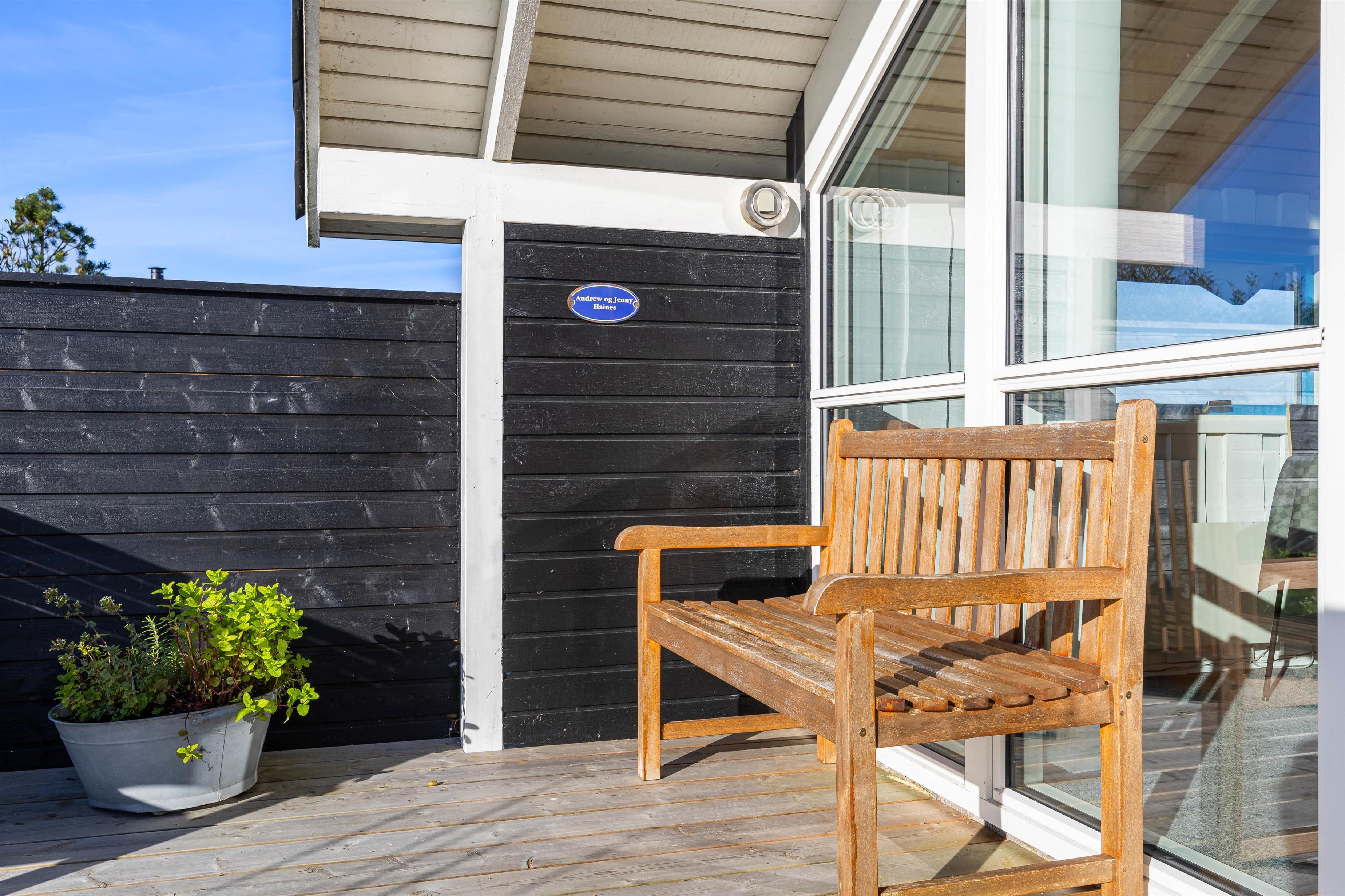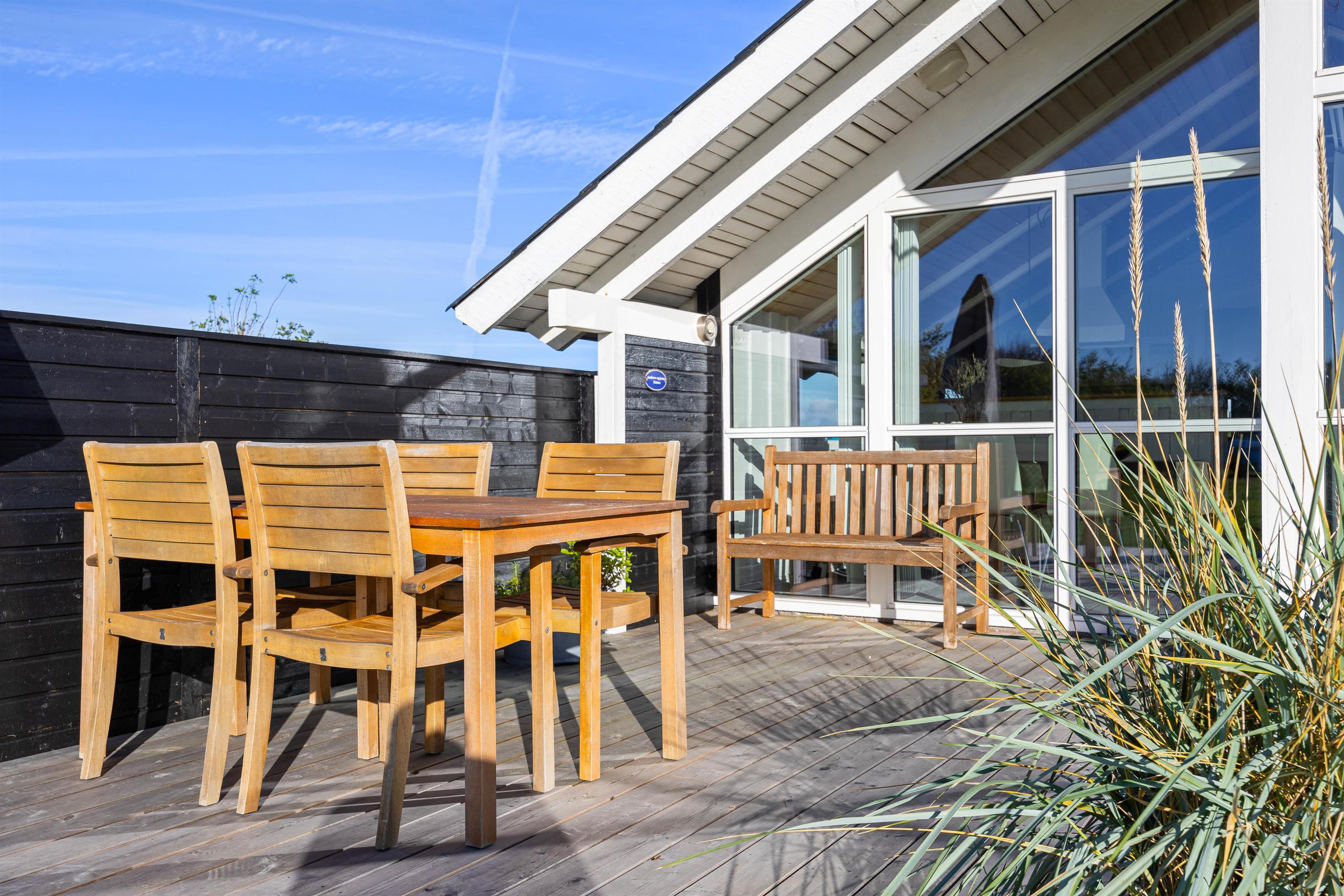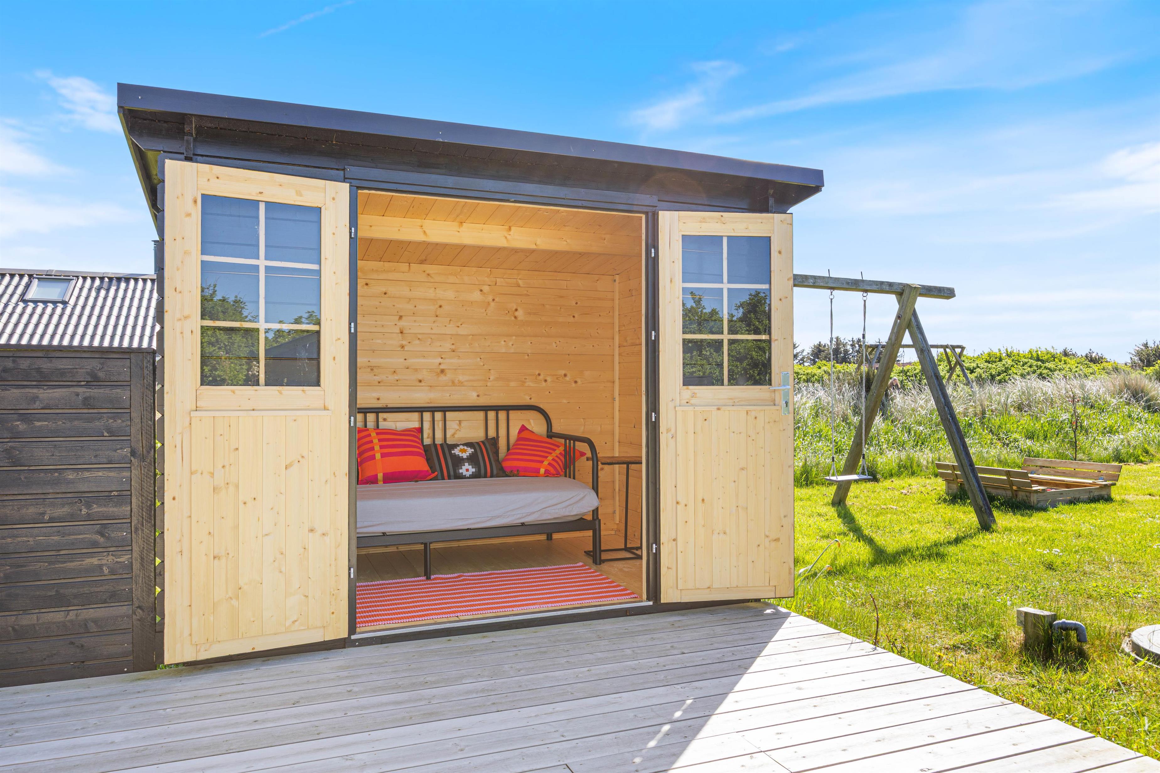 På den store, sydvendte og delvist overdækkede terrasse, kan du læse en god bog på liggestolene eller nyde en god kop kaffe ved havebordet sammen med familien. Du kan nyde sommerens lune aftener udenfor og tilberede lækkert mad på grillen. Med gynge og sandkasse samt en stor plænegrund kan børnene lege og spille hele dagen. Måske et kongespil kan friste familien på en lun sommerdag?