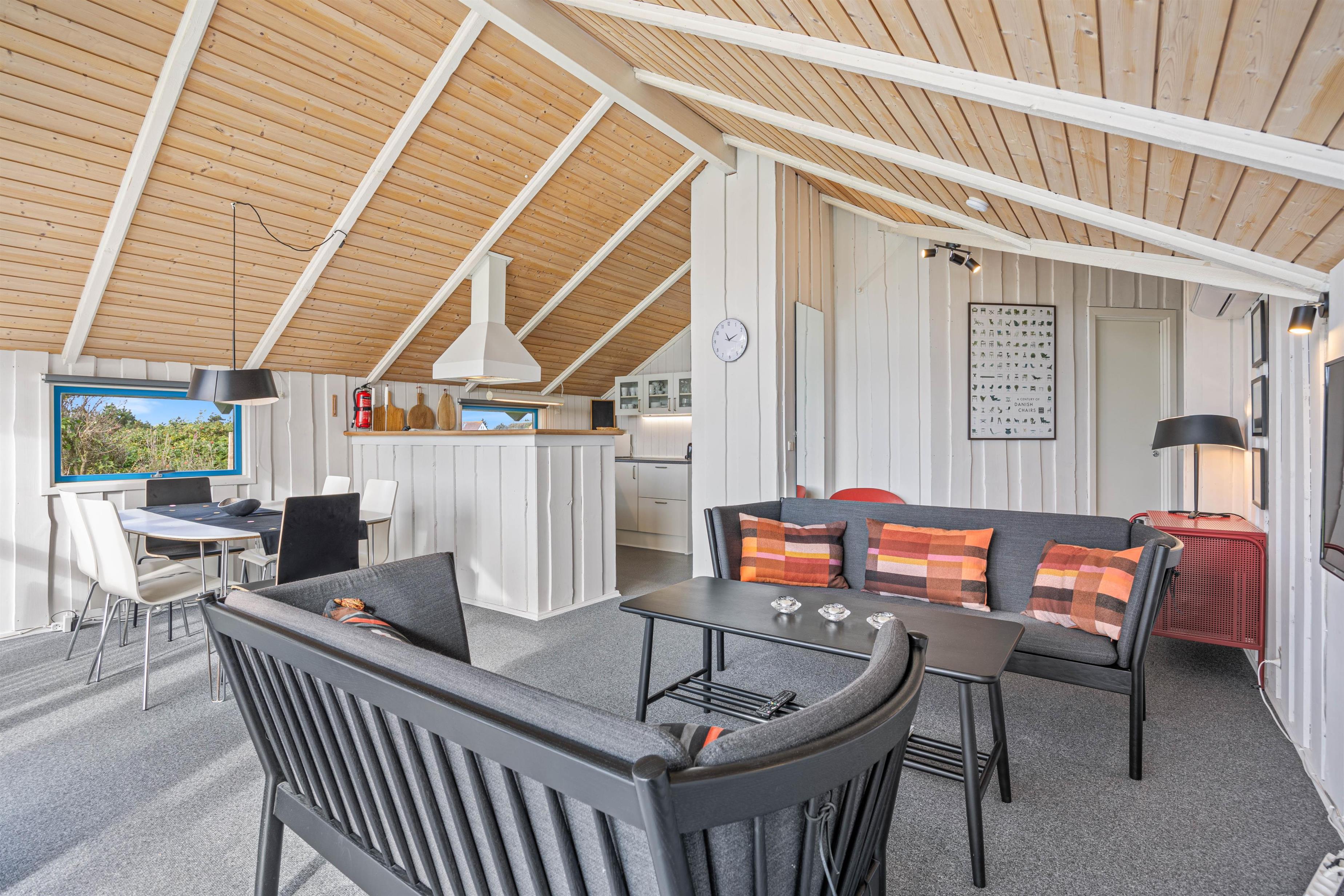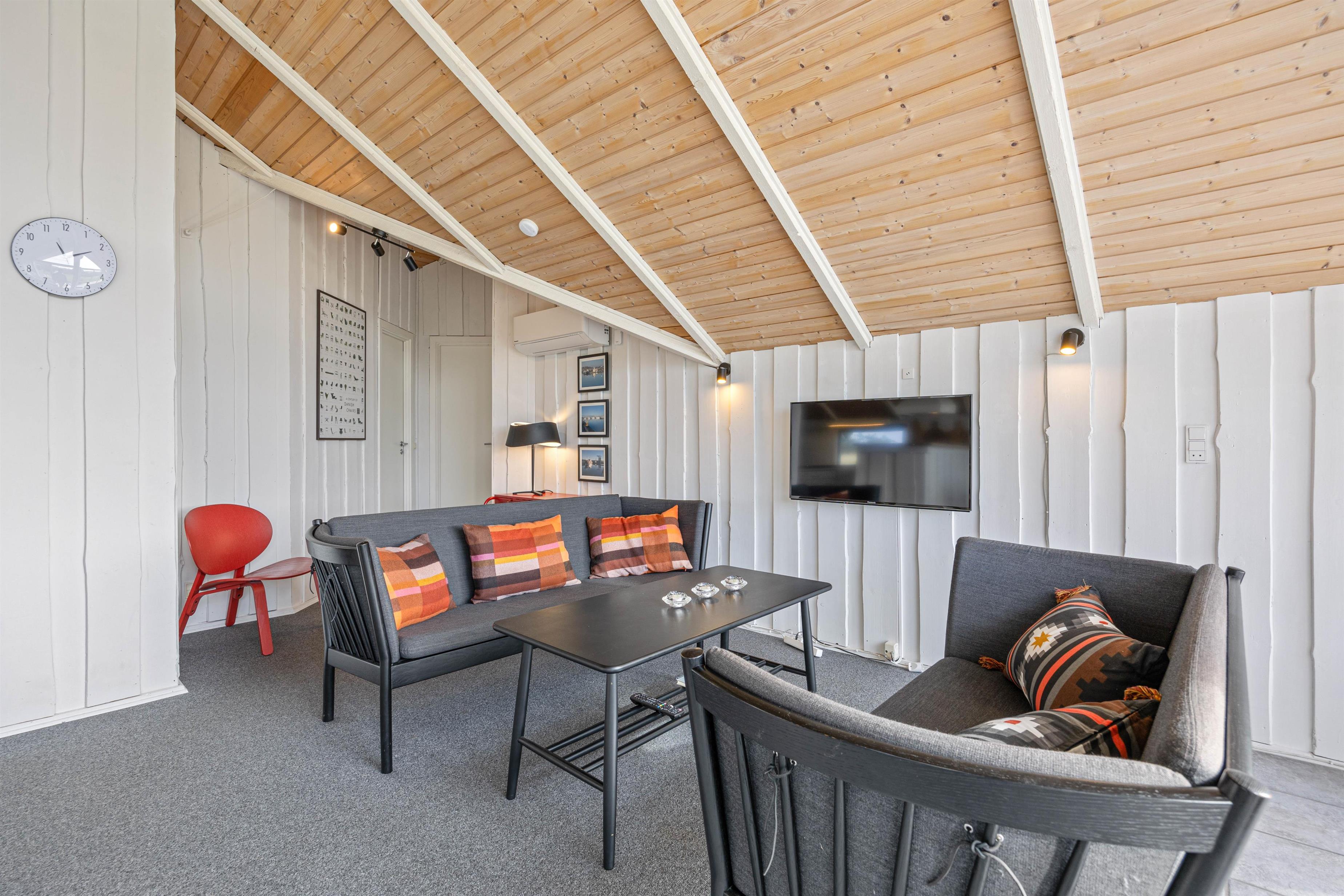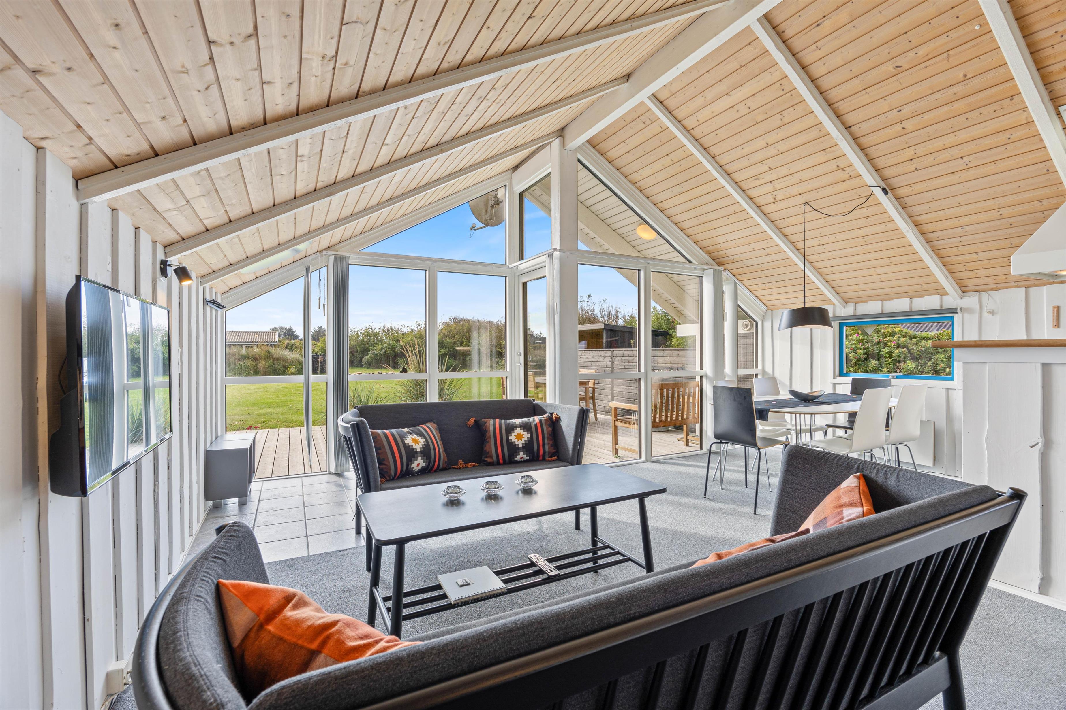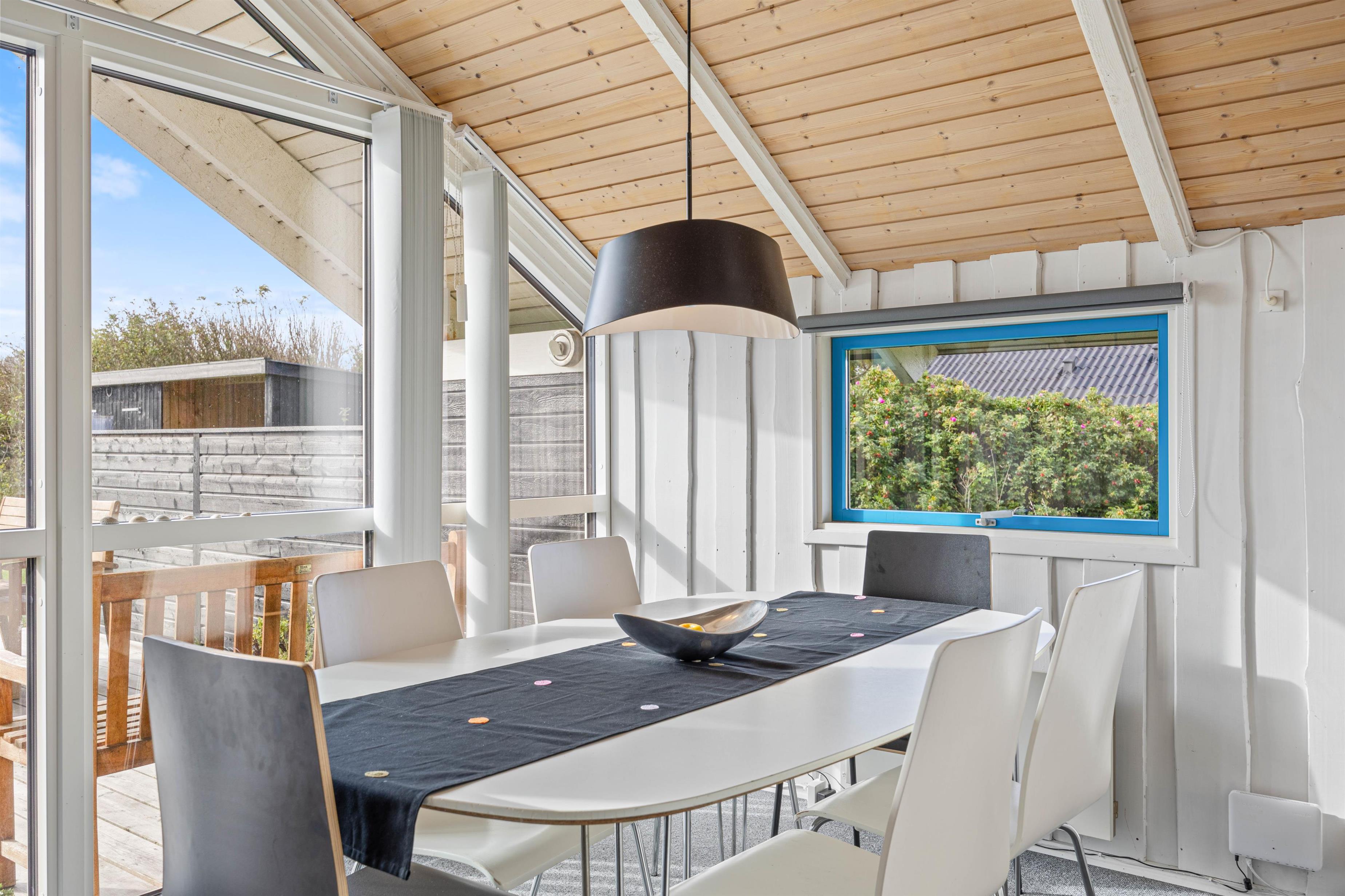 Fra de store panoramavinduer kommer det meget flotte lysindfald ind, og man ser de smukke lofter, som er op i kip. Et dejligt spiseområde, som indbyder til brætspil og familiær hygge, mens I nyder et koldt glas vin eller en god kop kaffe. Den energibesparende varmepumpe kan tændes på de kolde dage.