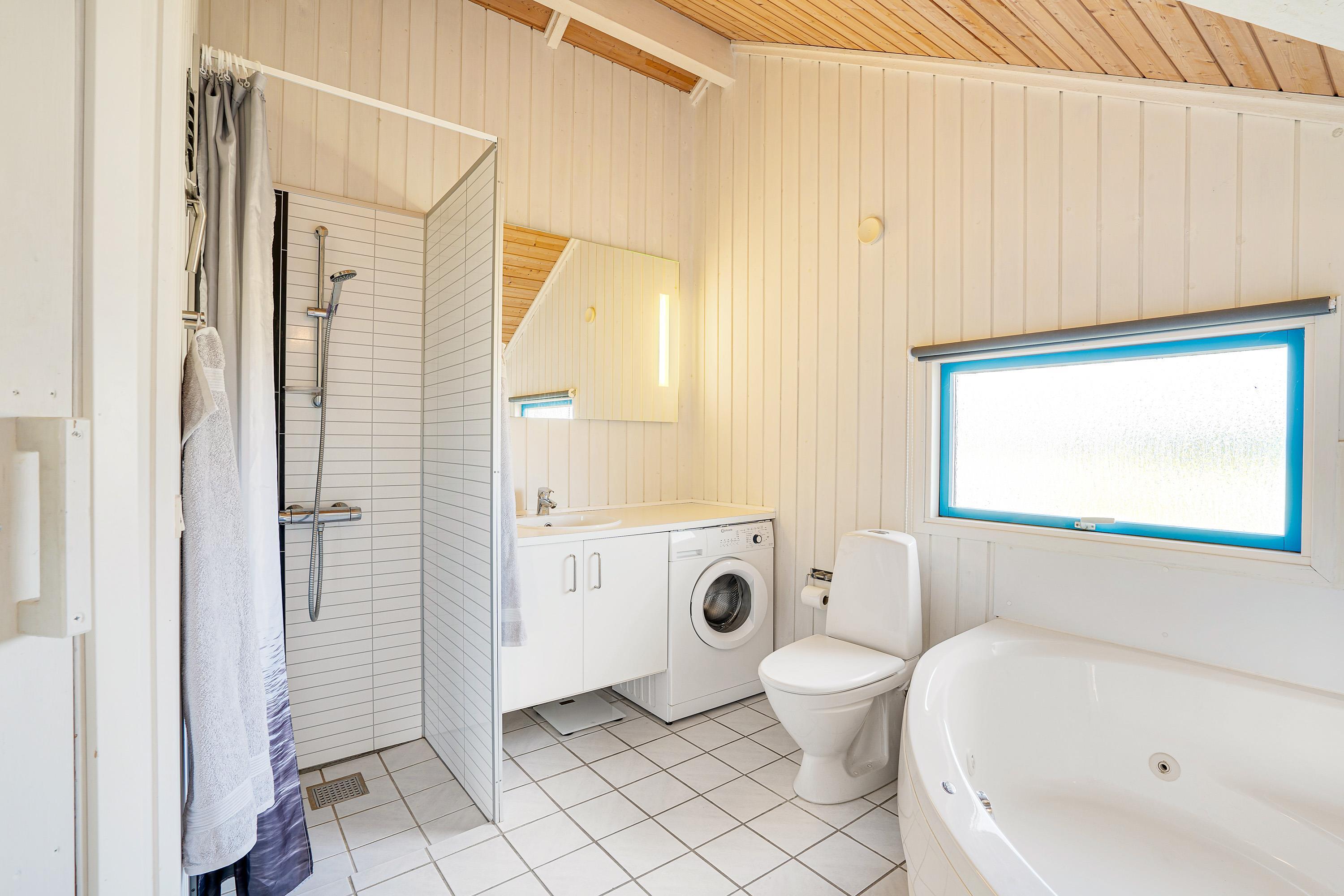I det lyse og venlige badeværelse er der vaskemaskine, som vil give jer mulighed for at vaske håndklæder til næste dags strandture. Efter en dejlig dag på stranden, kan spaen nydes sammen med familien. Eller I kan sætte jer ind i saunaen, efter en skøn gåtur i vores smukke natur og nyde varmen strømme gennem hele kroppen.
