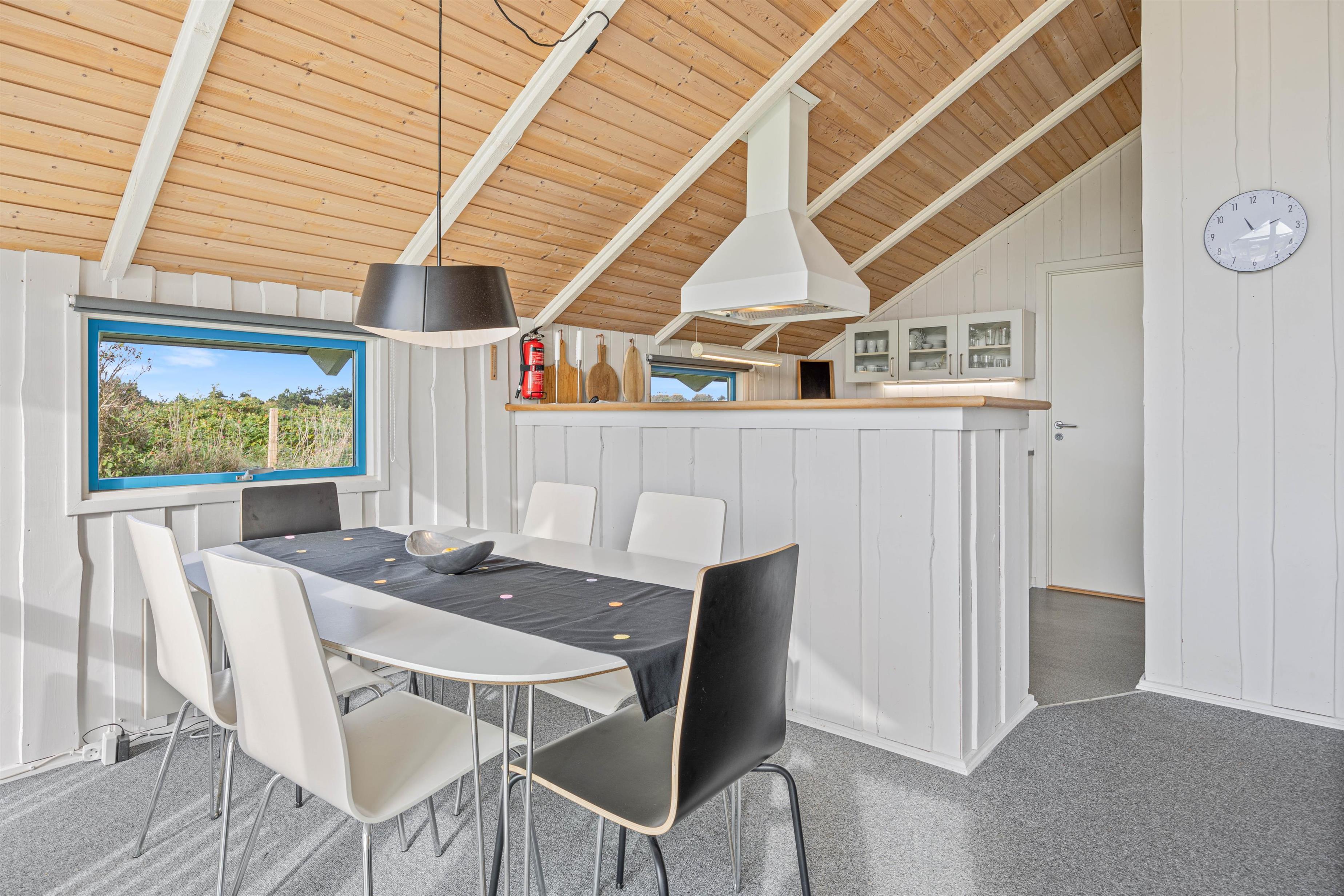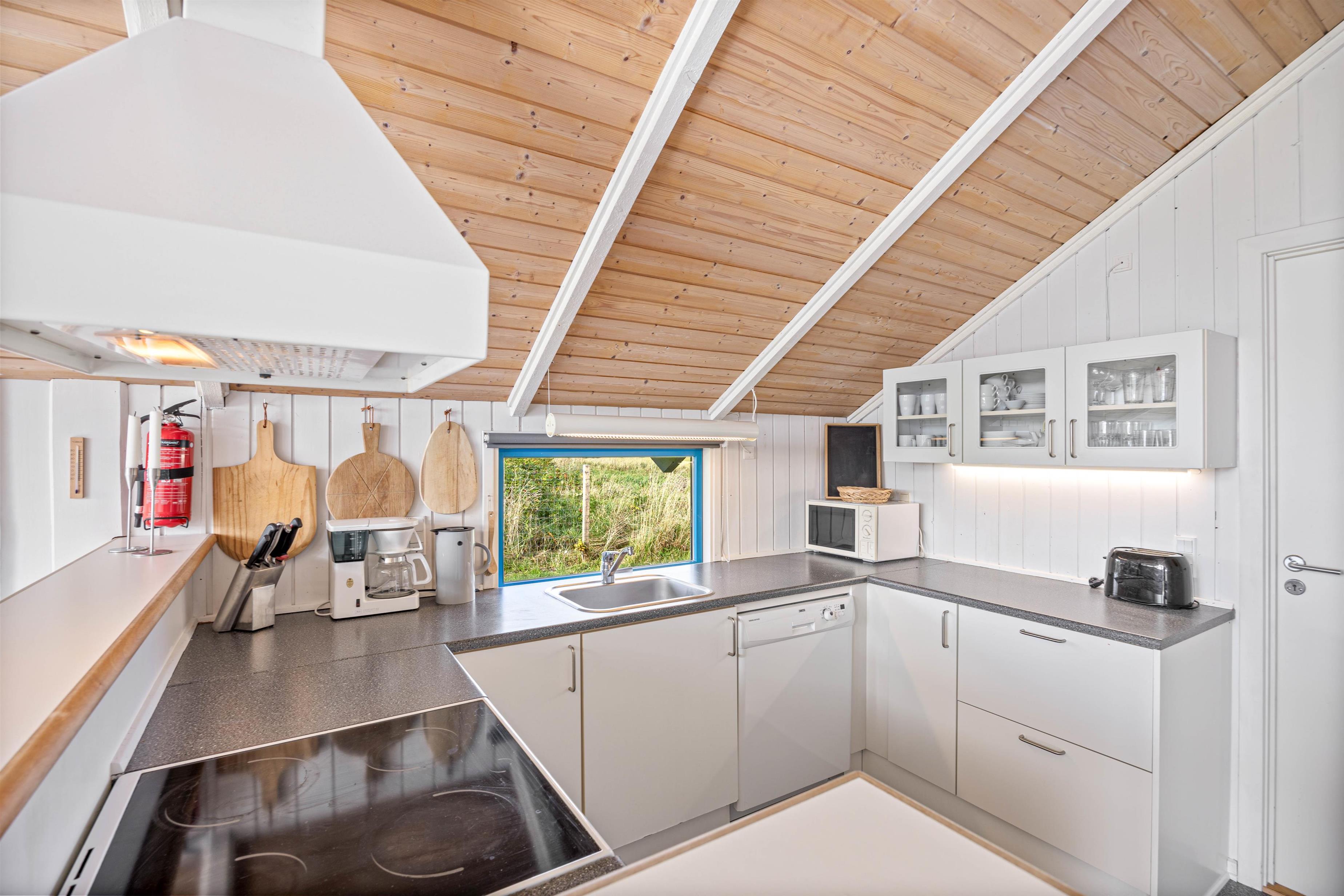 Feriehuset indbyder til en dejlig, afslappende familieferie. Køkkenet ligger i åben forbindelse med stuen og spisestuen og her kan familien være tæt sammen, også når du forbereder en lækker aftensmad. I køkkenet finder du opvaskemaskine og mikroovn samt en separat fryser (80l).