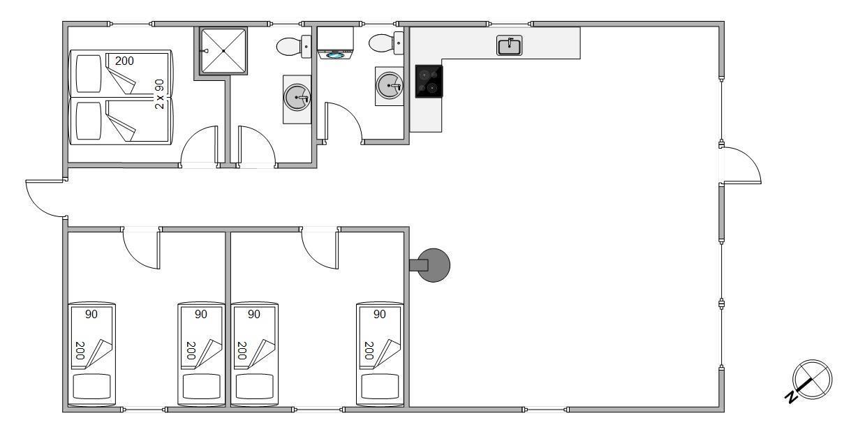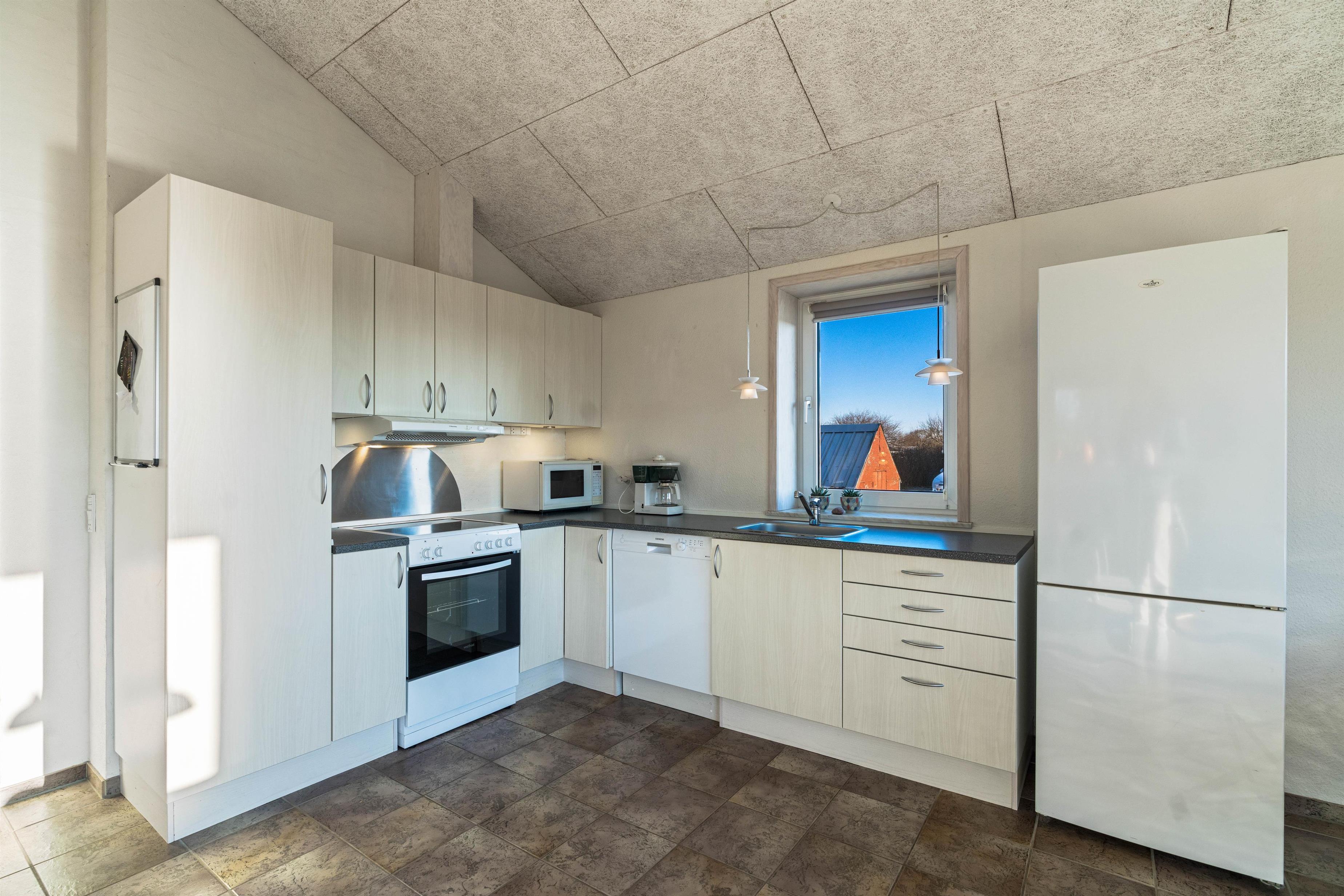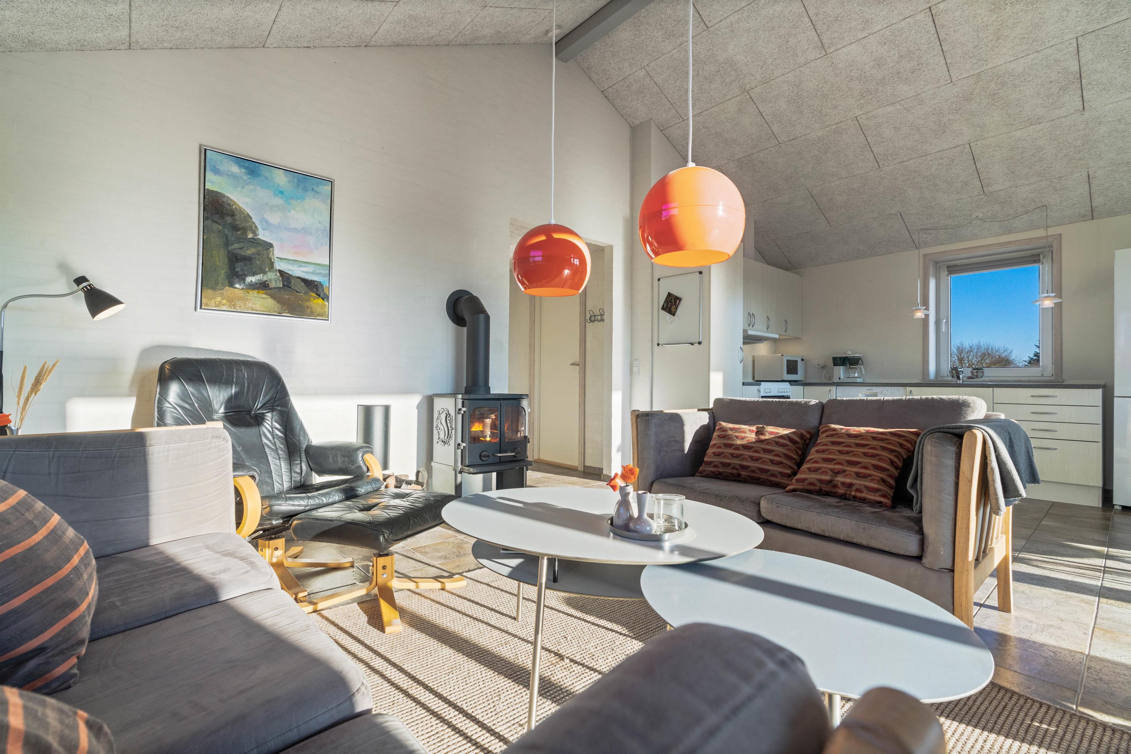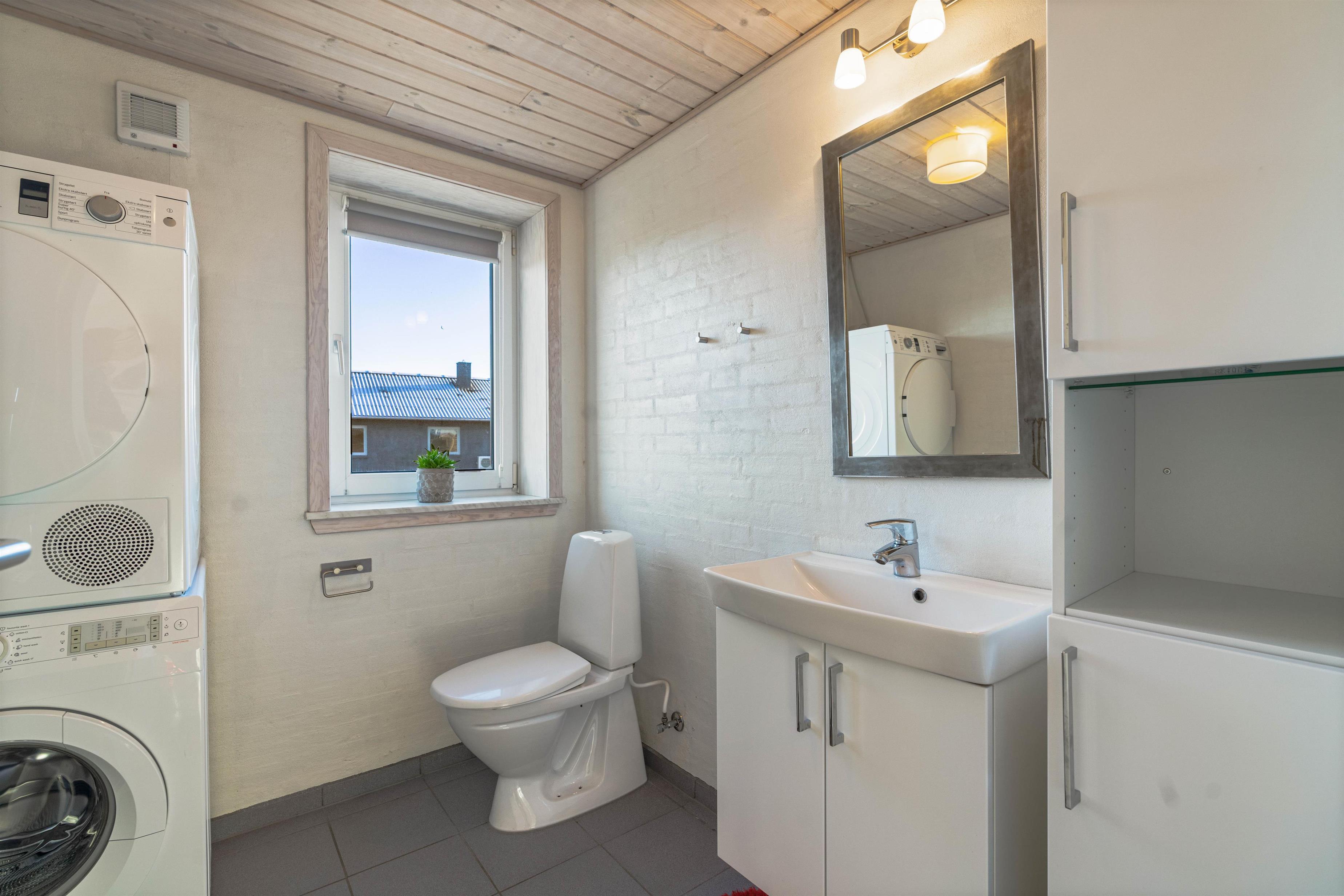 Sommerhusets hjerte har et fint åbent køkken, spiseafdelingen og en hyggelig stue – så uanset om der laves mad, spilles spil eller slappes af med en god film, så kan familien være samlet her. Her er højt til loftet, hvilket sammen med vinduespartiet i syd skaber en dejlig rummelig fornemmelse. Varmepumpen sørger for et komfortabelt indeklima samtidig med at være energibesparende. På toilettet er en vaskesøjle med vaskemaskine og tørretumbler installeret – det gør dét ekstra nemt at være på ferie og superpraktisk, hvis håndklæderne skal vaskes undervejs.
