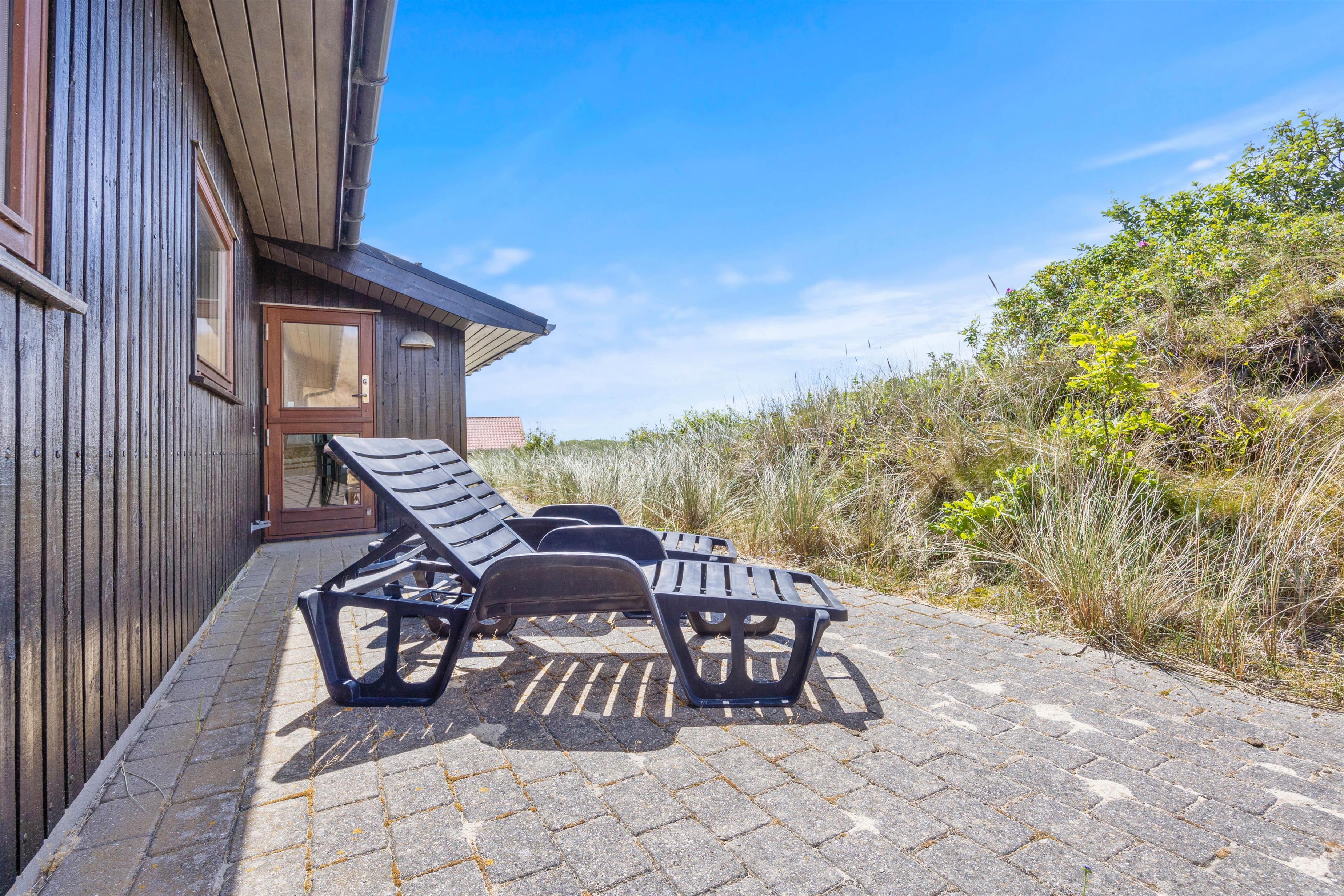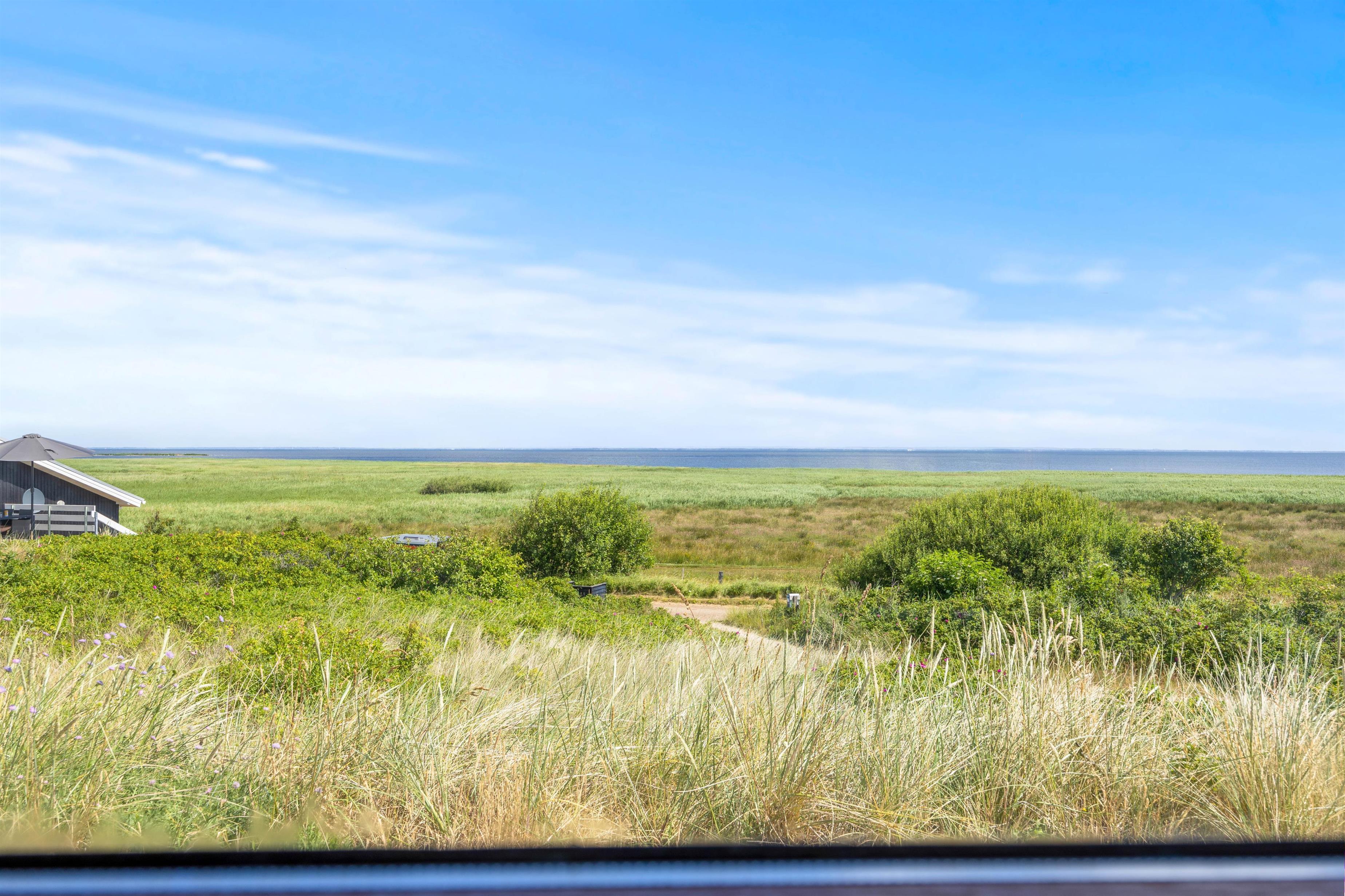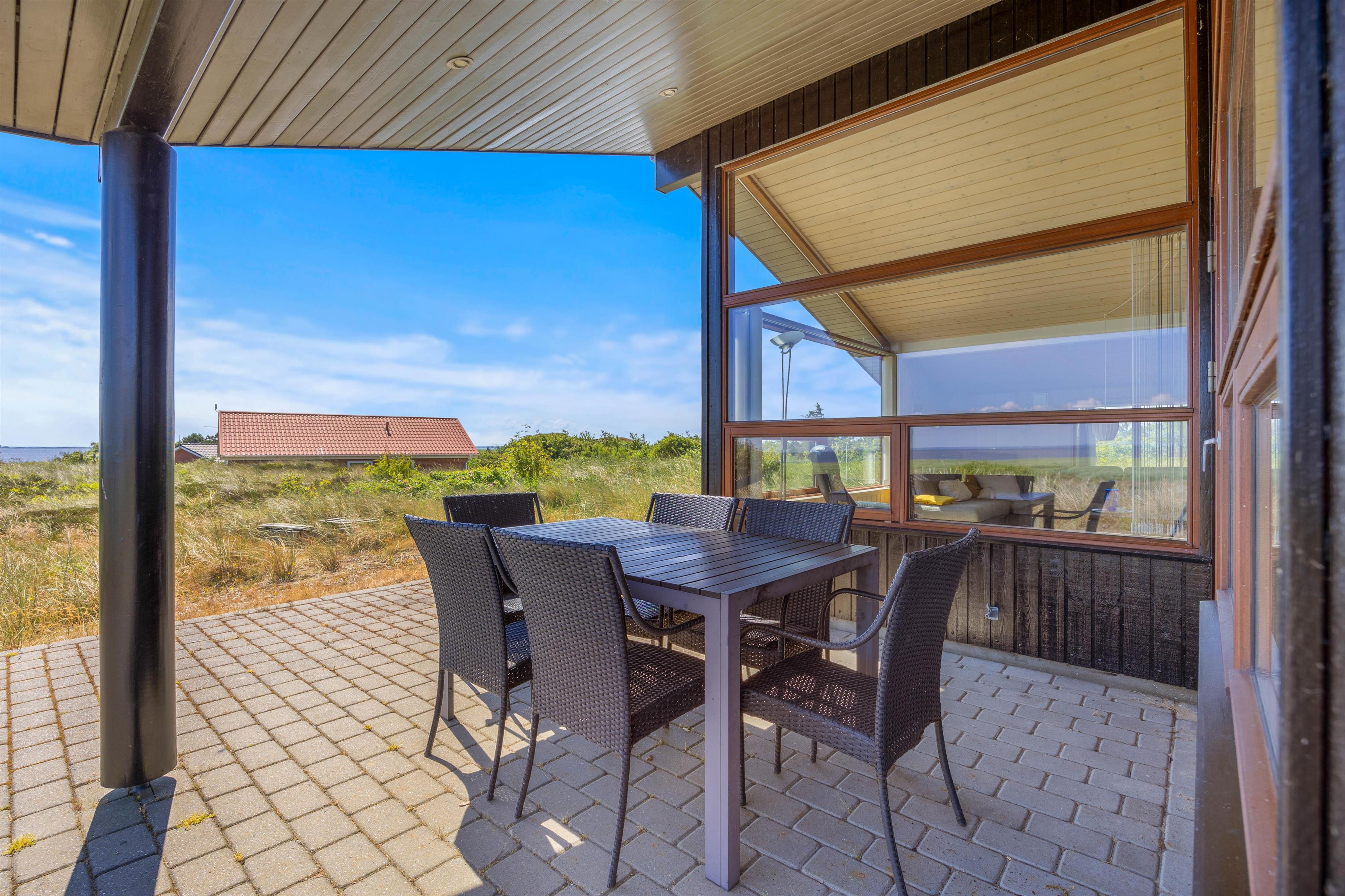 Beliggenheden af sommerhuset er bestemt ikke til at klage over. På en lille forhøjning på den store 2800 m2 grund har I udover fjordudsigt også udsigt over den skønne vestjyske natur. På terrassen venter liggestole og havemøbler på jer, så I kan nyde de varme solskinstimer. Har I brug for at sidde lidt i skyggen, har I også mulighed for dette på den delvist afskærmede og delvist overdækkede terrasse.