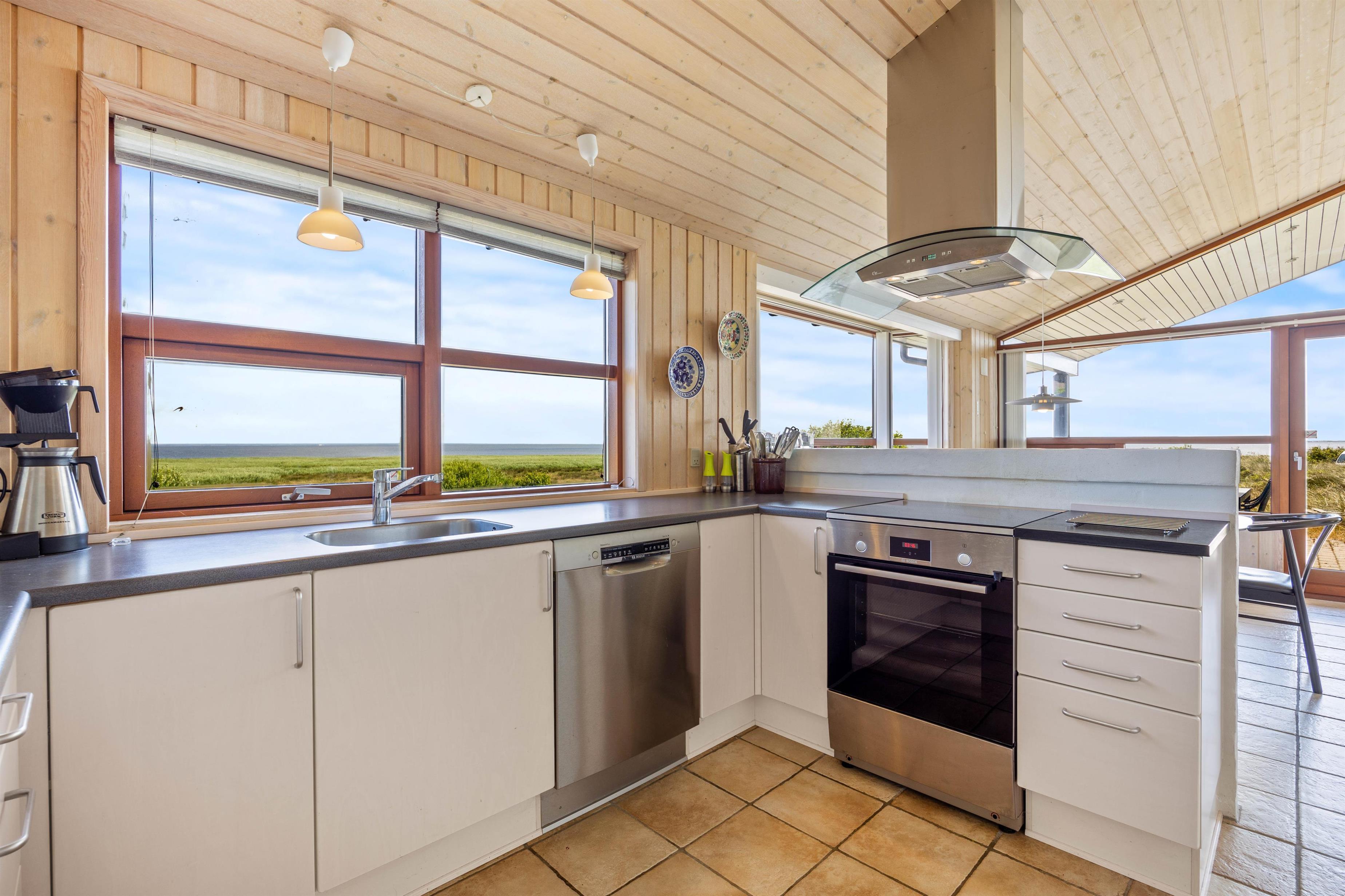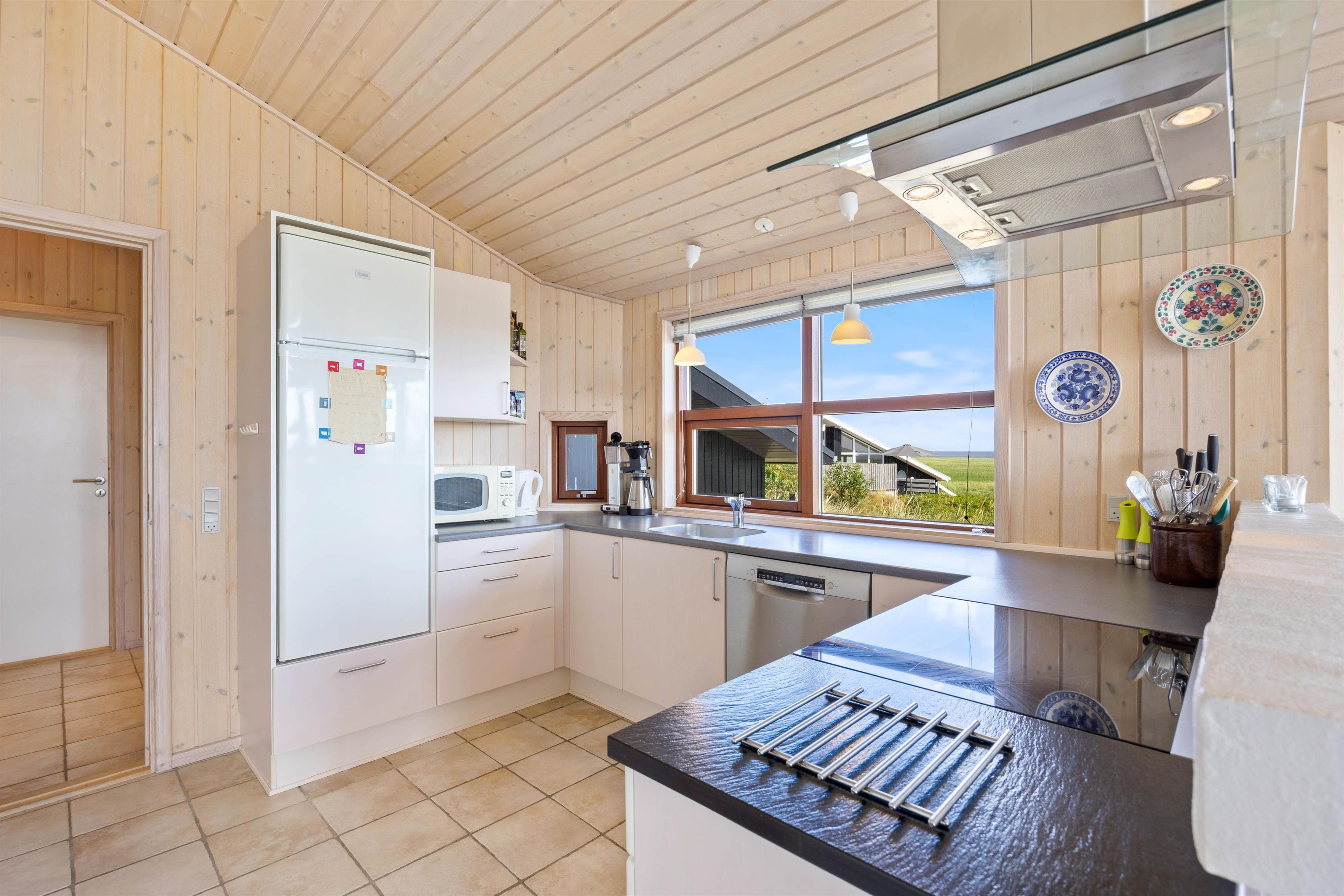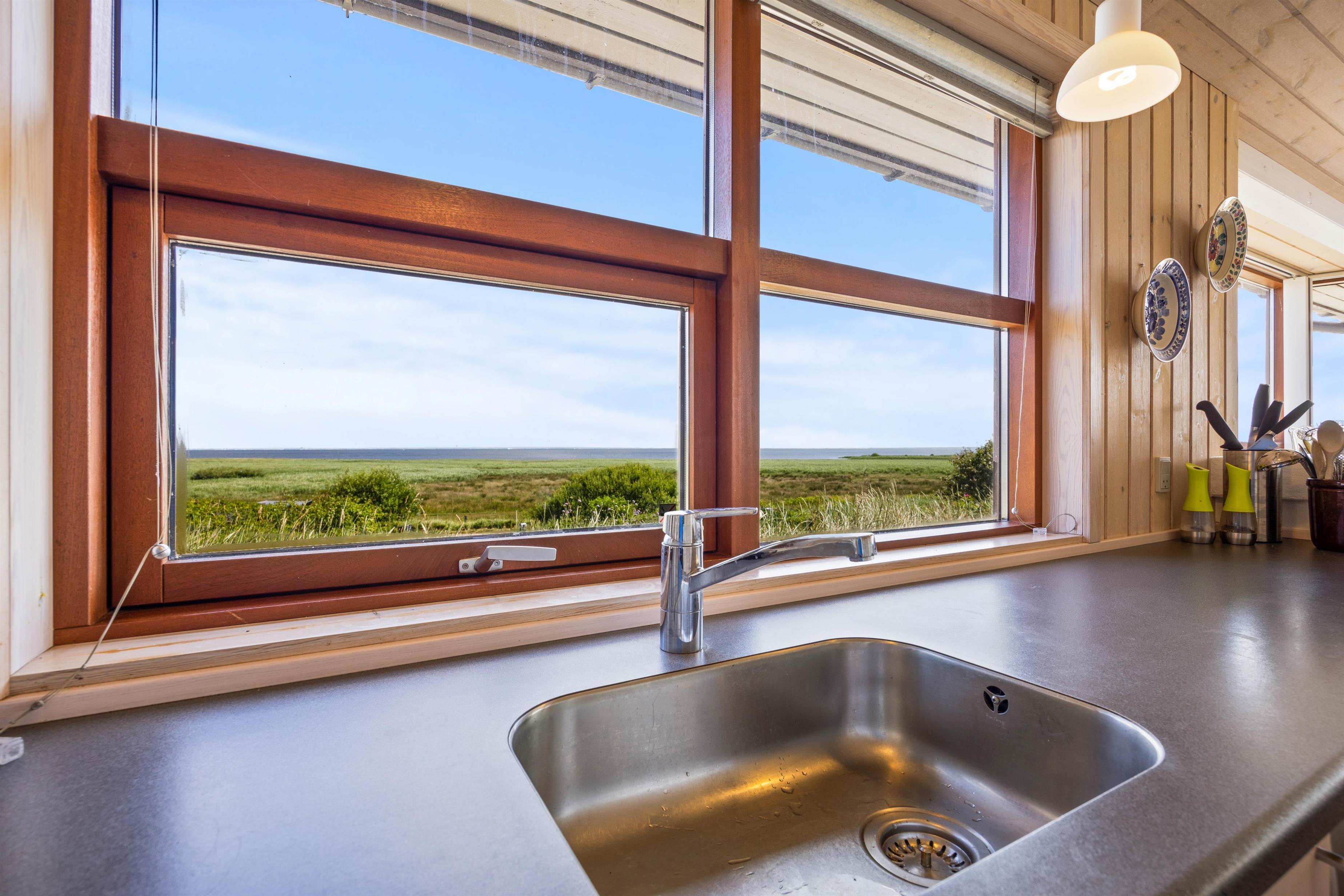 I opholdsrummet, sommerhusets stue og spiseafdeling, er det skønneste lysindfald og den dejligste udsigt over fjorden. Sæt jer godt til rette i sofaen, mens brændeovnen knitrer i baggrunden. Fra sofaen kan I nu streame jeres yndlingsfilm via sommerhusets Chromecast. Ligeledes har I et veludstyret køkken, hvor I sammen kan tilberede lækre måltider.