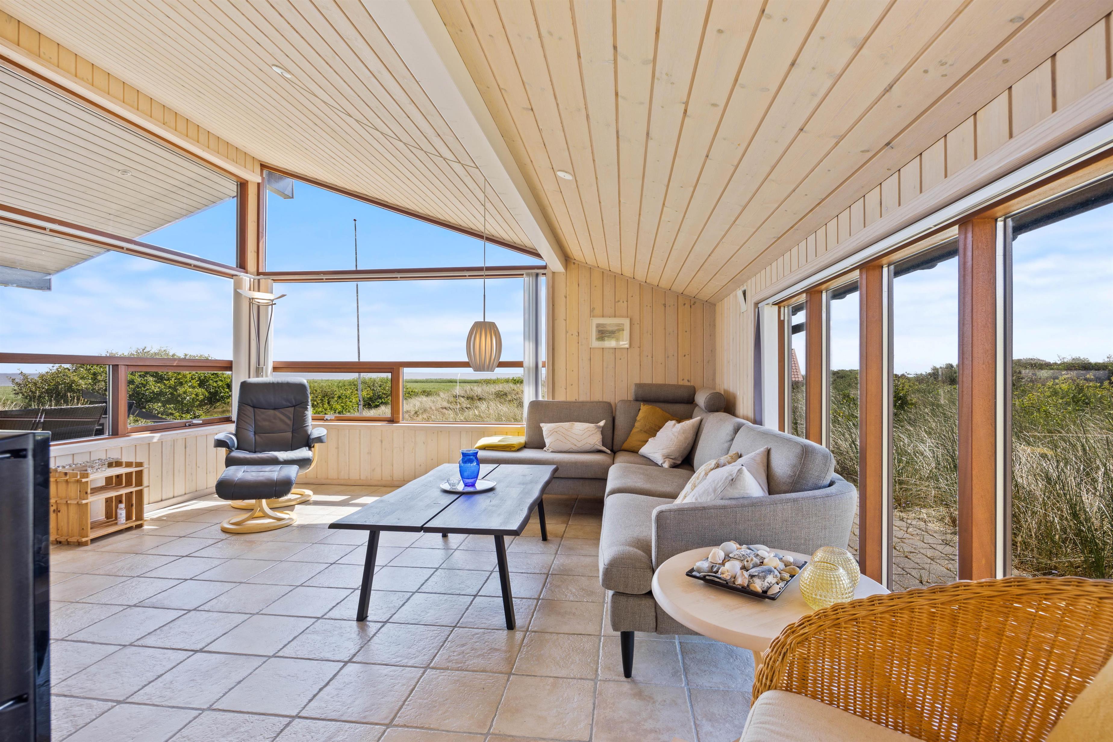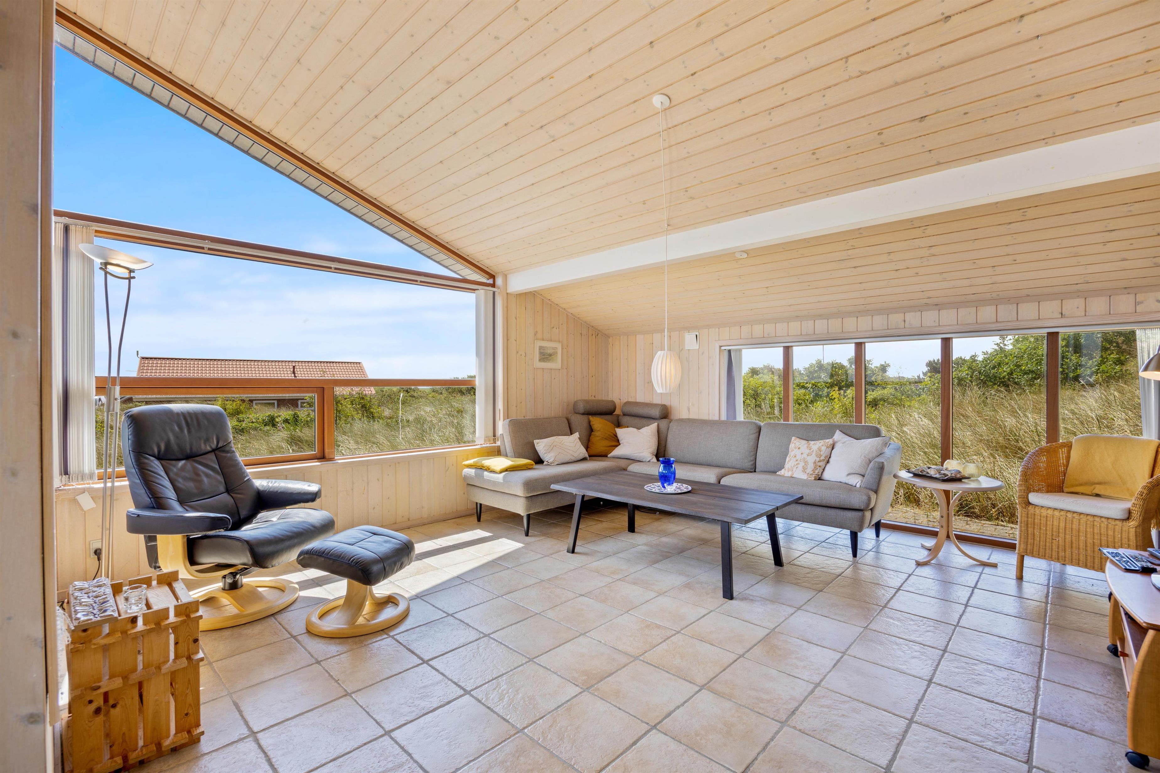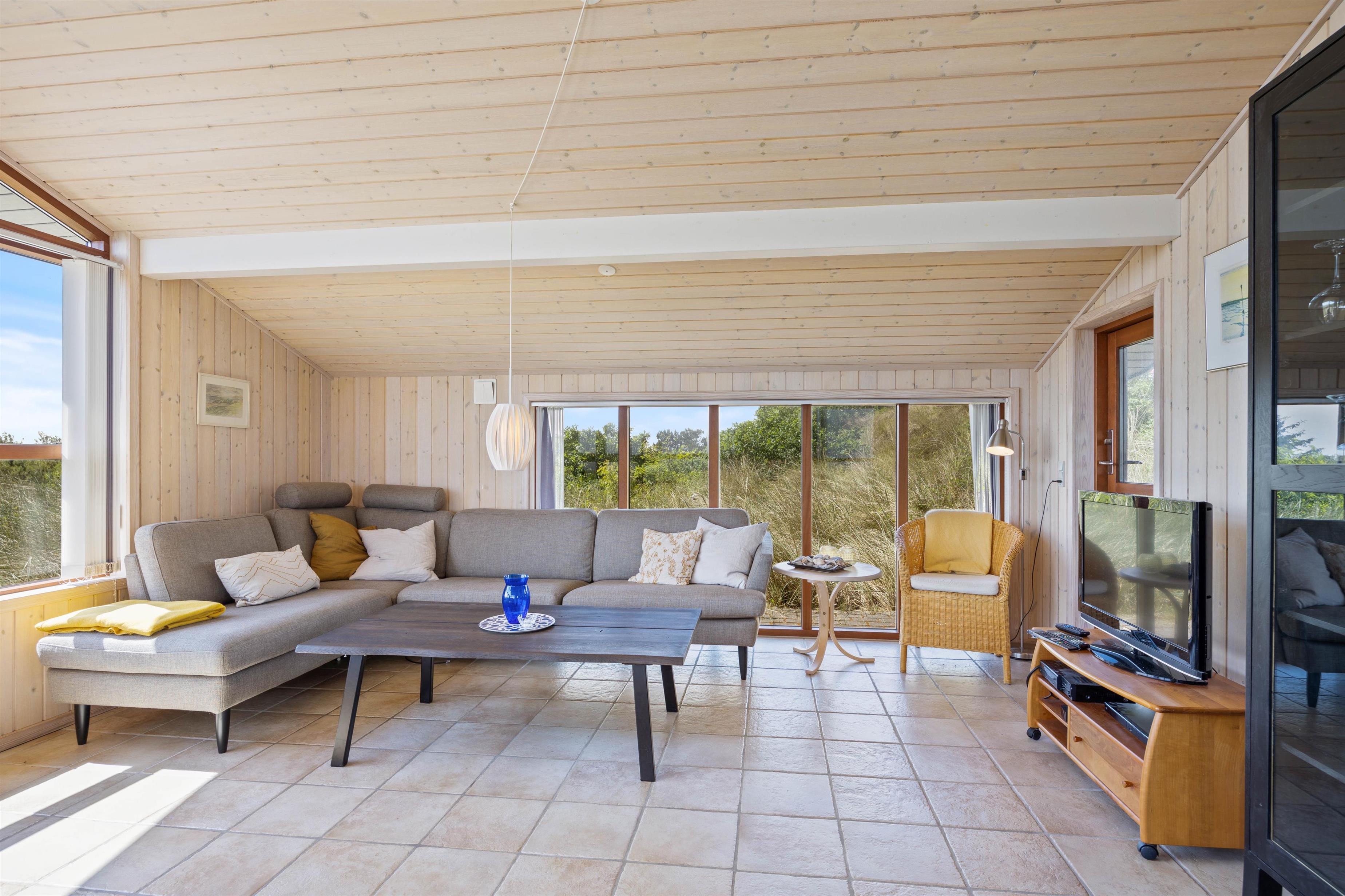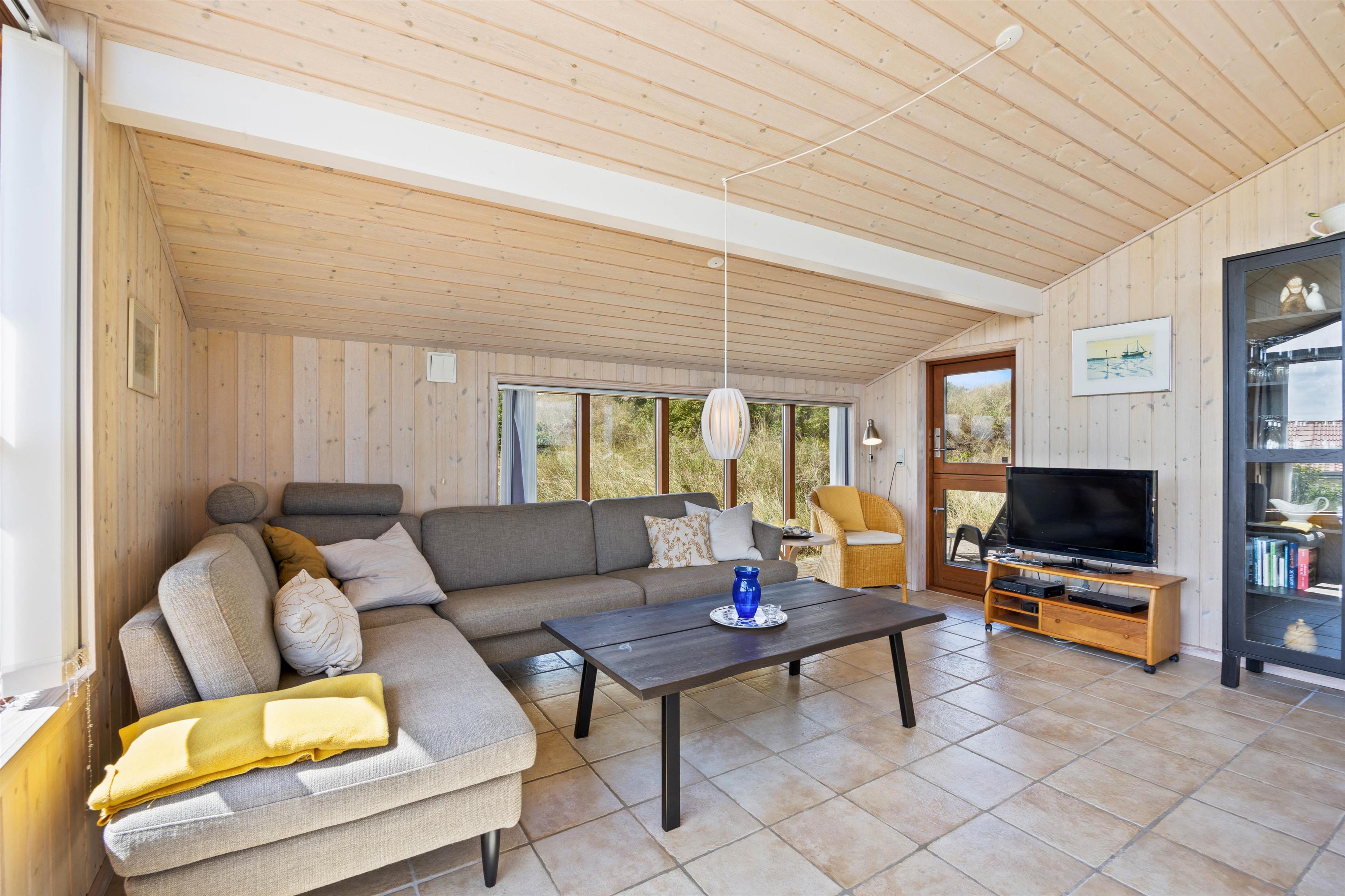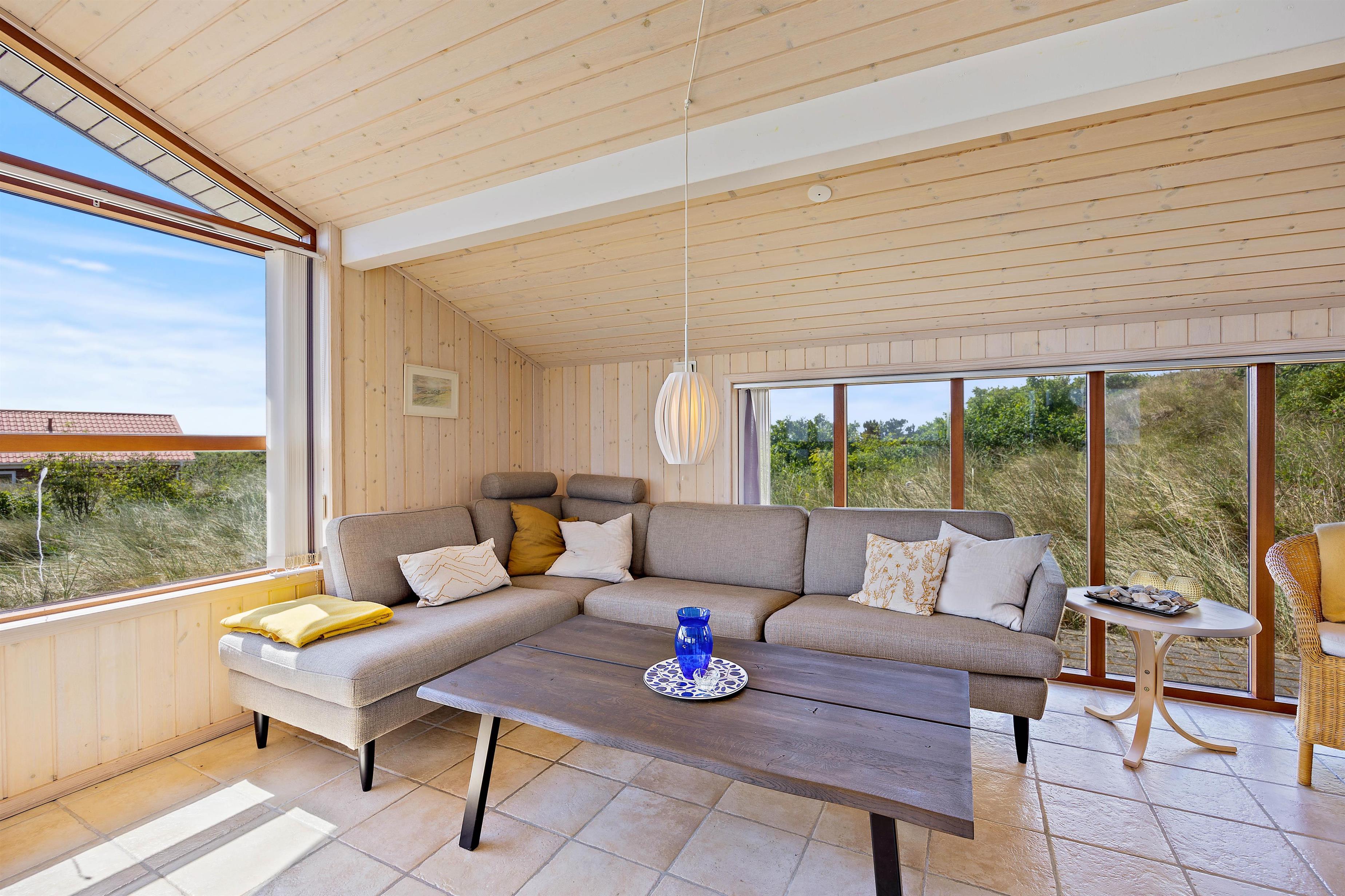 I dette hyggelige feriehus vil I hurtigt føle jer godt tilpas. Her er højt til loft, og indretningen byder på rolige farvenuancer samt komfortable møbler. Dette skaber en behagelig og rummelig atmosfære, hvilket de mange vinduer også bidrager til.