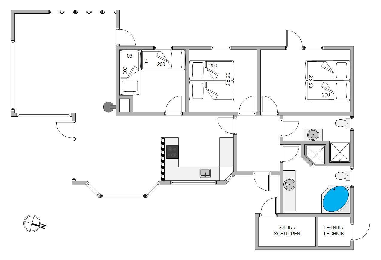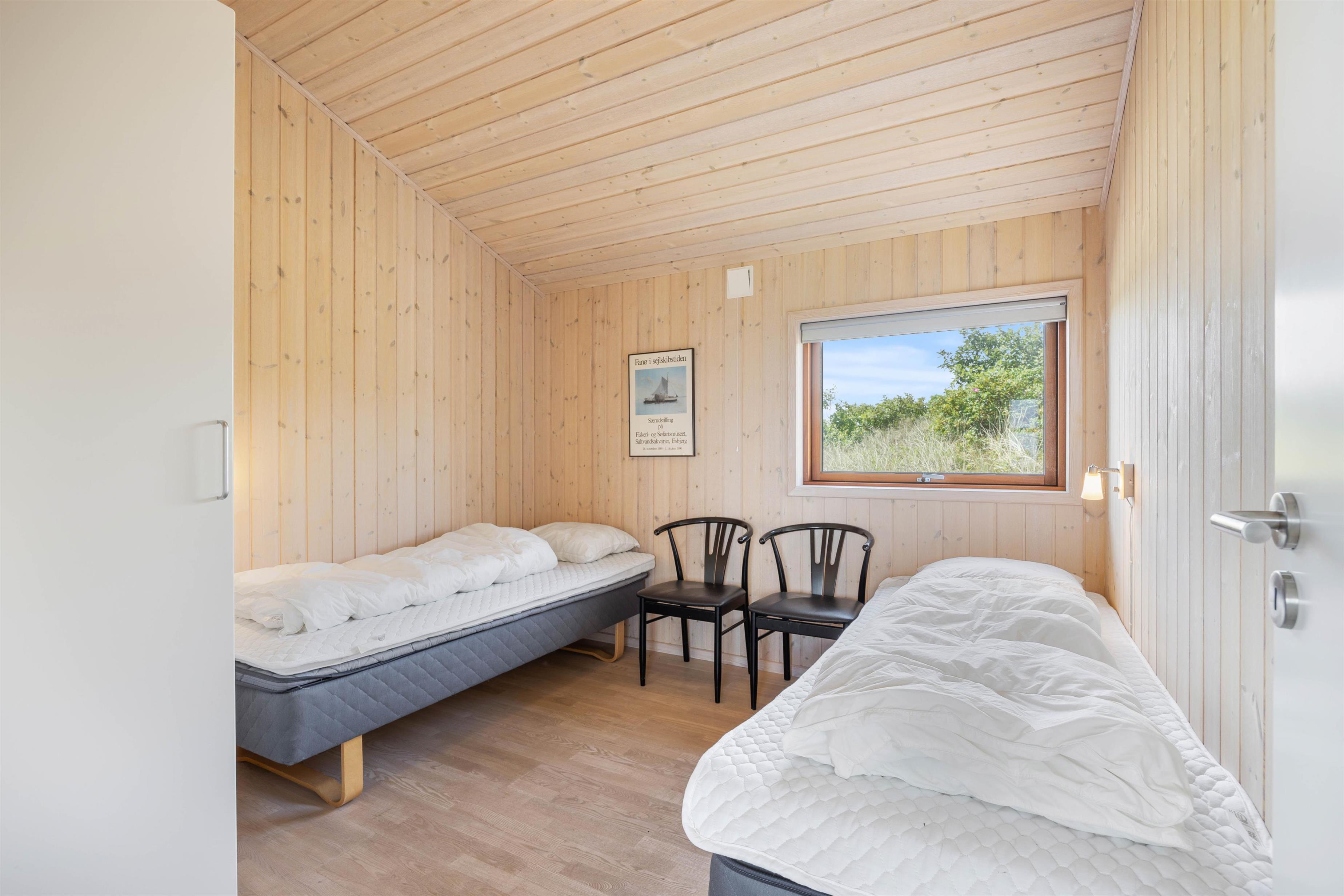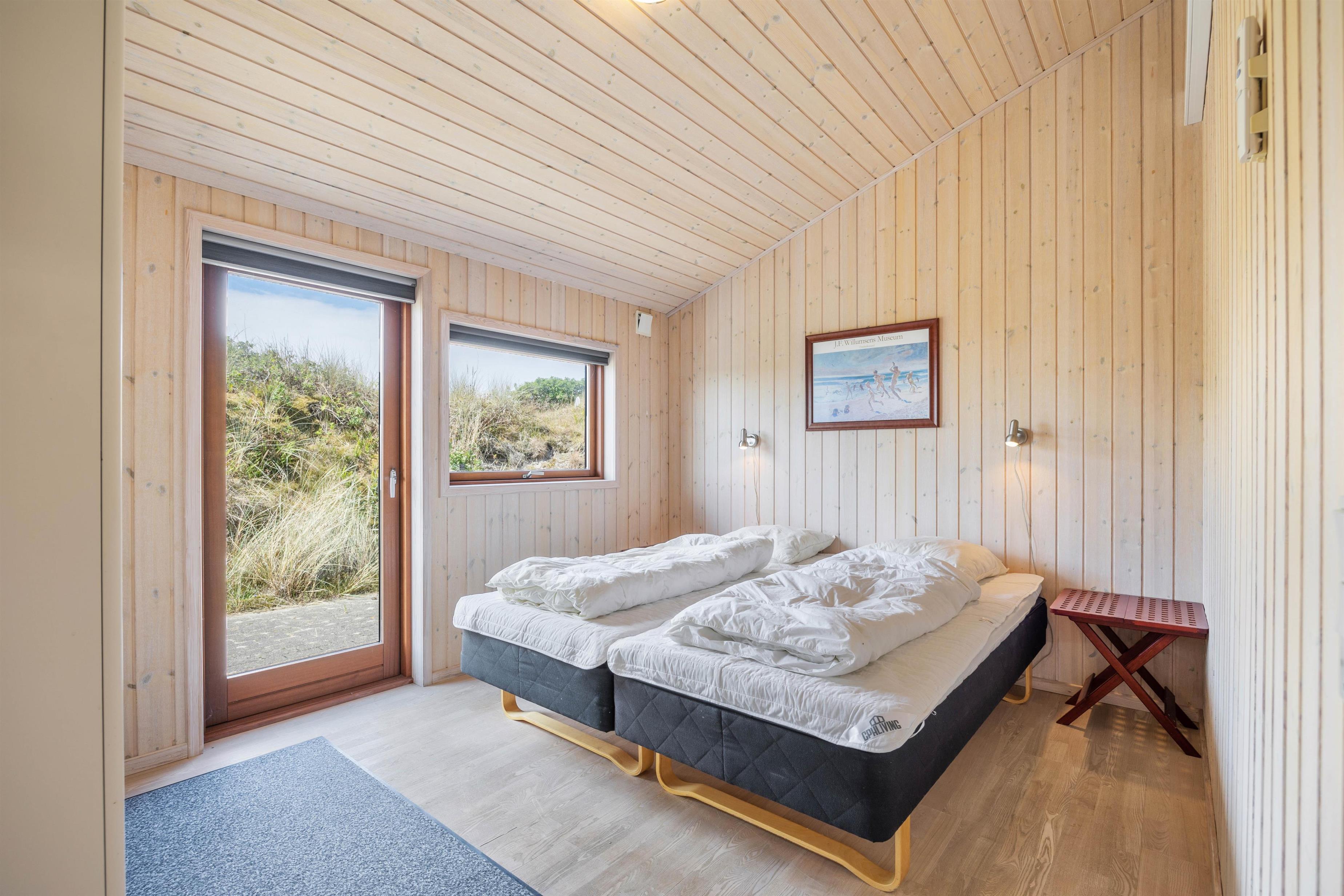 De op til 6 feriegæster kan fordele sig på sommerhusets 3 soveværelser. På 2 af værelserne findes en dobbeltseng, mens det sidste værelse har 2 enkeltsenge. Alle 3 værelser er udstyret med en varmepumpe, som også kan bruges som aircondition – perfekt i de varme sommermåneder. Desuden er der jordvarme i feriehuset, hvilket giver en billigere varmeregning.