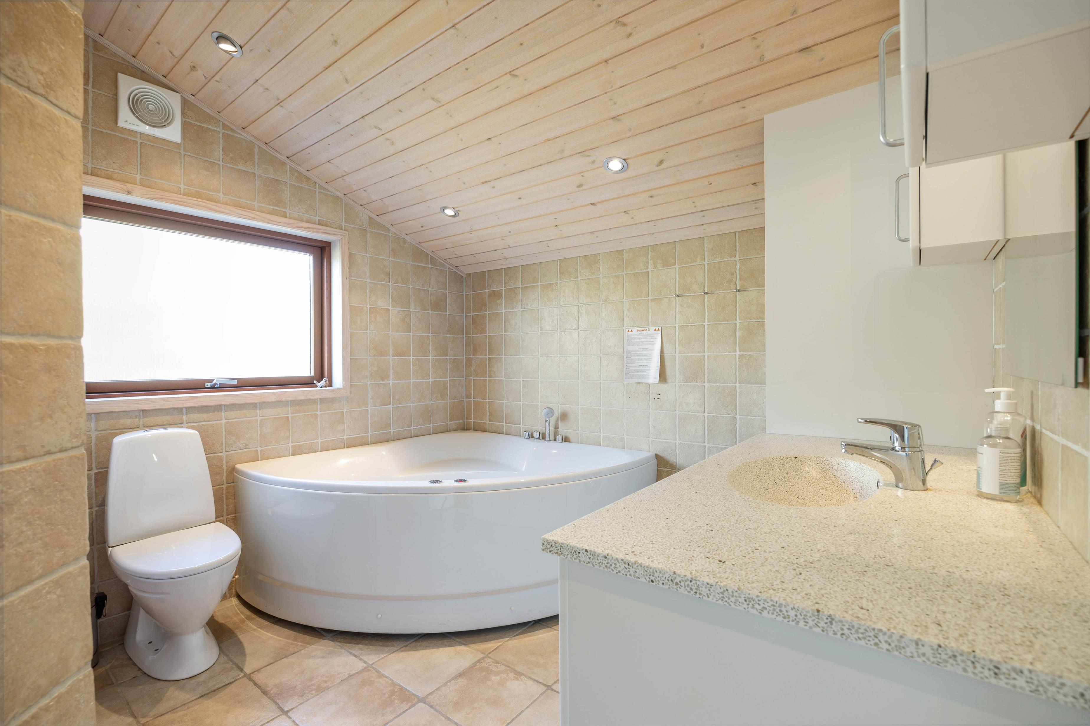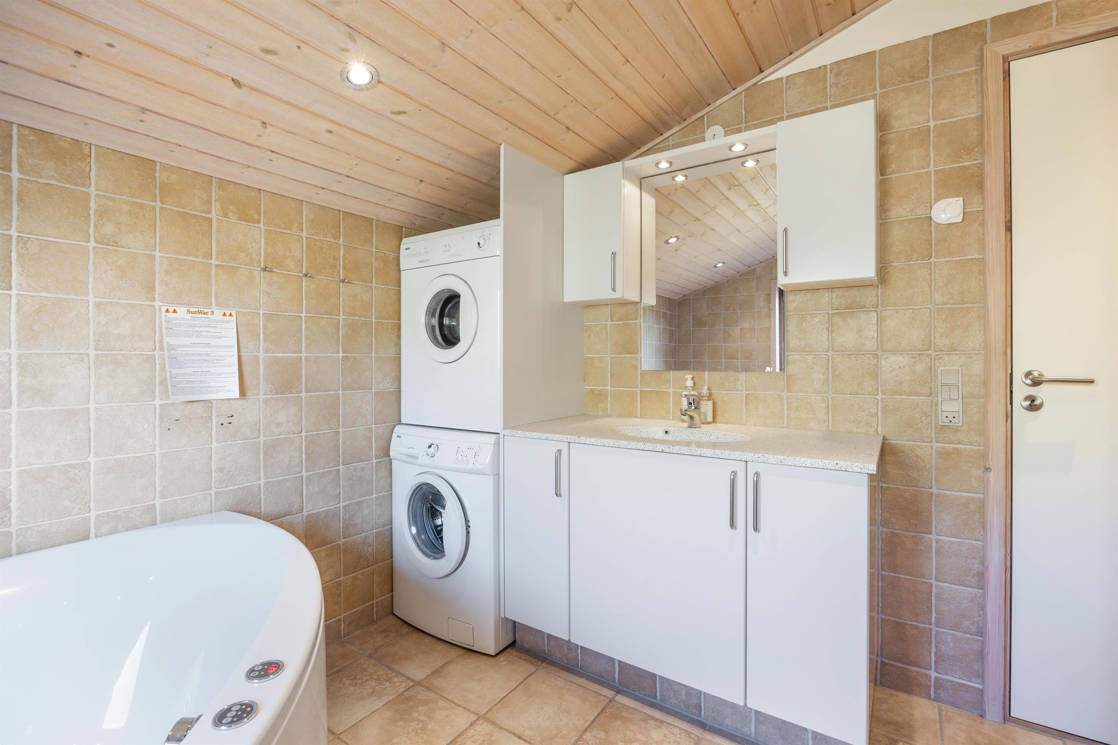 For at koble helt af fra hverdagen, kan I sætte jer til rette i det varme boblende vand i spaen. Spabadet finder I på det største af feriehusets 2 badeværelser. Desuden har I også vaskemaskine og tørretumbler til rådighed under opholdet.