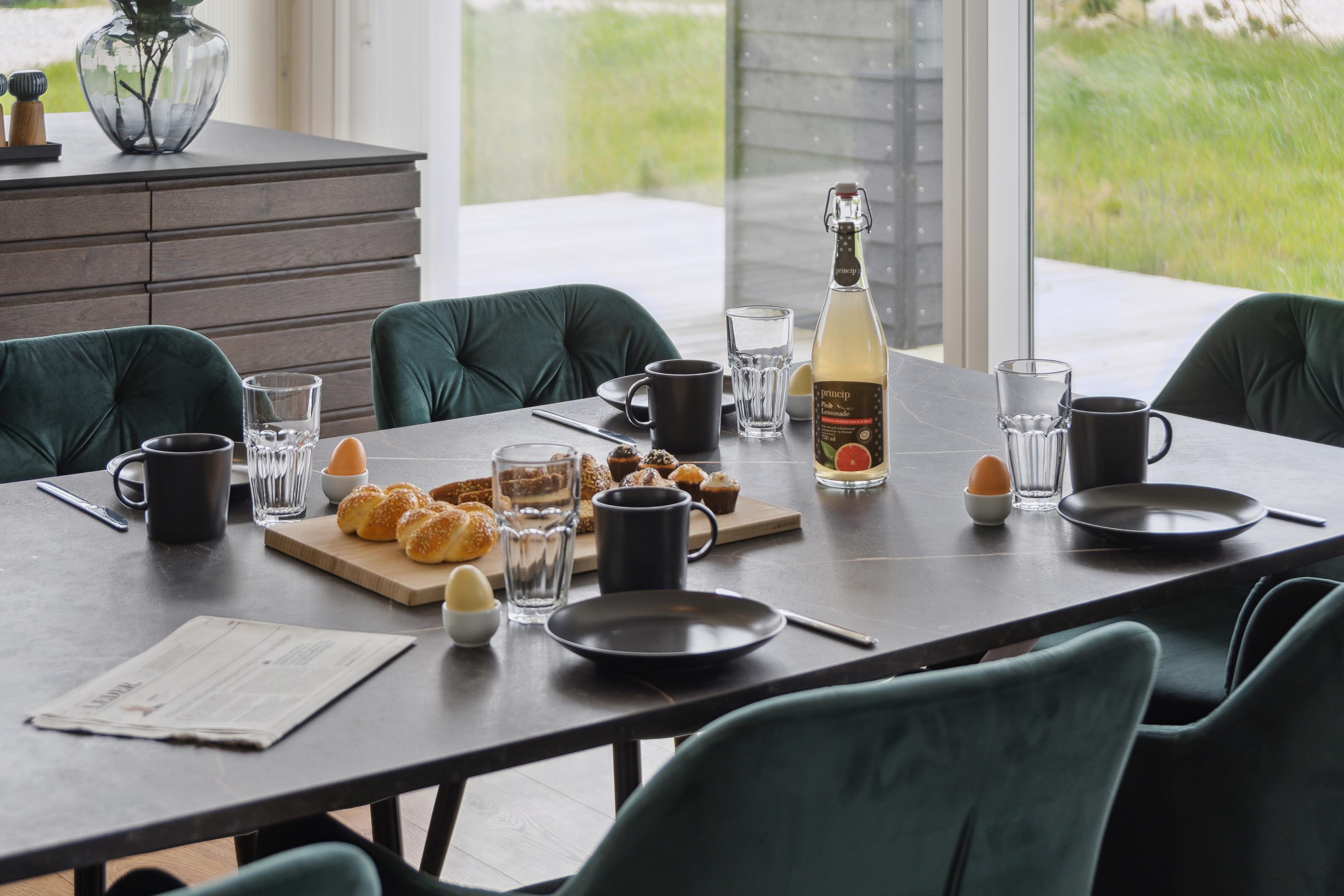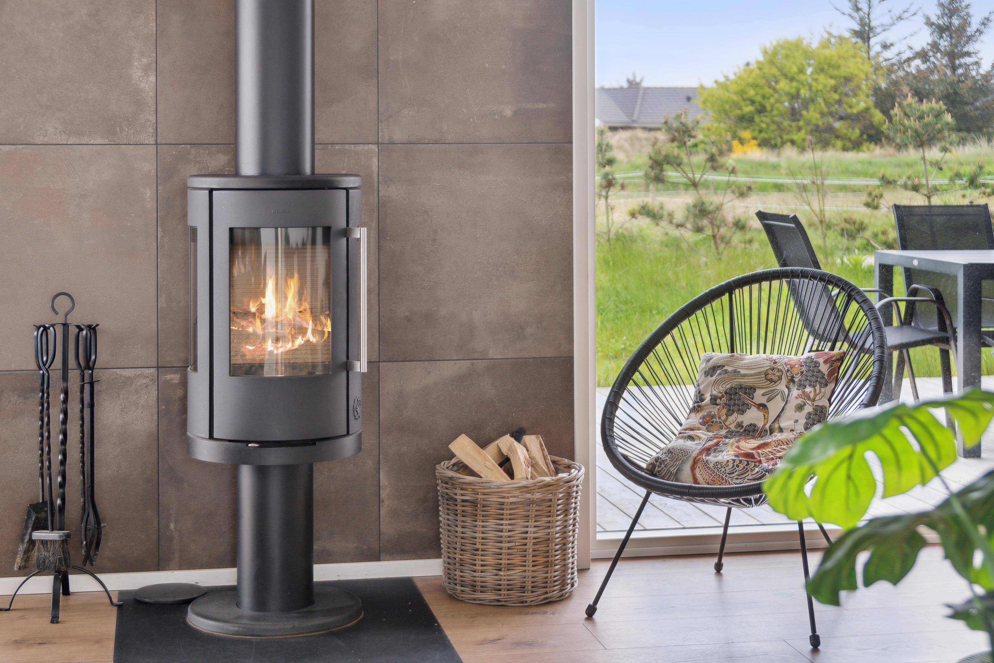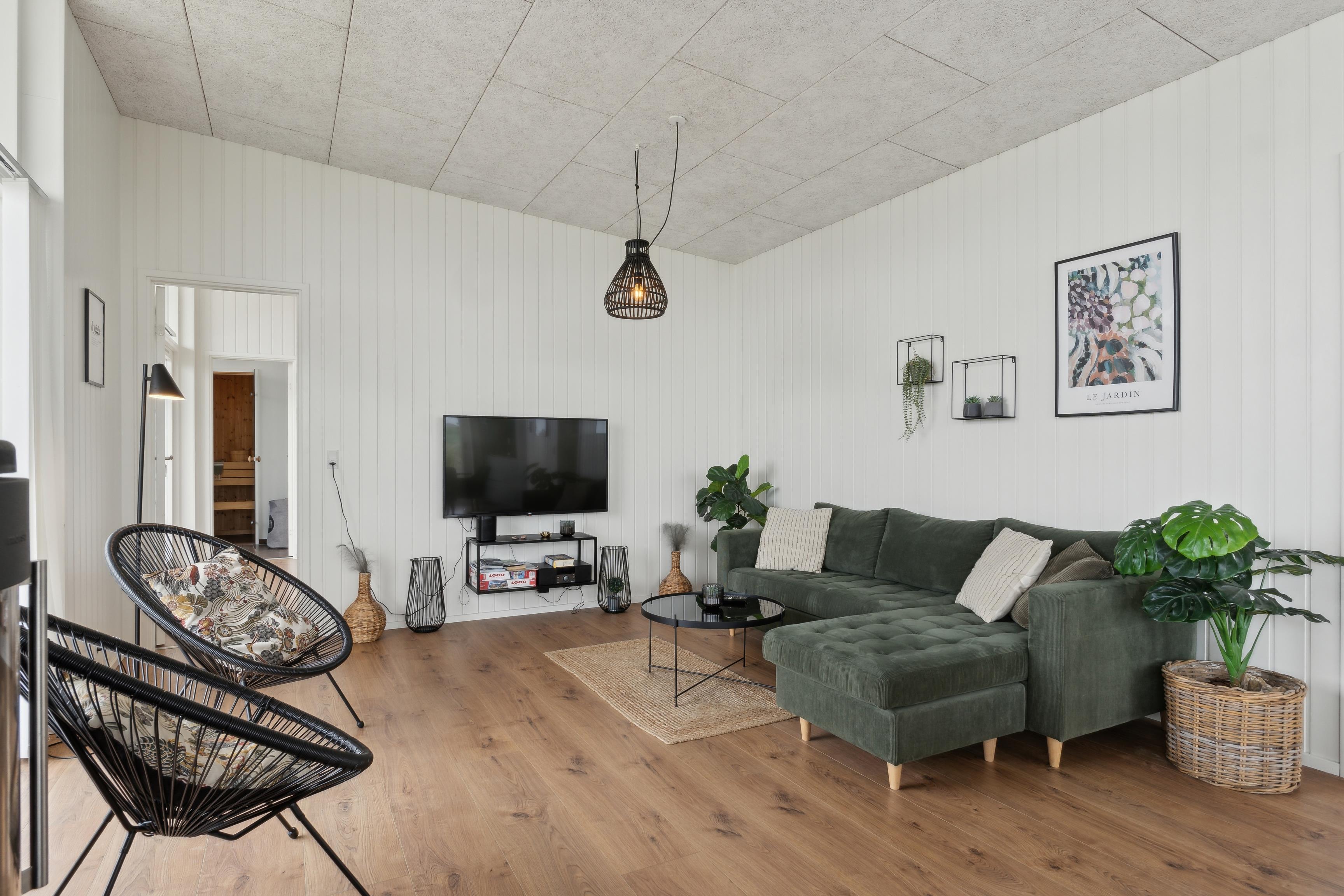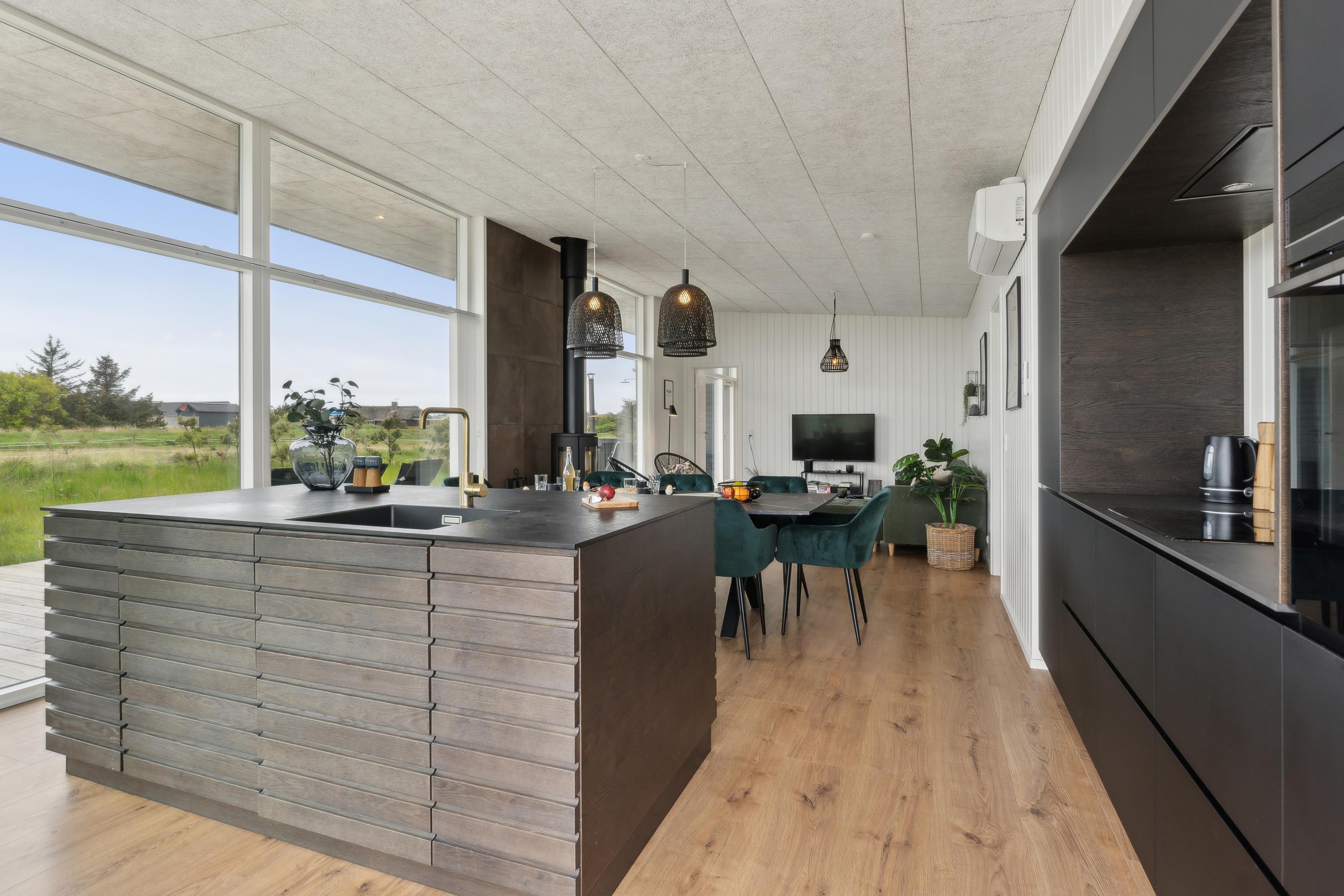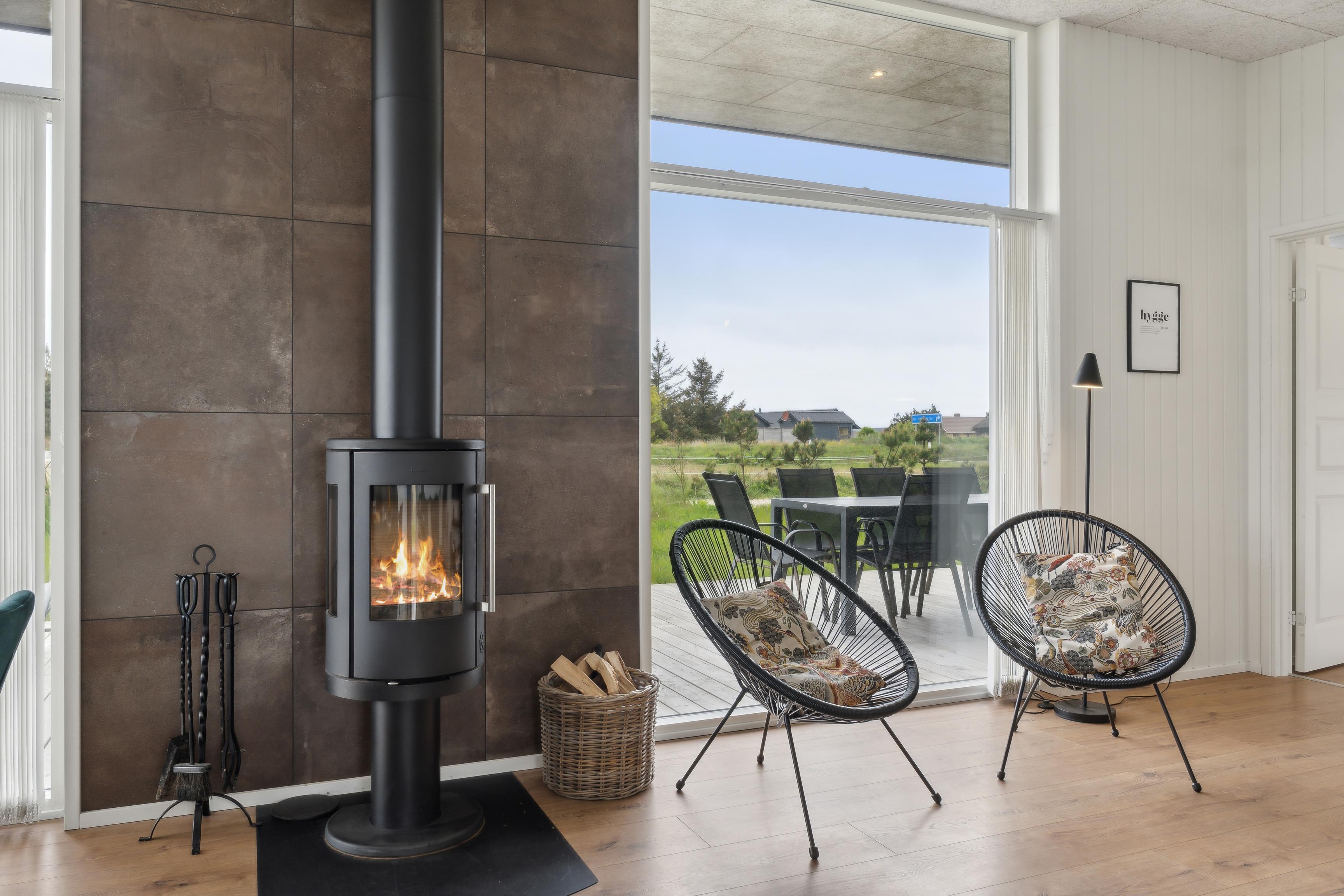 Sommerhusets hjerte er det åbne rum, hvor køkken, spiseplads og stue er samlet. Her kan hele familien nyde et kortspil eller en hyggelig aften på sofaen. Der er også en pejs, der skaber varme og ekstra hygge på de køligere dage. Huset har desuden en effektiv varmepumpe, som kan bruges til opvarmning, og som også kan køle huset ned på varme sommerdage.