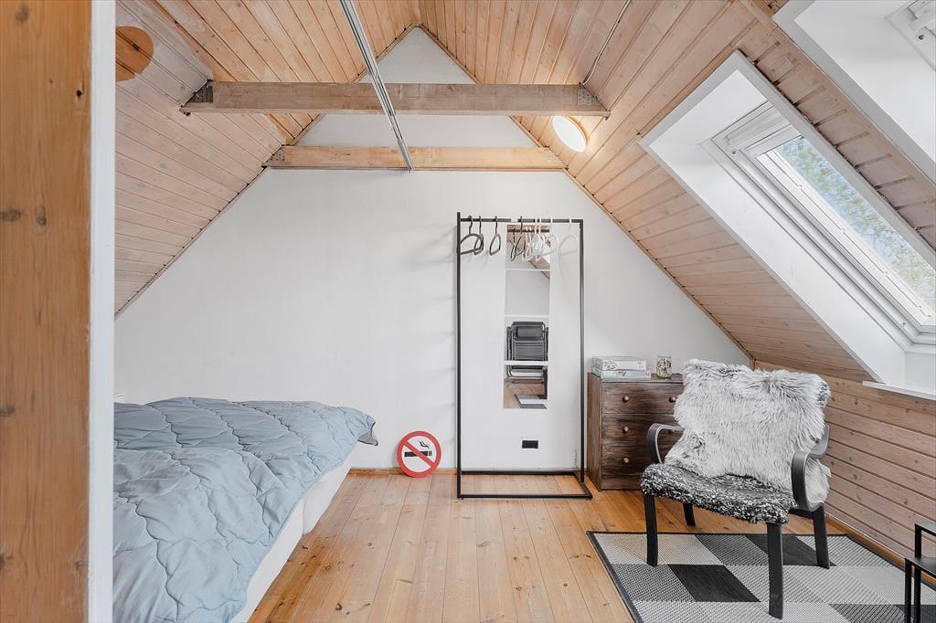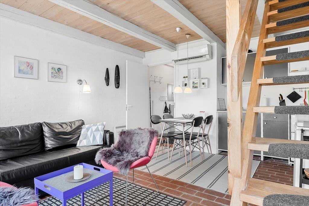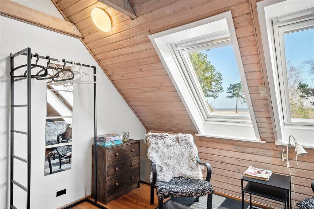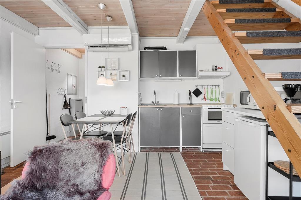 Kvadratmeterne er godt udnyttet inden døre, så det er muligt at holde ferie fire personer sammen. Farvetonerne er lyse, og indretningen er hyggelig – ikke kun i stueplan, men også på førstesalen, der er indrettet med to enkeltsenge. Fra førstesalen kan I nyde udsigten til vandet gennem de østvendte skråvinduer, og i stueplan sørger det store vestvendte vindue for et behageligt lysindfald i opholdsrummet, som blandt andet er udstyret med spisebord, et åbent køkken og en dobbelt sovesofa. Planløsningen byder i øvrigt på en lille entré og et pænt badeværelse med gulvvarme og bruseniche.
