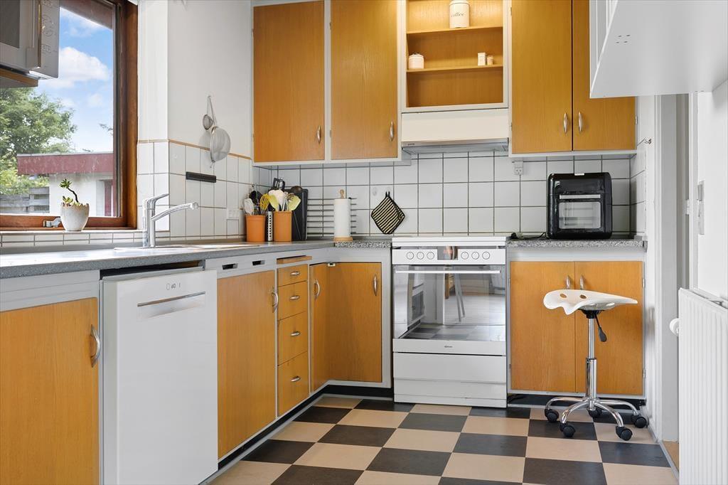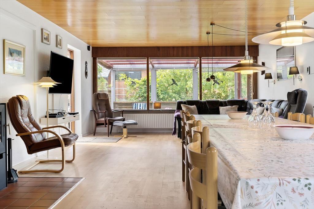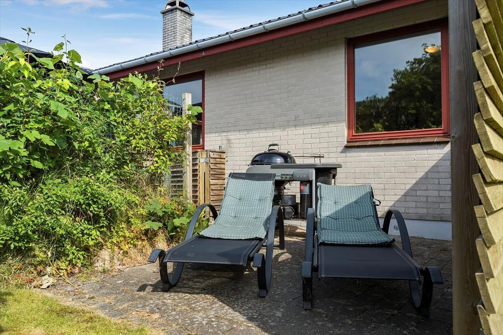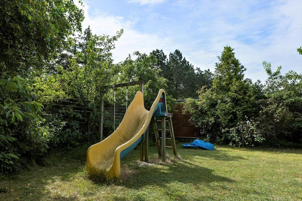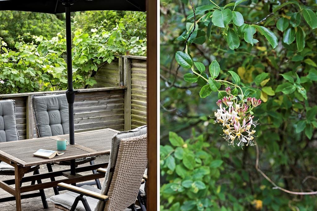 Fra stuen er der direkte adgang til en sydvendt, delvist overdækket og lukket terrasse, som er et ideelt sted at nyde sommervejret. Haven er lukket og indhegnet, perfekt til børn og hunde, og der er legefaciliteter som gynge og sandkasse. Desuden er der både garage og parkeringsplads på grunden.