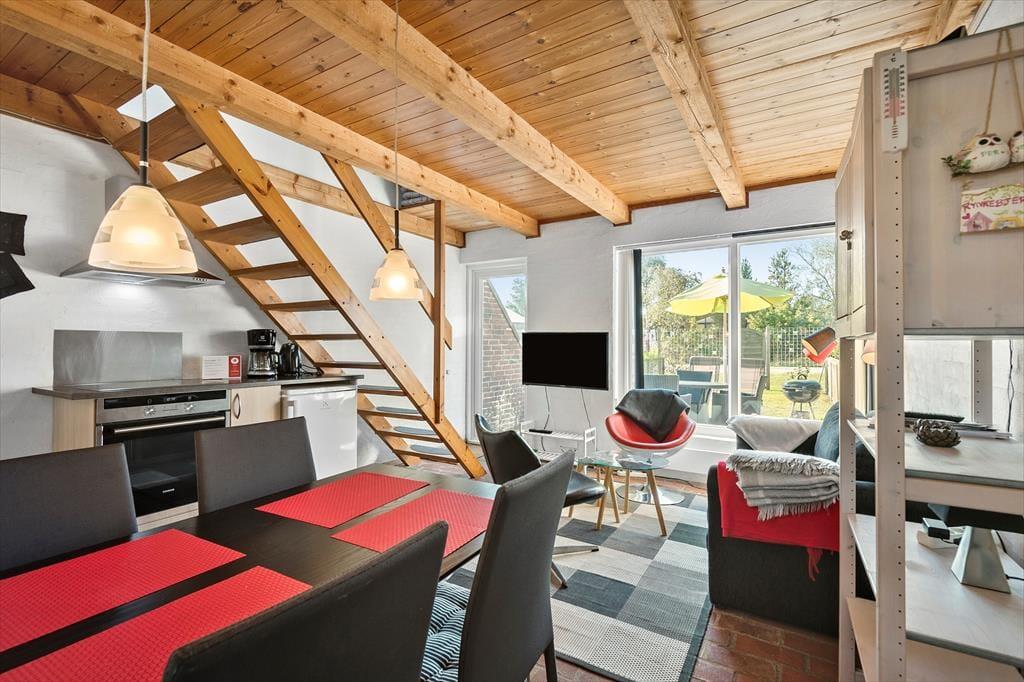 Atmosfæren er lys og indbydende i denne feriebolig, der nærmere bestemt er et rækkehus i to plan. Ude kan I nyde livet på terrassen og det grønne fællesareal, og fra førstesalen har I ligefrem udsigt til Vadehavet, som breder sig tæt på huset.