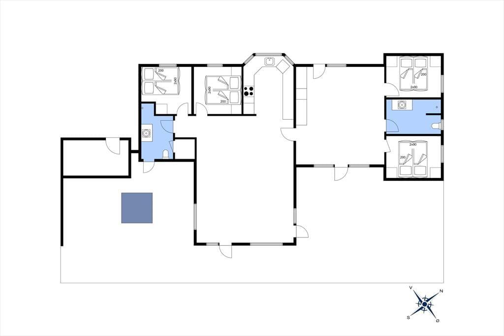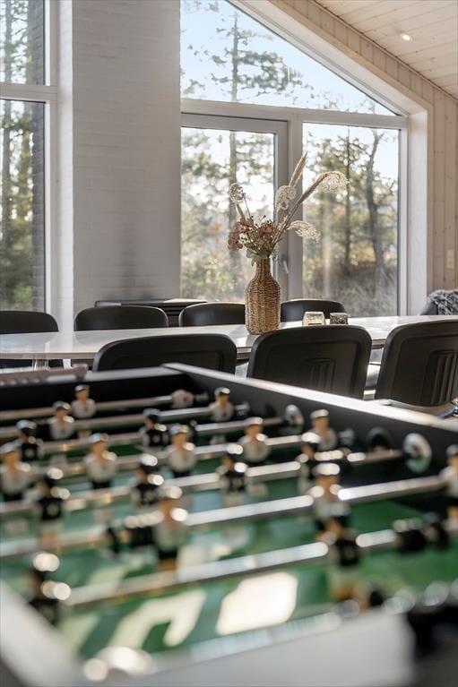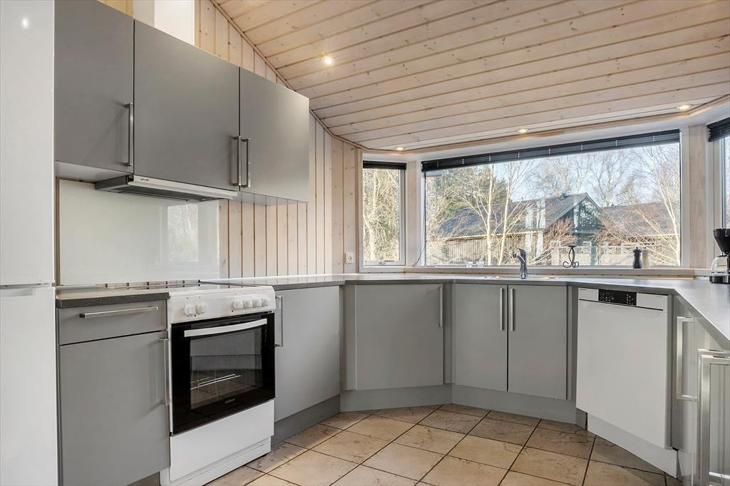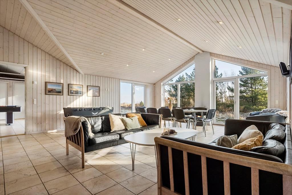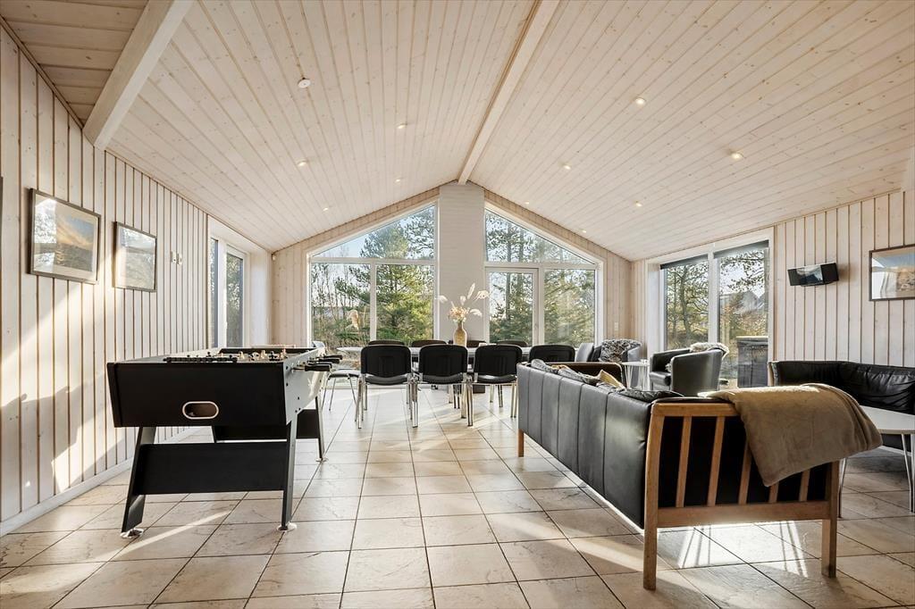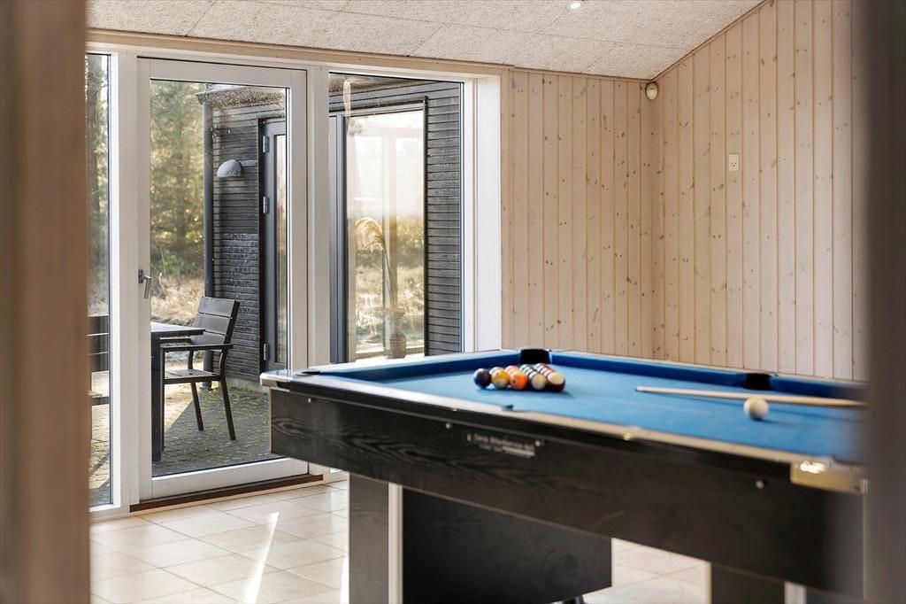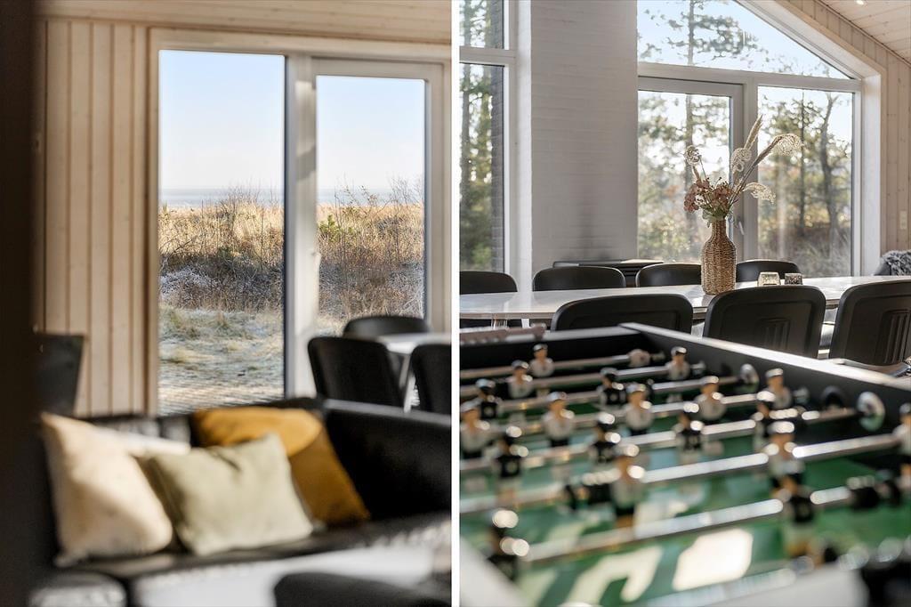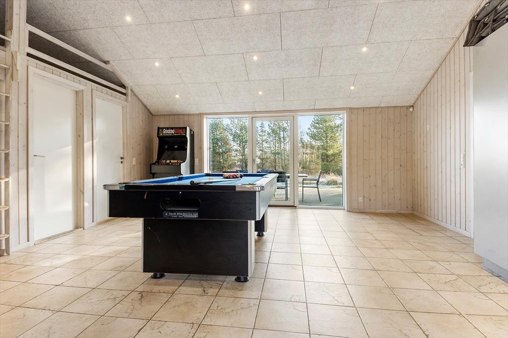 Sommerhuset er ikke bare stort, men har også en gennemtænkt planløsning, hvor de fire soveværelser og to badeværelser er smart fordelt i husets to ender. Fra aktivitetsrummet er der stige op til en hems, der også kan bruges til overnatning, og derfor kan I fint være 10 personer inden døre – og helt oplagt kan huset deles af to eller måske endda tre familier. Spillefuglene i selskabet vil elske at have et helt aktivitetsrum at hygge sig i. Her er der mulighed for at spille bordtennis, pool og bordfodbold, og der er også en arkadespillemaskine med 5000 spil til rådighed. Vil du hellere læse eller bare hyggesnakke med de andre, er det oplagt at rykke ind i stuens sofaafdeling, og når sulten begynder at melde sig, kan du gå i gang med at trylle med råvarerne i det åbne køkken.