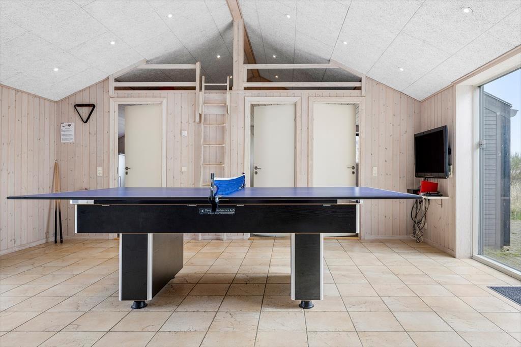 Sommerhuset er ikke bare stort, men har også en gennemtænkt planløsning, hvor de fire soveværelser og to badeværelser er smart fordelt i husets to ender. Fra aktivitetsrummet er der stige op til en hems, der også kan bruges til overnatning, og derfor kan I fint være 10 personer inden døre – og helt oplagt kan huset deles af to eller måske endda tre familier. Spillefuglene i selskabet vil elske at have et helt aktivitetsrum at hygge sig i. Her er der mulighed for at spille bordtennis, pool og bordfodbold, og der er også en spillekonsol til rådighed. Vil du hellere læse eller bare hyggesnakke med de andre, er det oplagt at rykke ind i stuens sofaafdeling, og når sulten begynder at melde sig, kan du gå i gang med at trylle med råvarerne i det åbne køkken.