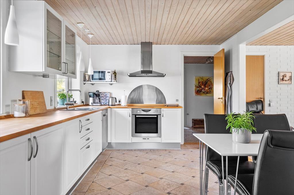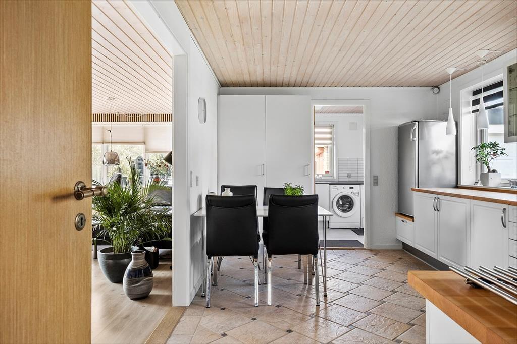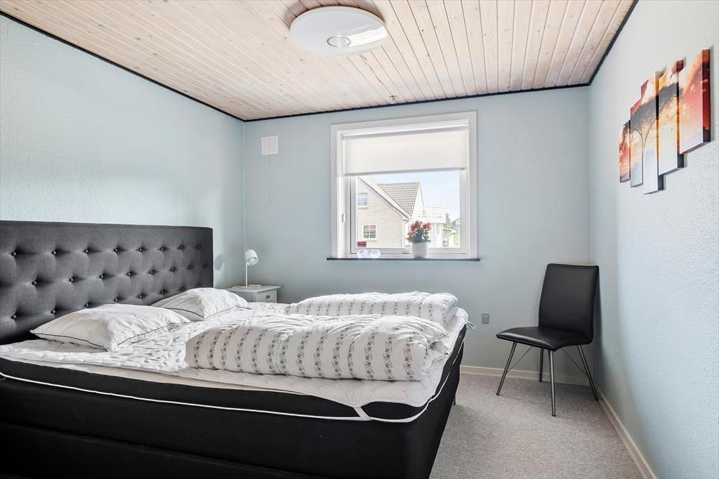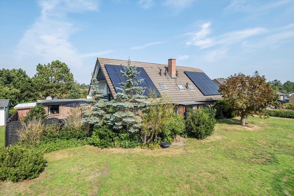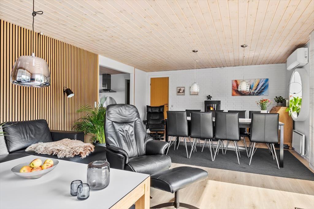 Det 190 m² store sommerhus har en glimrende planløsning til otte personer. Fordelt på to etager er der nemlig fire soveværelser og to badeværelser til rådighed, og derfor kan I oplagt samles to familier i huset, hvis det er ønsket. I stueplan ligger et praktisk bryggers med vaskemaskine og tørretumbler ved siden af et pænt og veludstyret køkken, og herfra er der åben forbindelse til en skøn stue med brændeovn, varmepumpe og stort spisebord. Det lyse opholdsrum byder også på et komfortabelt sofaarrangement, hvor I kan hygge jer med strikketøj, brætspil eller film på fladskærms-tv’et, og derudover er der mere plads til leg og afslapning i førstesalens stue.