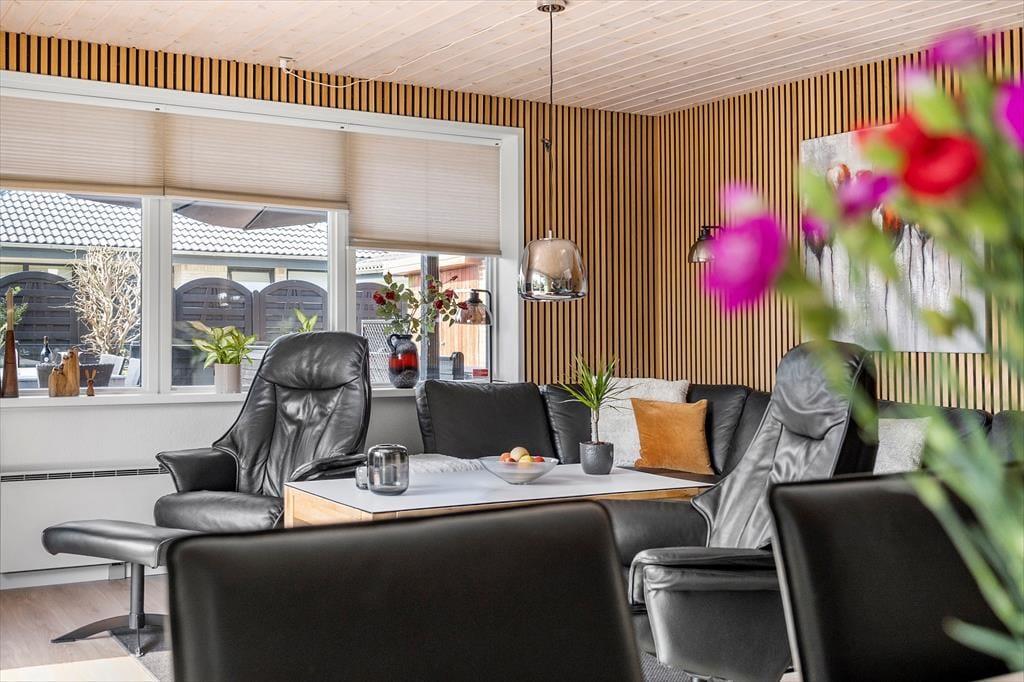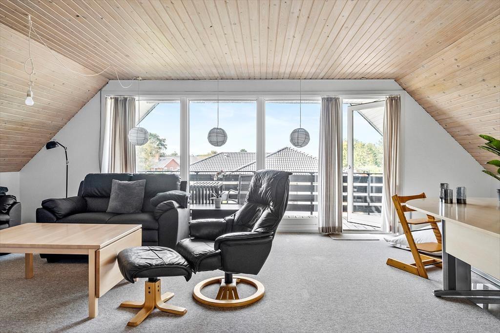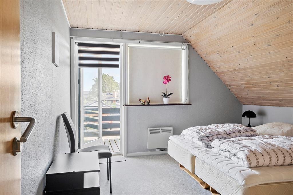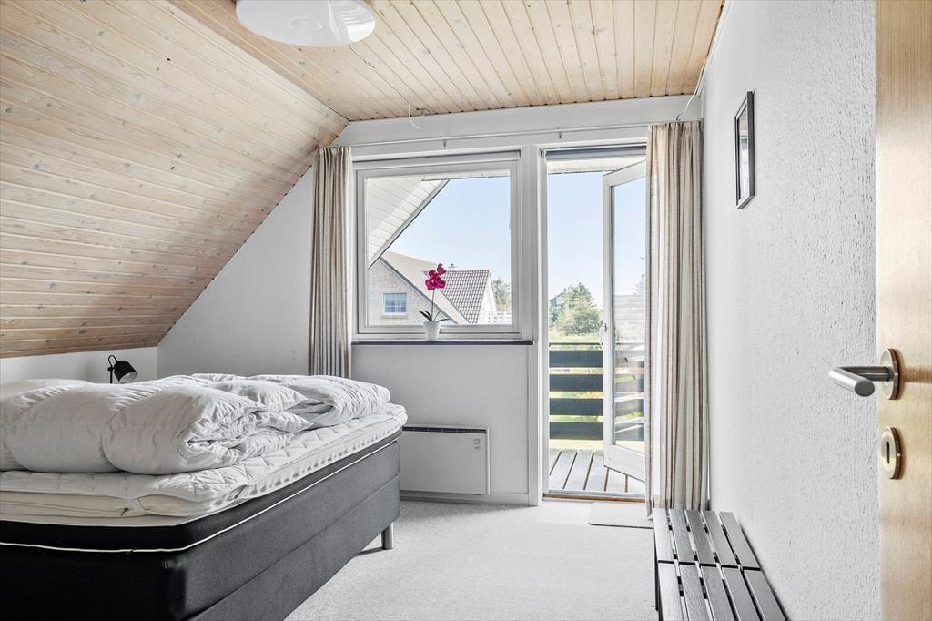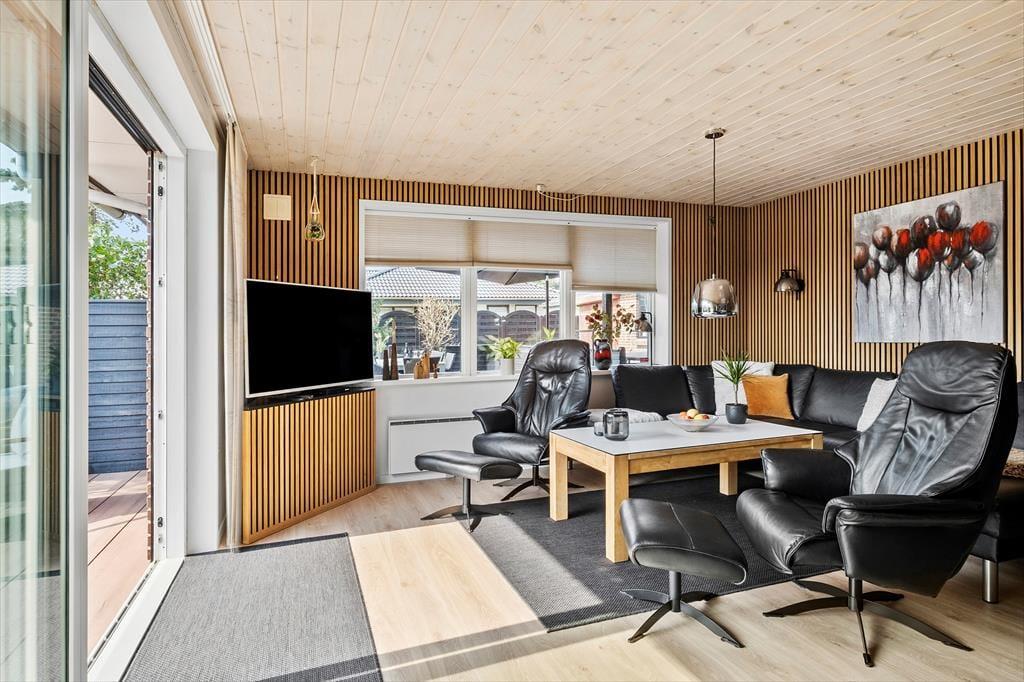 Det 190 m² store sommerhus har en glimrende planløsning til otte personer. Fordelt på to etager er der nemlig fire soveværelser og to badeværelser til rådighed, og derfor kan I oplagt samles to familier i huset, hvis det er ønsket. I stueplan ligger et praktisk bryggers med vaskemaskine og tørretumbler ved siden af et pænt og veludstyret køkken, og herfra er der åben forbindelse til en skøn stue med brændeovn, varmepumpe og stort spisebord. Det lyse opholdsrum byder også på et komfortabelt sofaarrangement, hvor I kan hygge jer med strikketøj, brætspil eller film på fladskærms-tv’et, og derudover er der mere plads til leg og afslapning i førstesalens stue.