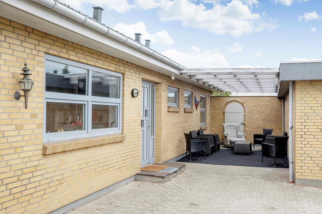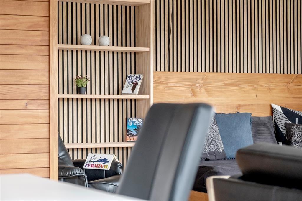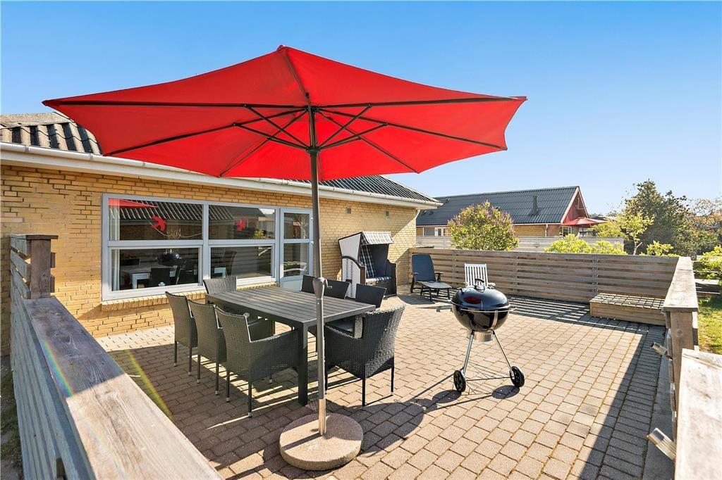Ude i det fri er den velplejede græsplæne og den sydvendte terrasse helt lukket, så hunden kan uden problemer gå frit, mens I slapper af i solen. Takket være terrassens læhegn har I en dejligt ugeneret oase, hvor I kan nyde livet i liggestolene eller i strandkurven og tænde op i den store Weber kuglegrill, når det er ved at være aftensmadstid.