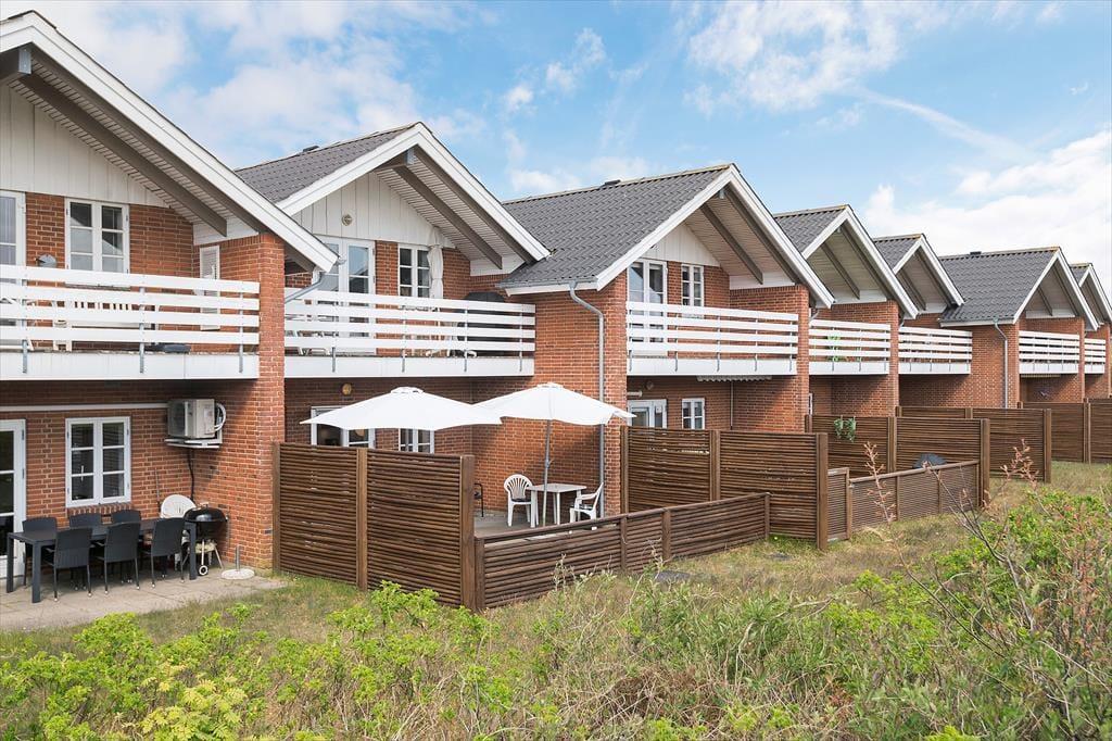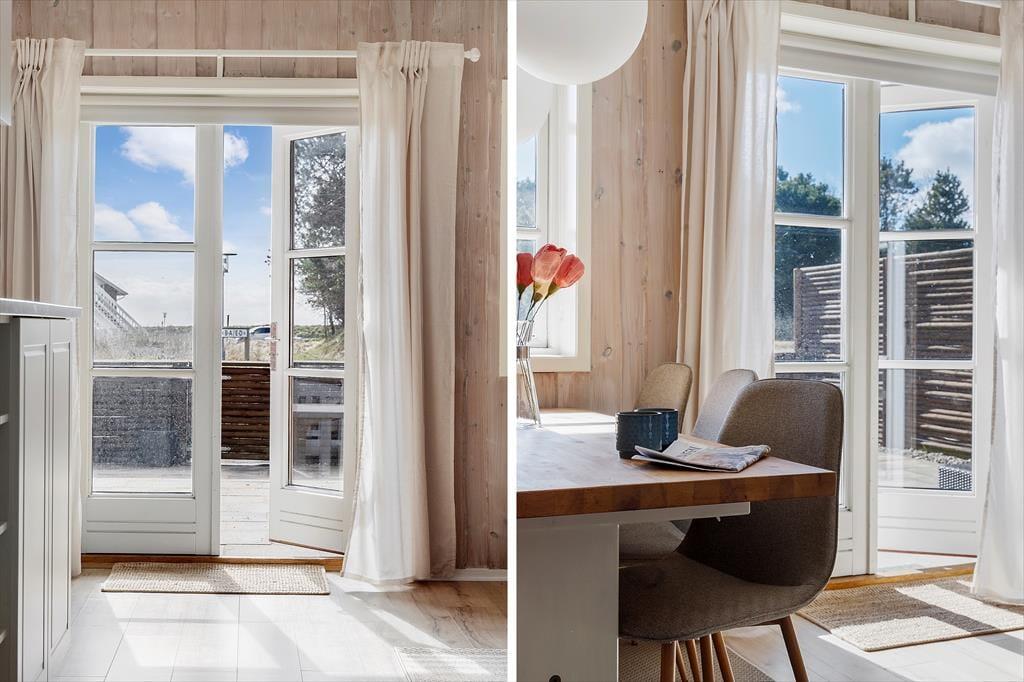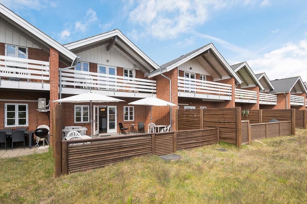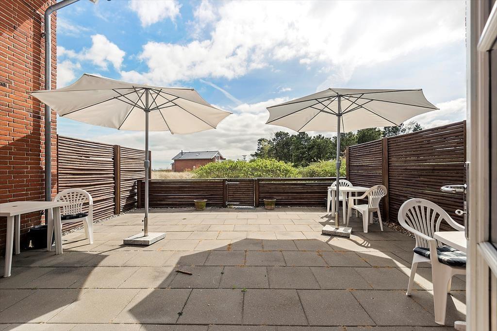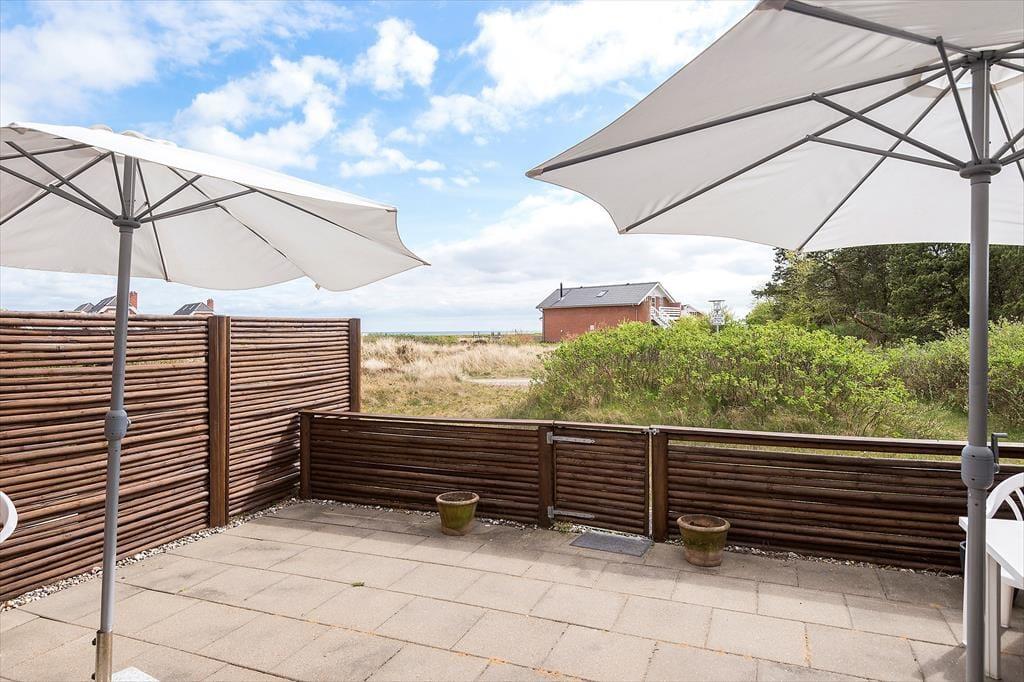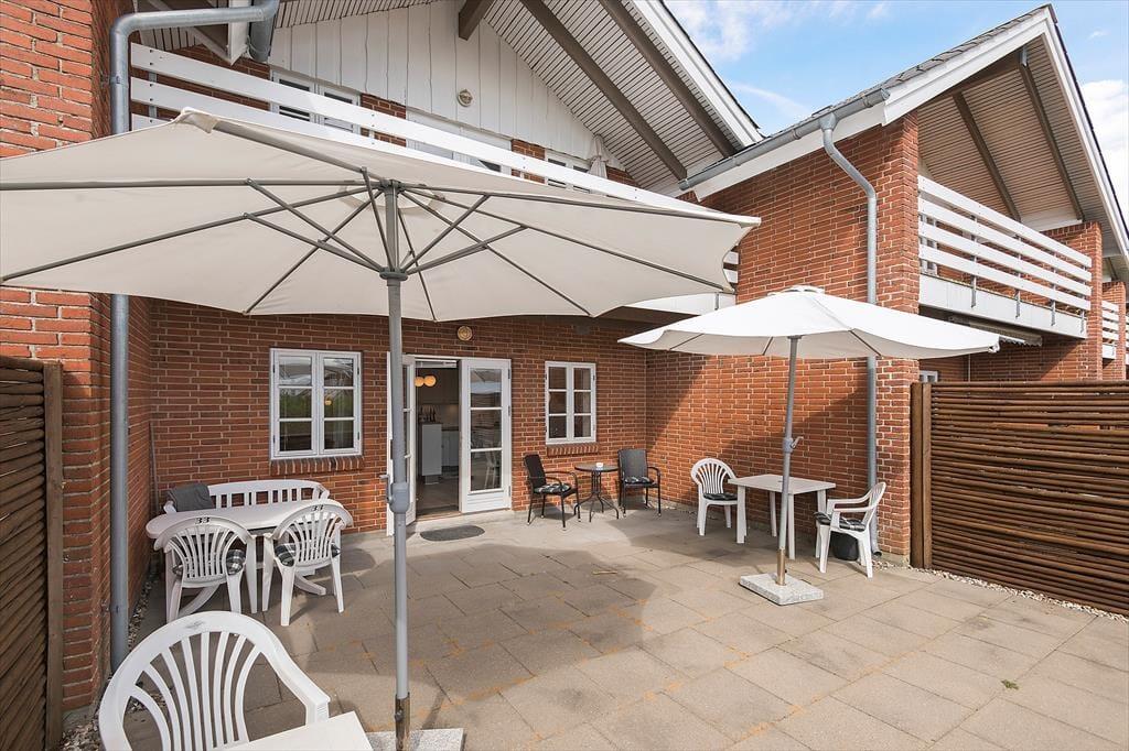 Fra stuen giver havedøren direkte adgang til en stor og solrig terrasse. Den er omkranset af plankeværk og dermed helt aflukket – hvilket småbørnsfamilier sikkert vil sætte pris på. De yngste feriegæster vil garanteret også blive glade for den gode legeplads, som ligger ganske tæt på lejligheden.
