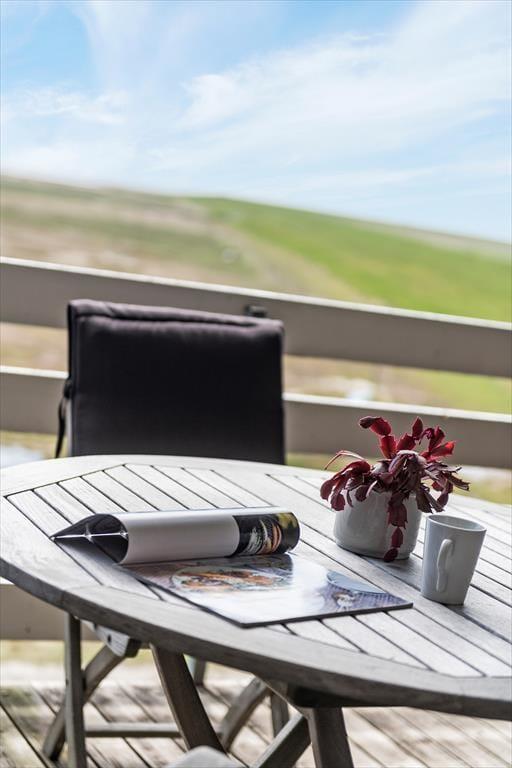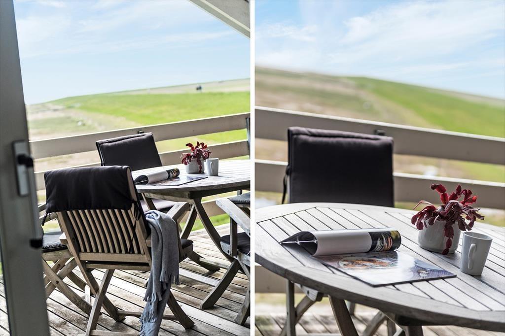 Når vejret er sommerligt, og temperaturerne er lune, kan den sydvendte altan hurtigt blive jeres foretrukne opholdsplads. Her er der nemlig mulighed for at sole sig i løbet af dagen med fri udsigt til Vadehavet, og takket være overdækningen kan I også finde ly for duggen, hvis I gerne vil blive siddende til langt ud på aftenen.
