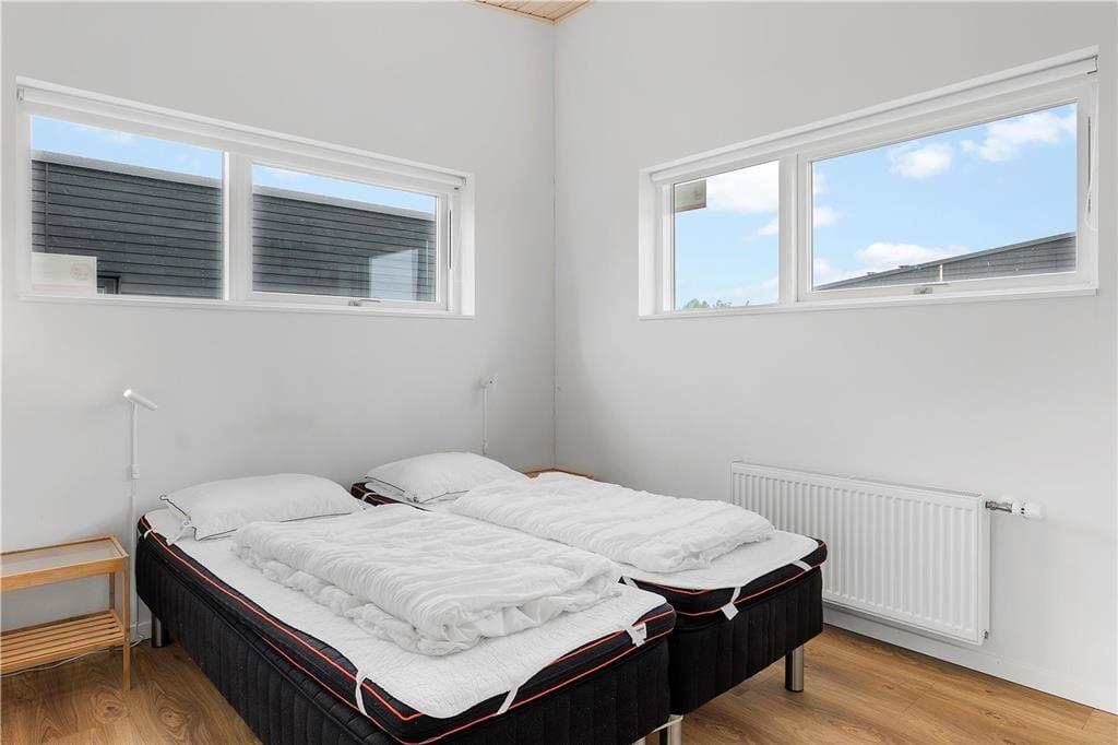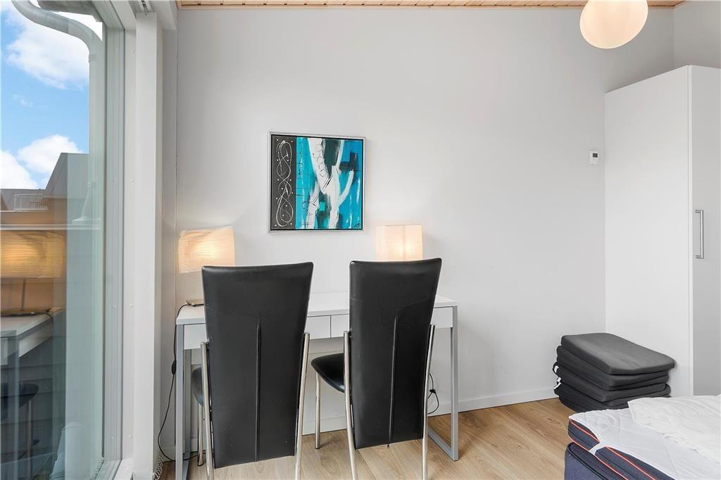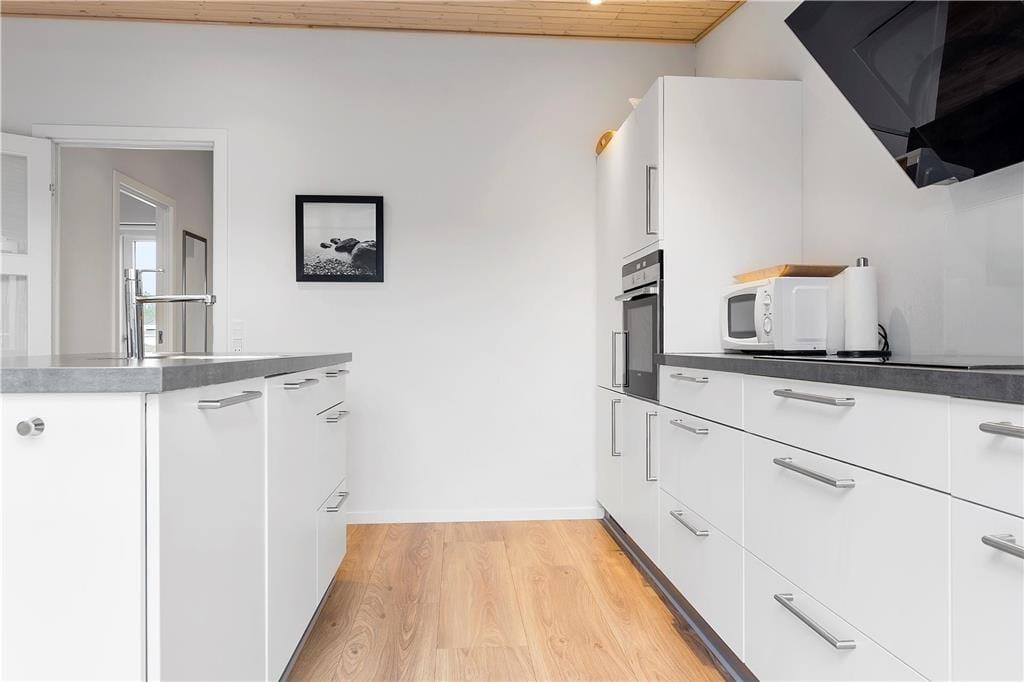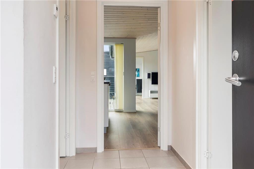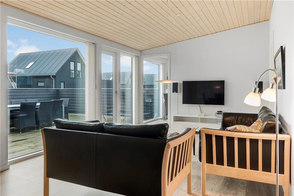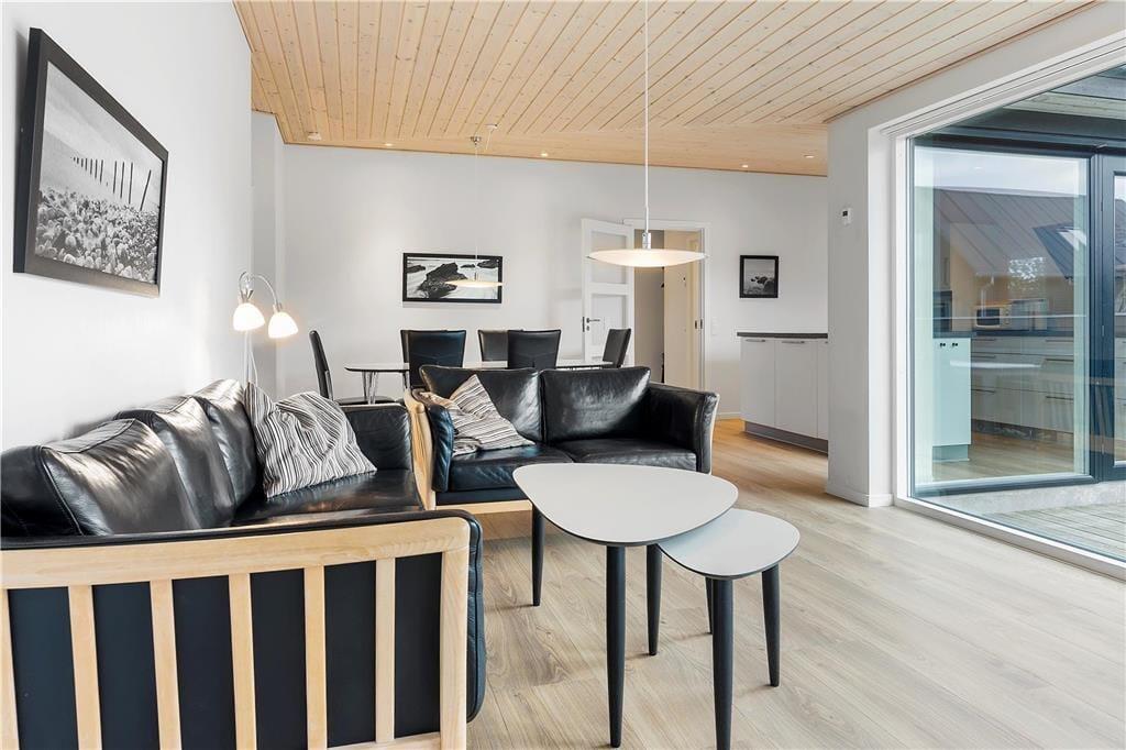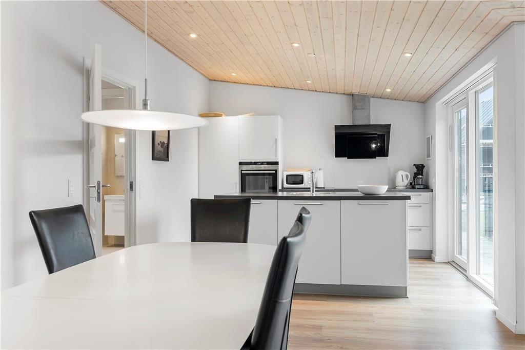 Ferieboligen hører til ”Havhusene” – en samling af flotte og moderne huse, som Ginnerups Tegnestue står bag. Netop dette eksemplar er opført i 2014, og det er et harmonisk og enkelt byggeri, der er fuld af velgennemtænkte boligløsninger og luksuriøst design. Planløsningen byder på fire soveværelser, som i alt kan huse syv overnattende personer. Badeværelser er der to af, hvoraf det største på luksuriøs vis er udstyret med en topersoners spa og sauna. Husets samlingspunkt er et lyst og lækkert opholdsrum, hvor stue og køkken er forenet. Køkkenet er veludstyret med gode hårde hvidevarer, så du har en dejlig arbejdsstation, når der skal kokkereres. De færdige måltider kan serveres ved spisebordet, og når der skal slappes af, kan du slænge dig i den behagelige sofaafdeling – evt. med en god film på fladskærmen.