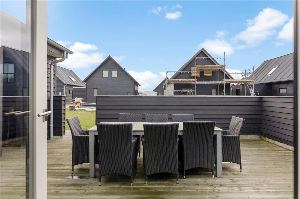 Afslapning er der bestemt også gjort plads til ude i det fri. Her ligger nemlig en stor terrasse, som vender godt i forhold til solen. Det er et skønt sted at dække op til sommerfrokost ved bordet, og bagefter kan du tage en velfortjent middagslur i liggestolen. Under overdækningen står der desuden et lille udekøkken i form af et bord med håndvask.
