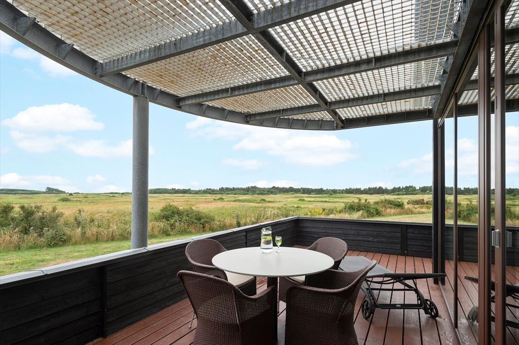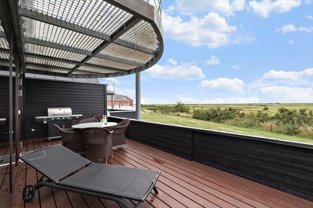 Udsigten bliver bestemt ikke ringere, når du træder ud i det fri på førstesalens altan eller stueplanets store terrasse. Ikke mindst fra førstesalen kan du skue langt ud over det vidtstrakte landskab og betragte færgen, der sejler mellem Rømø og Sild på den anden side af diget. Ligesom altanen er terrassen sydvendt og derfor solrig en stor del af dagen, og en del af den er endda afskærmet mod tre sider. Herudover finder du en skøn overdækket terrasse med spisebord og udekøkken, og der er gasgrill til rådighed.