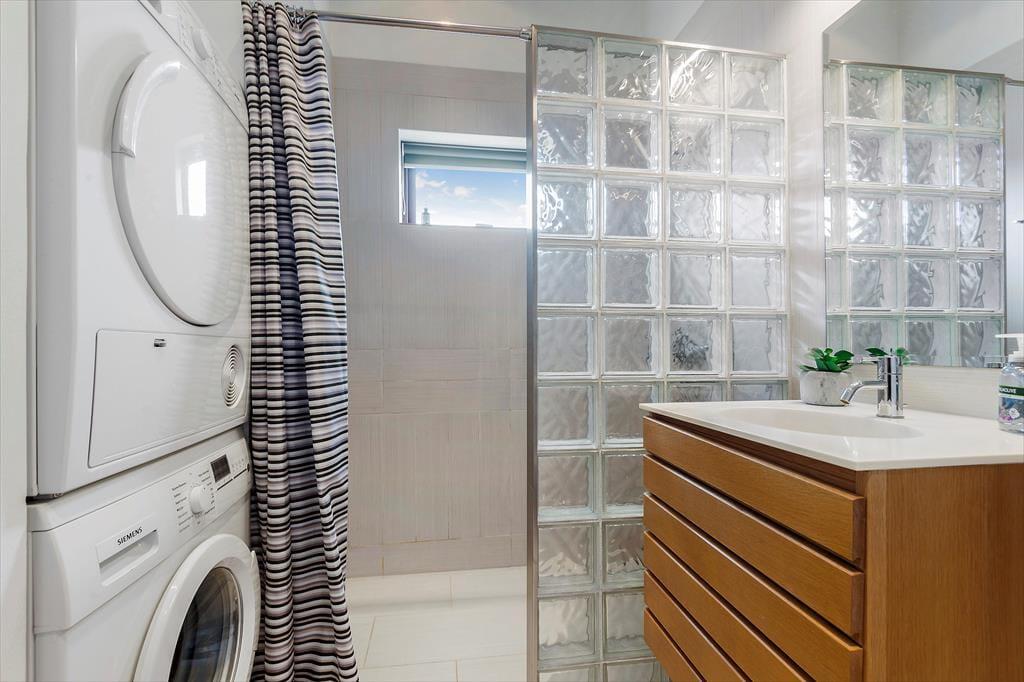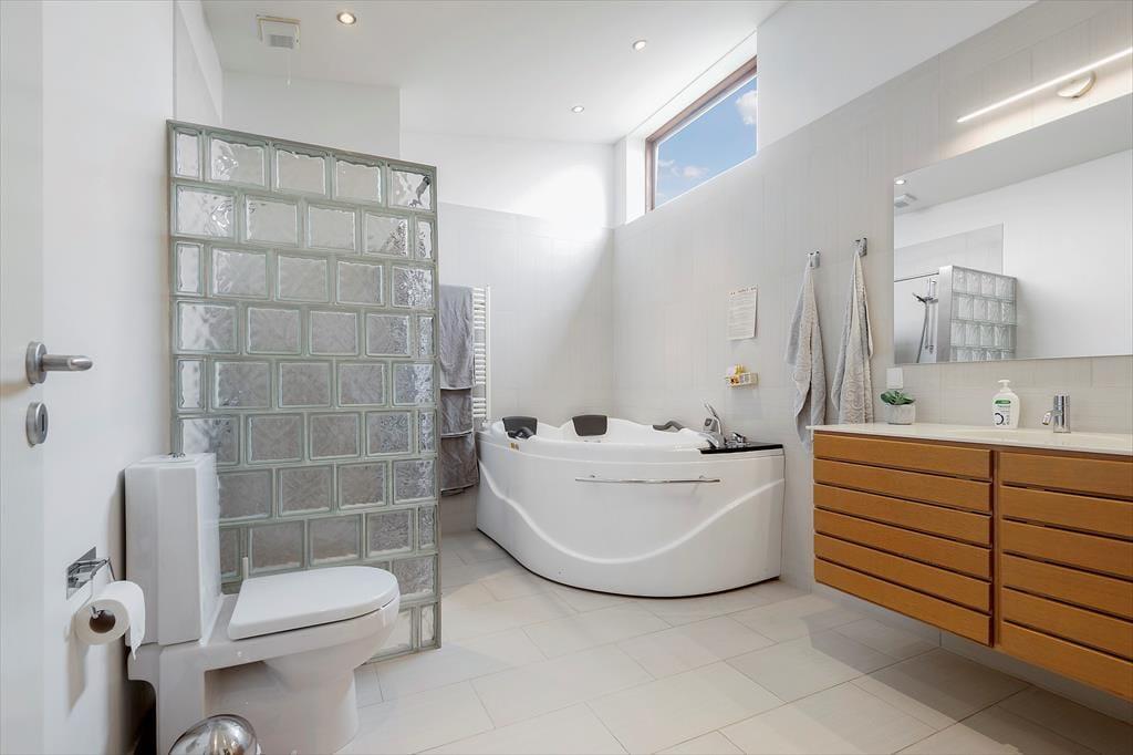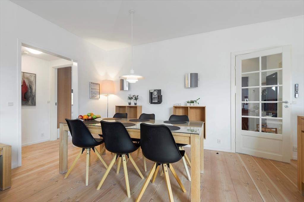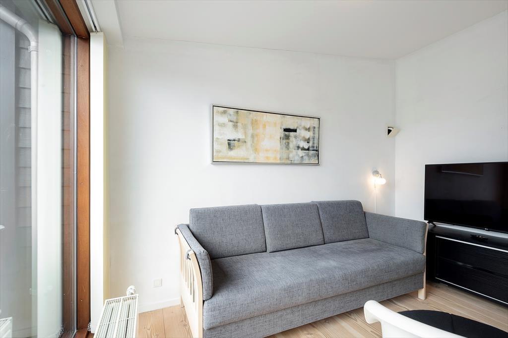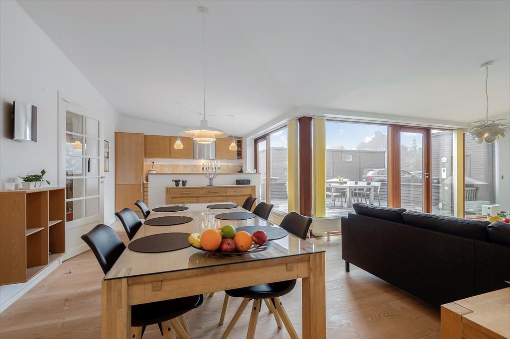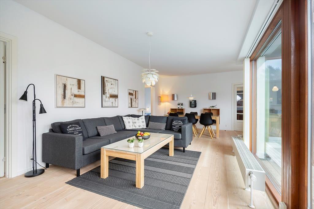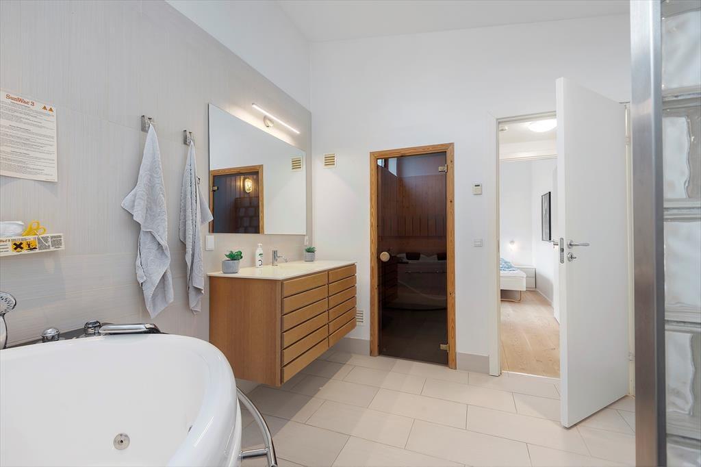De to badeværelser er også komfortabelt indrettet: Begge rum har gulvvarme og brusefaciliteter, og på det største kan du nyde livet med en tur i sauna og spabad. Endelig er opholdsrummet et skønt samlingspunkt, for her er der både sofaafdeling, spisebord og køkken.