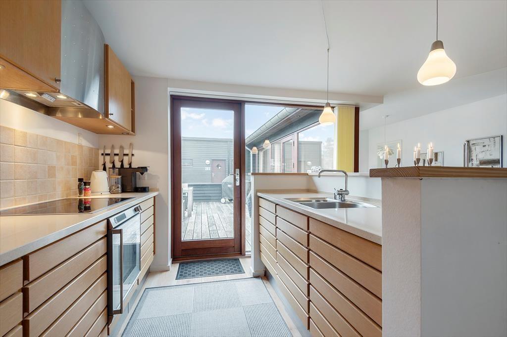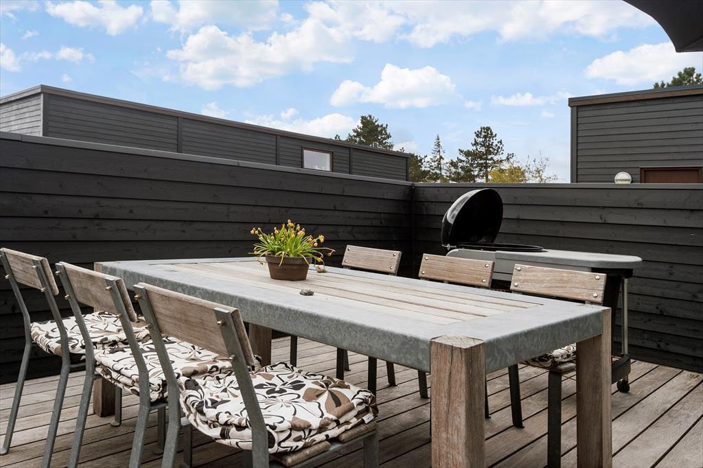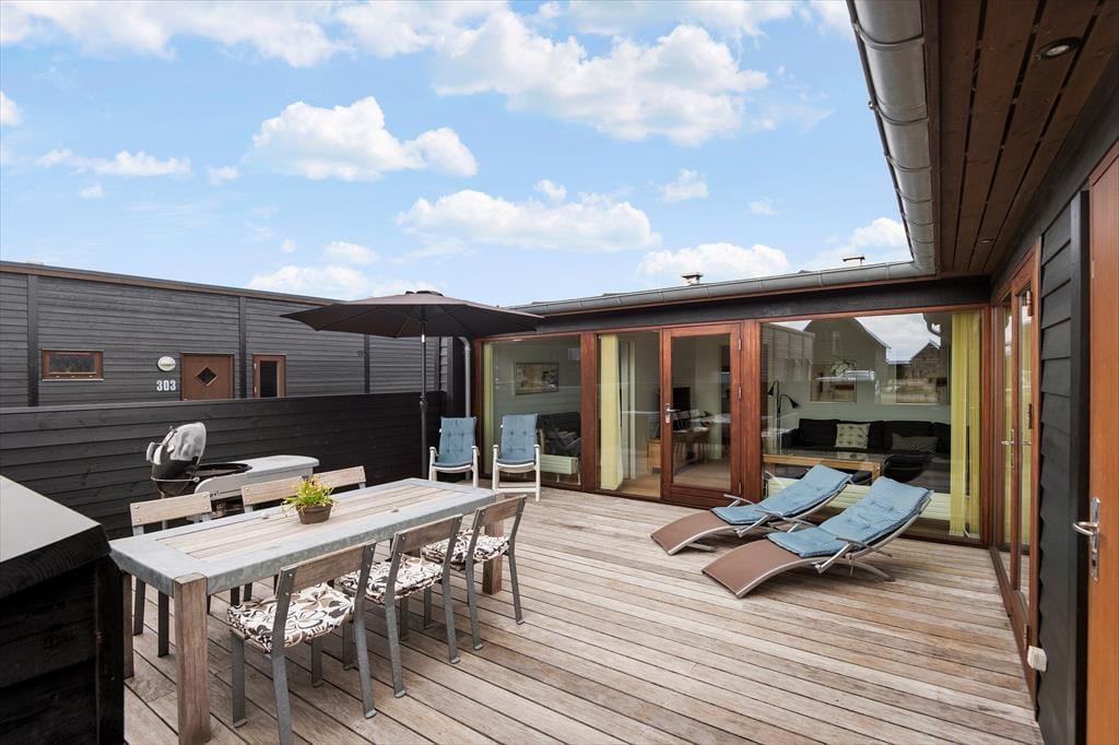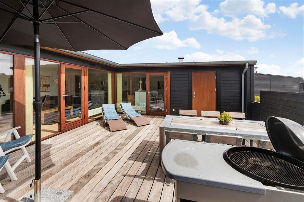Fra køkkenet og stuen kan du træde direkte ud på den store terrasse, som er udstyret med gode havemøbler, liggestole, grill og parasol. Terrassen vender mod sydvest og har derfor perfekte solforhold en stor del af dagen.