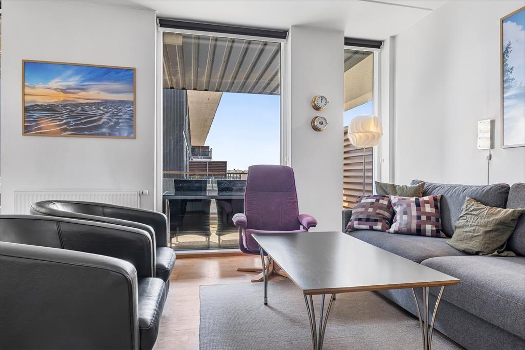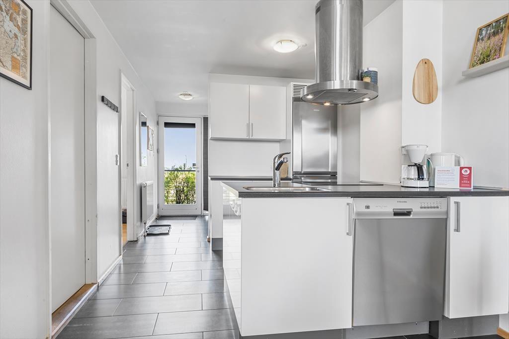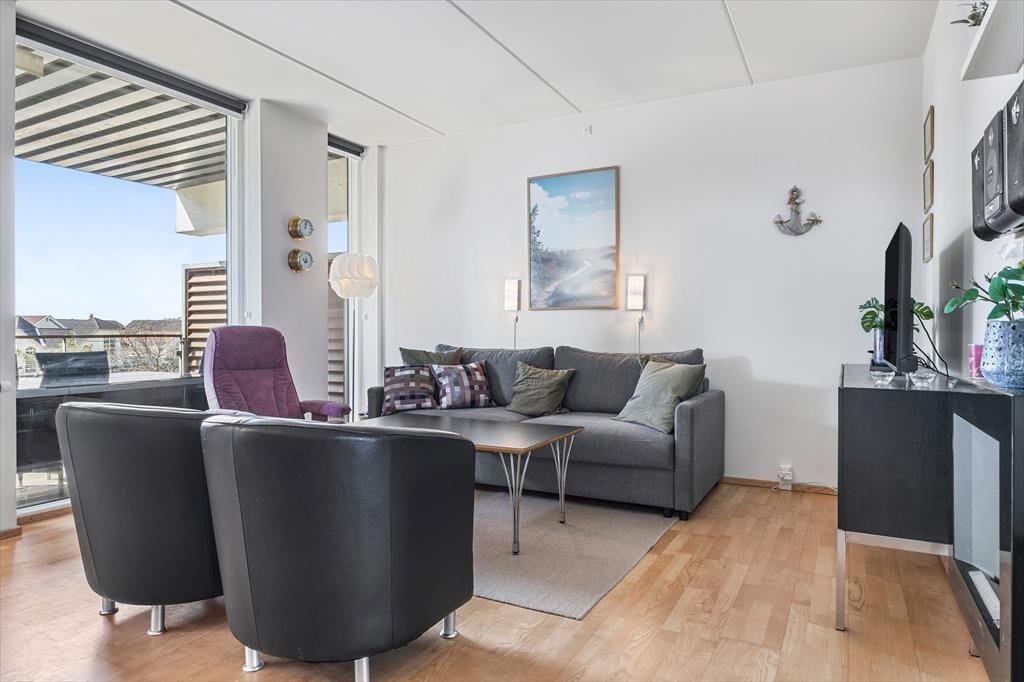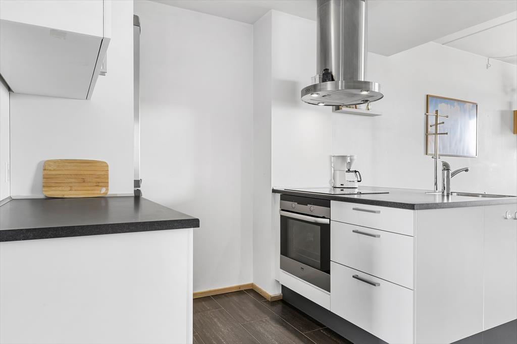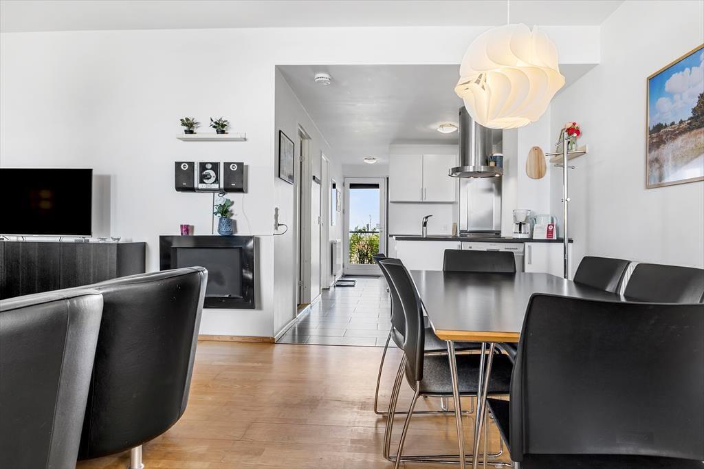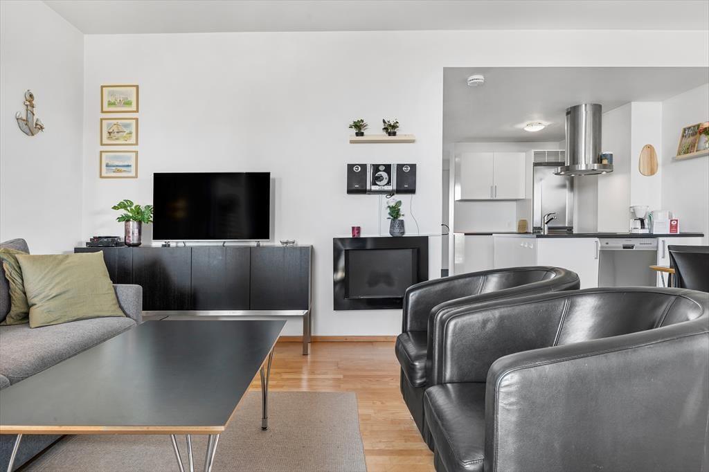 Lejlighedens stue er et skønt opholdsrum med en lys og indbydende atmosfære – ikke kun på grund af de høje vinduers gennemstrømmende lysindfald, men også takket være den stilfulde indretning. Et veludstyret køkken ligger i åben forbindelse med stuen, hvor I kan hygge jer sammen omkring spisebordet eller slænge jer i den komfortable sofaafdeling nær biopejsen. Sofaen er for øvrigt en sovesofa til to personer, så den fungerer som supplement til soveværelsets dobbeltseng. Foruden opholdsrum og soveværelse byder planløsningen på et flot badeværelse med bruseniche. Værd at nævne er desuden, at der er vaskemaskine og tørretumbler i entréen, og som en behagelig detalje er der gulvvarme på badeværelset.