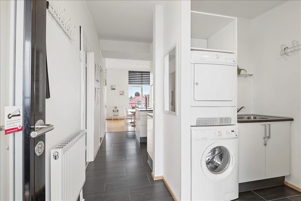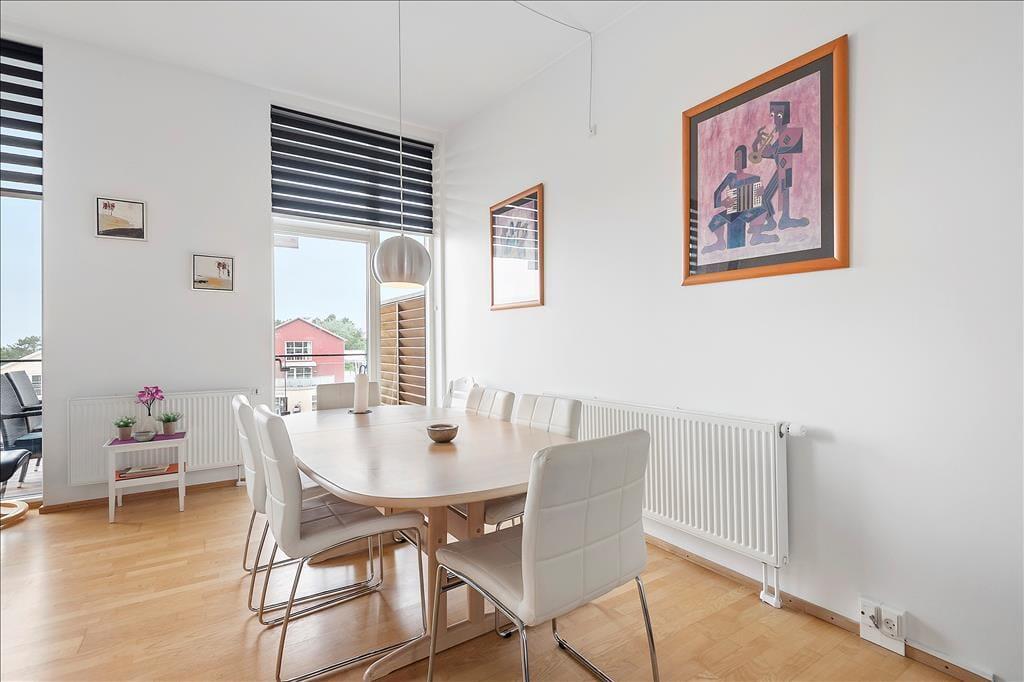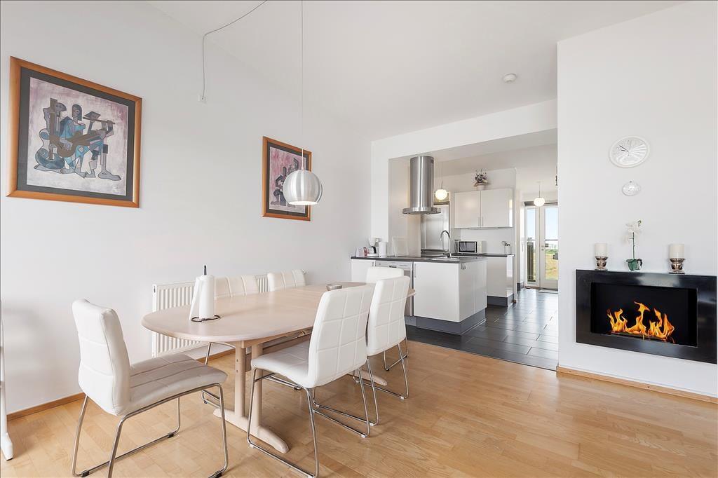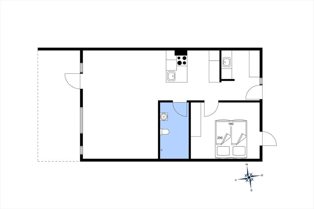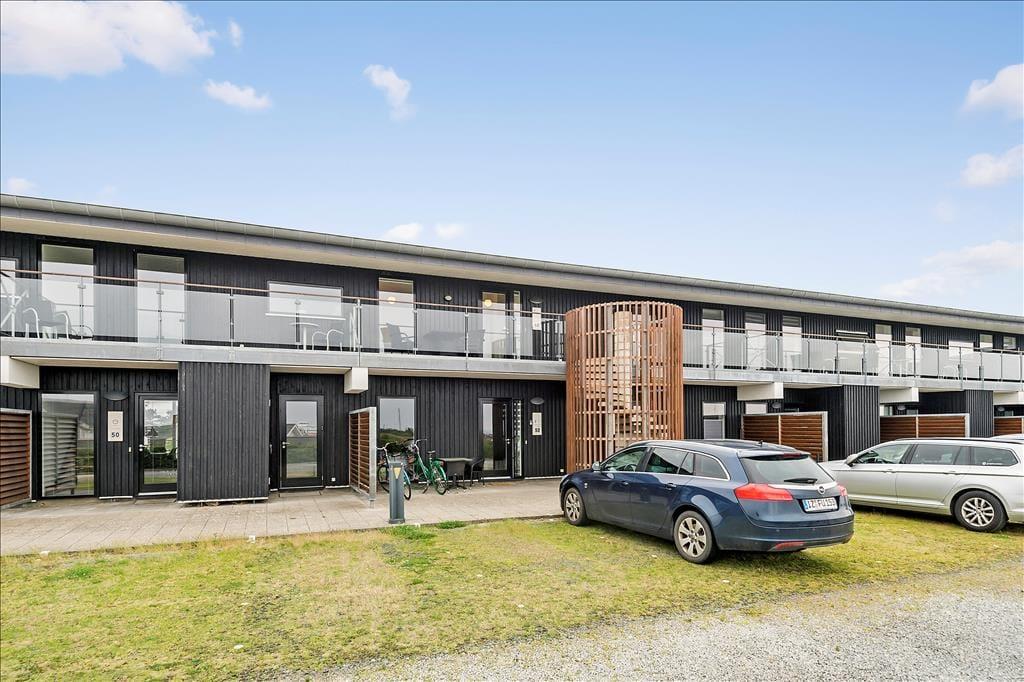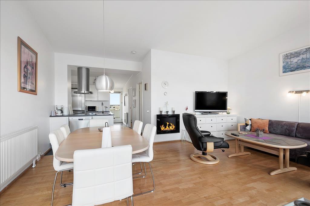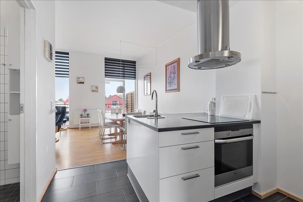 Lejligheden måler 62 m², som blandt andet byder på et soveværelse med dobbeltseng, en entré med vaskemaskine og tørretumbler samt et badeværelse, der er udstyret med en lækker bruseniche. Størstedelen af kvadratmeterne er dog dedikeret til en herlig stue med integreret køkkenafdeling: Det er et lyst og luftigt rum, hvor du kan hygge dig med gode måltider omkring spisebordet og nyde rendyrket afslapning i sofaafdelingen. Biopejsen står klar til at skrue op for hyggen, og gennem de store vinduespartier kan du nyde den fine Havnebyudsigt helt hen til diget. Stuens sofa er for øvrigt en dobbelt sovesofa, så i alt kan lejligheden huse fire feriegæster.