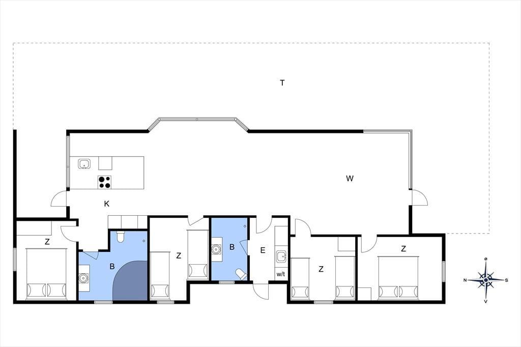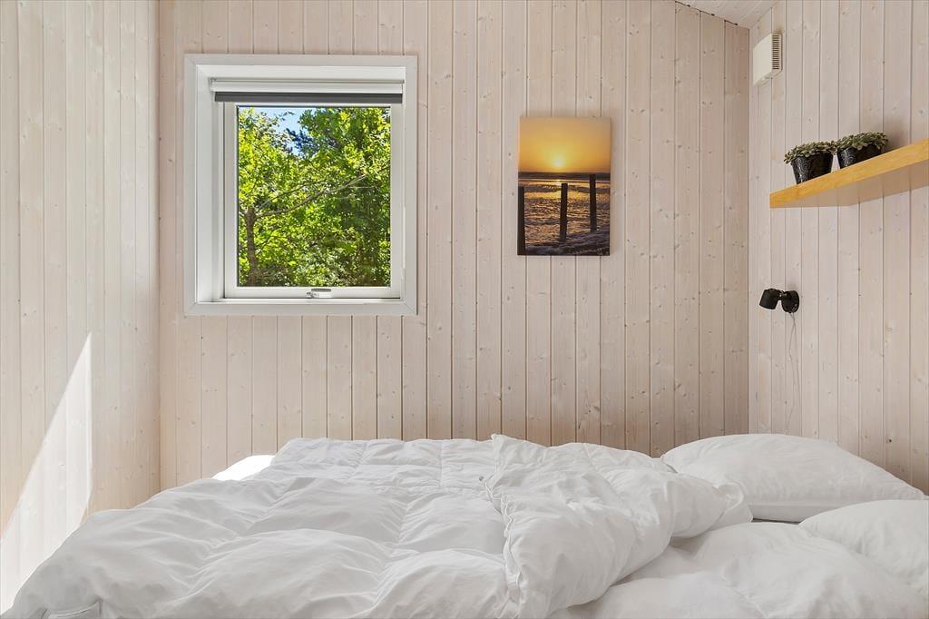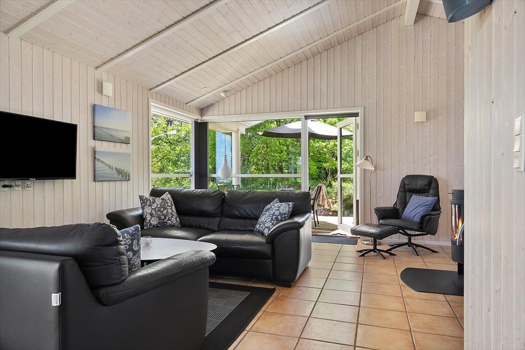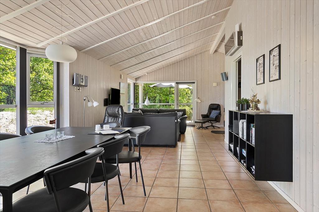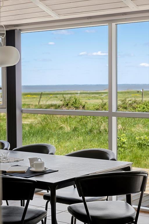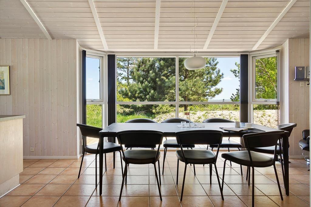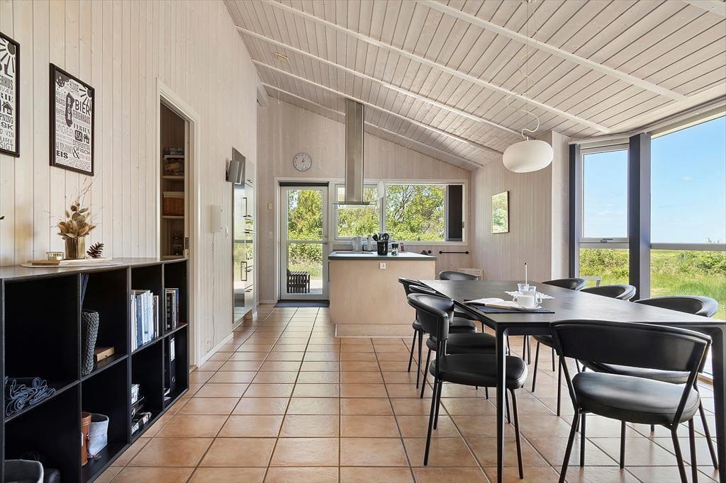 Sommerhuset, som er opført i 2009, er fuld af smarte detaljer, der gør ferielivet særdeles behageligt inden døre. Eksempelvis er det et topisoleret lavenergihus med jordvarmeanlæg og gulvvarme i alle rum, så det kan sagtens bruges hele året rundt. På kølige dage kan gulvvarmen suppleres af både brændeovn og varmepumpe, og når sommersolen skinner, kan varmepumpen køle huset ned. Desuden er det værd at bemærke, at dørbredden er 90 cm, så tilgængeligheden er god for kørestolsbrugere. Planløsningen er perfekt til otte personer: Her er fire soveværelser og to badeværelser, hvoraf det ene er udstyret med et dejligt spabad til to personer. Det sociale samlingspunkt er husets store opholdsrum, der består af stue og køkken i åben forbindelse. Rumfornemmelsen er virkelig behagelig, for her er højt til loftet og store vinduespartier, der inviterer dagslyset og Vadehavsudsigten indenfor.