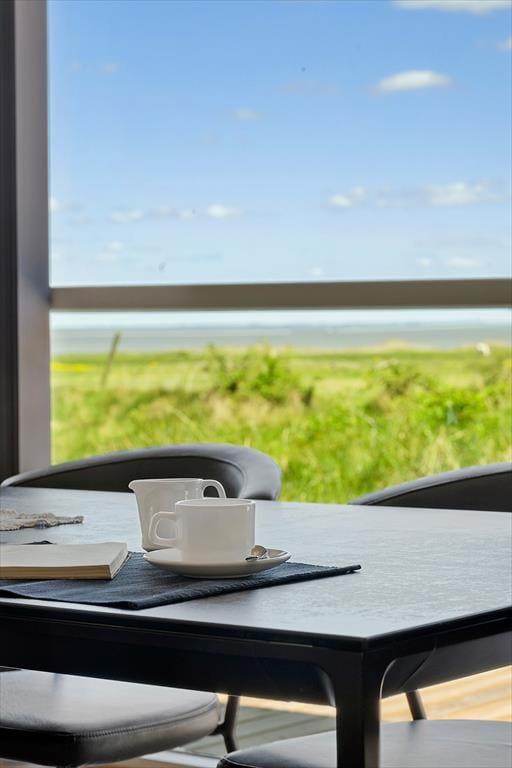 Komforten er helt i top i dette helårsanvendelige sommerhus, der er smagfuldt indrettet med alskens former for moderne bekvemmeligheder. Og så er beliggenheden mindst lige så skøn som selve huset, for gennem de store vinduer kan du skue lige ud over Vadehavet og Rømøs østlige kyststrækning.