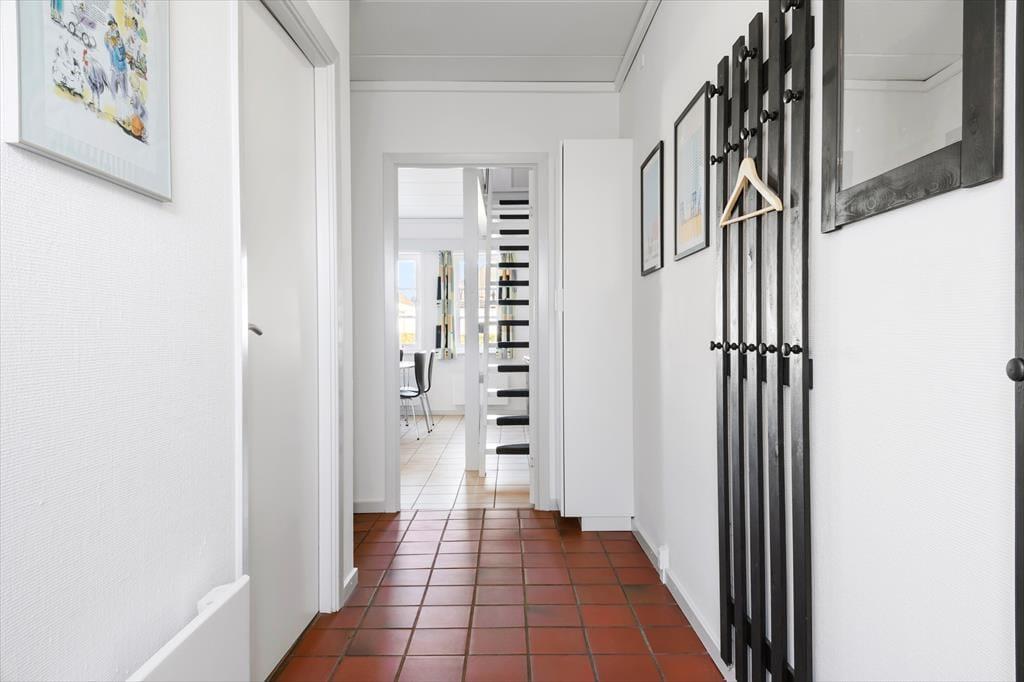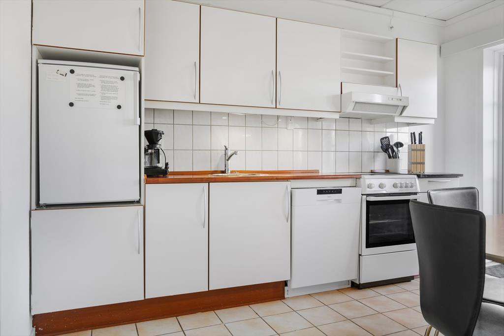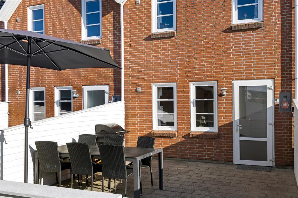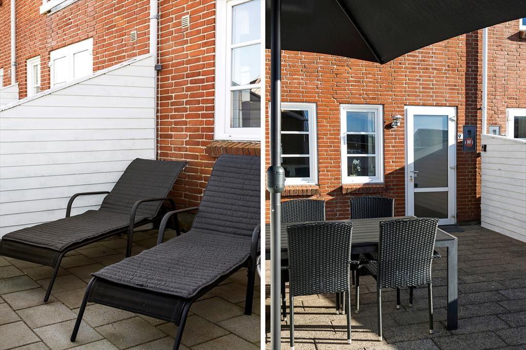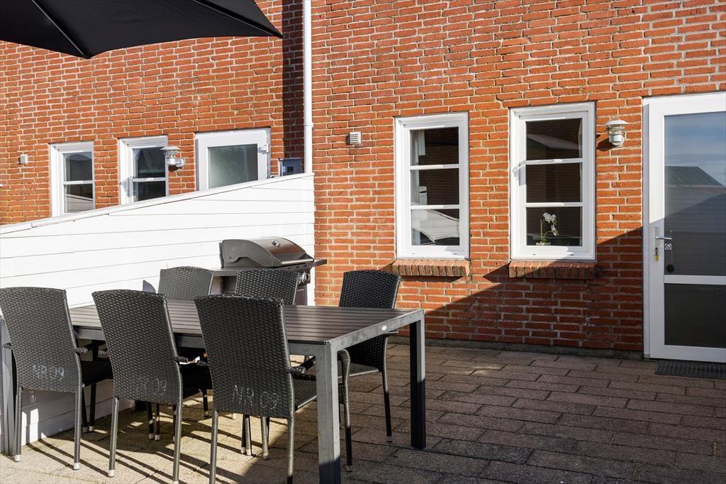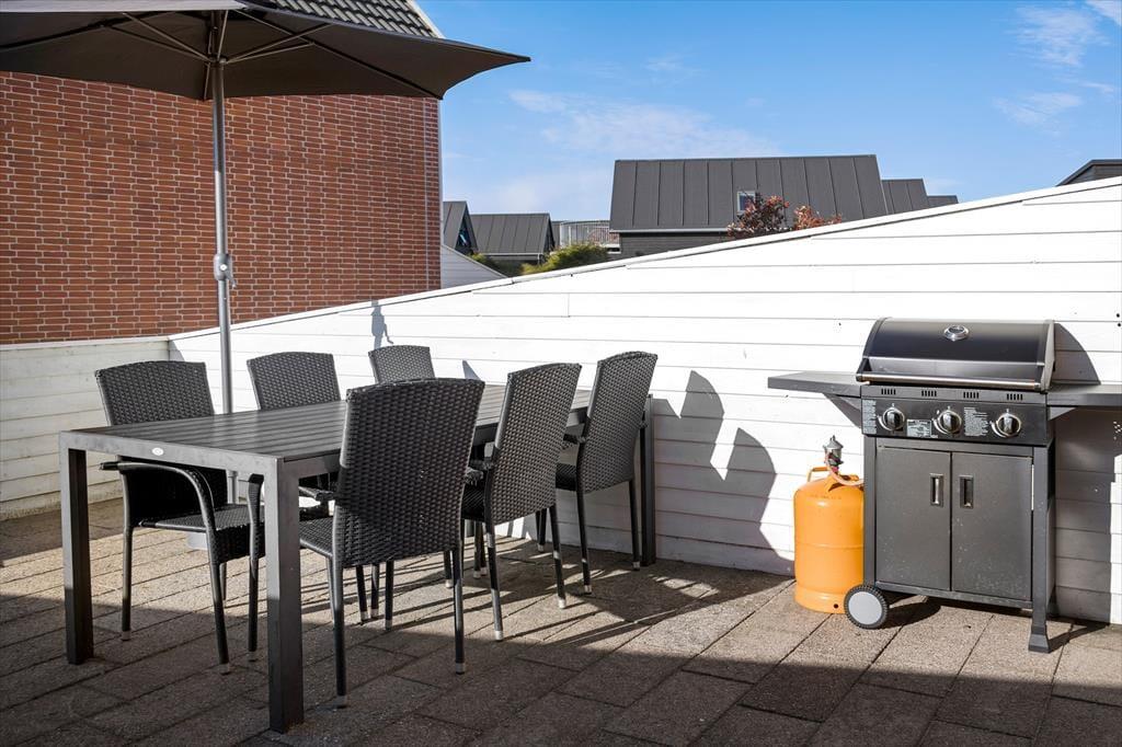 Udenfor venter en indhegnede terrasse med havemøbler og grill, som danner rammerne for mange hyggelige stunder i solen. Her kan I nyde duften af grillmad, mens børnene kan lege frit på den store legeplads på fællesområdet. Den sikre indhegning af terrassen sørger for, at hundesnuderne og små børn ikke kan forsvinde ubemærket.