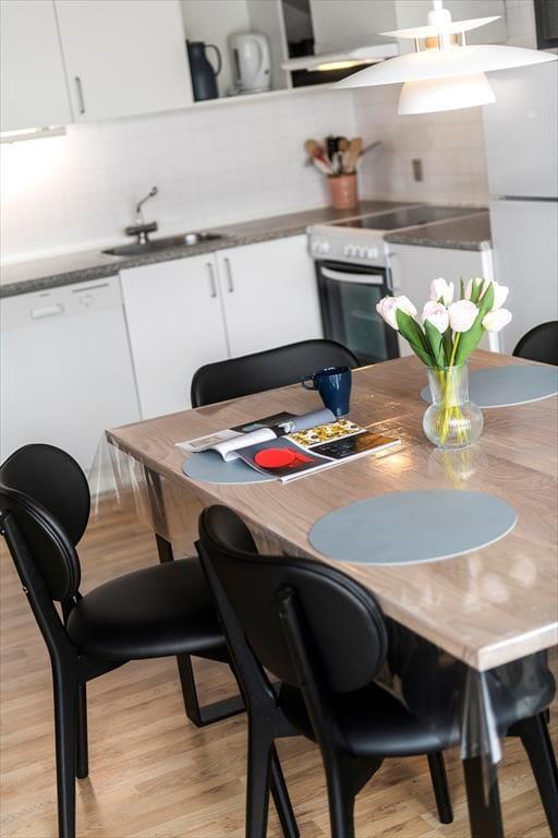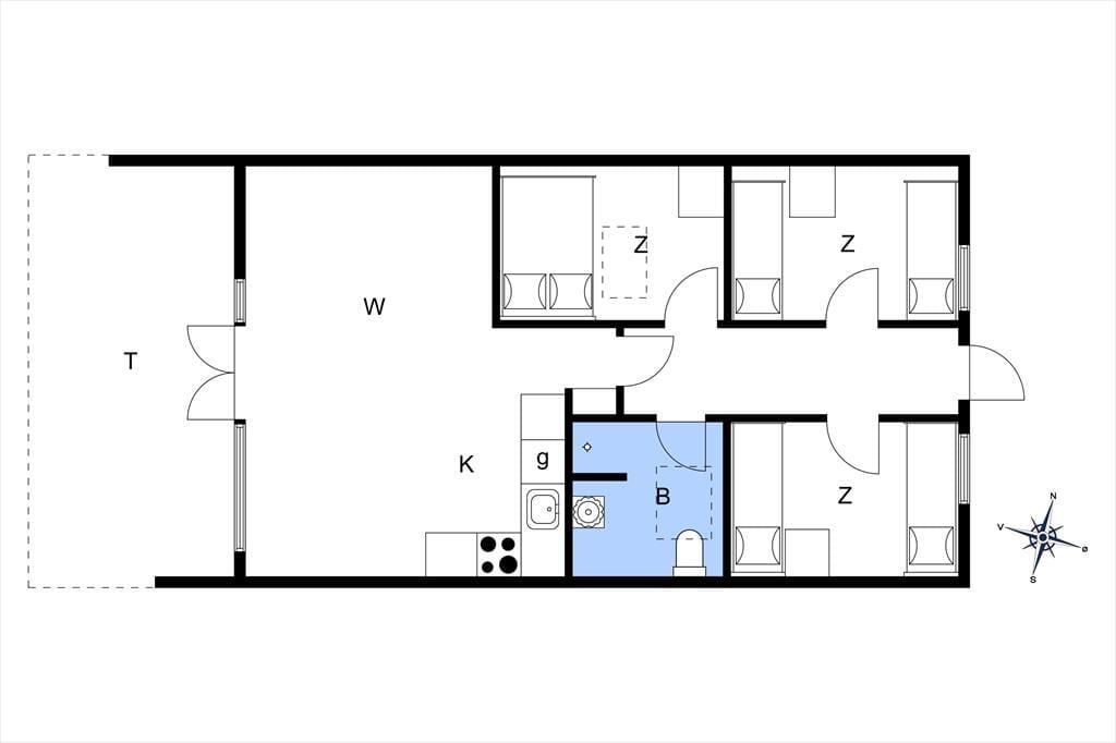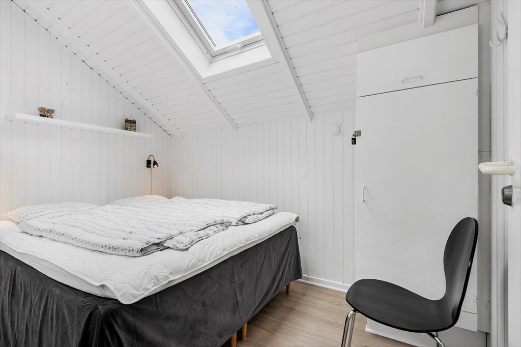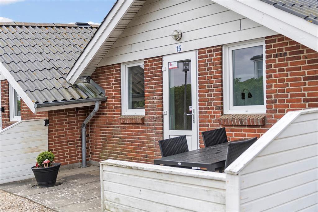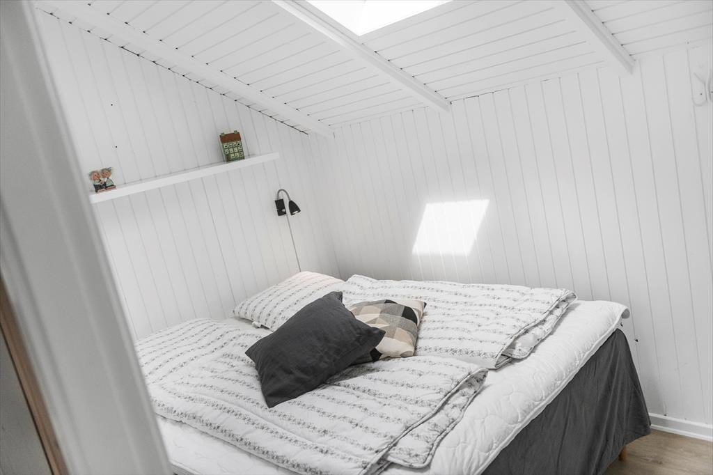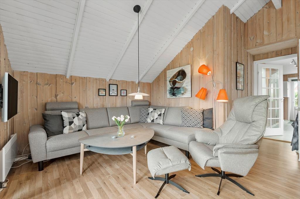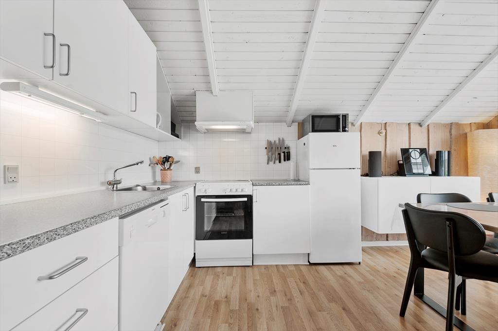 Kort fortalt er der tale om et rækkehus i ét plan på 64 m². Skal vi sætte lidt flere ord på, kan det beskrives som både pænt og velholdt med komfortable møbler og en hyggelig atmosfære. I stuen, som er husets største rum, er der loft til kip, lyse trælister på væggene og et stort, vestvendt vinduesparti i bedste sommerhusstil. Køkkenet er integreret med stuen, som blandt andet også rummer en dejlig sofaafdeling, hvor hele familien nemt kan slænge sig. Når det er sengetid, kan du gå til ro på husets tre soveværelser – efter du selvfølgelig lige har rundet badeværelset for at børste tænder.